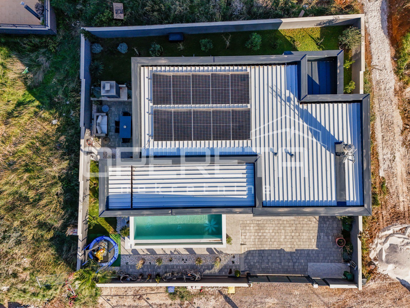 Prizemlje: Prostrani dnevni boravak, moderna kuhinja i blagovaonica, spavaća soba s kupaonicom, vanjska kuhinja i infinity pool.