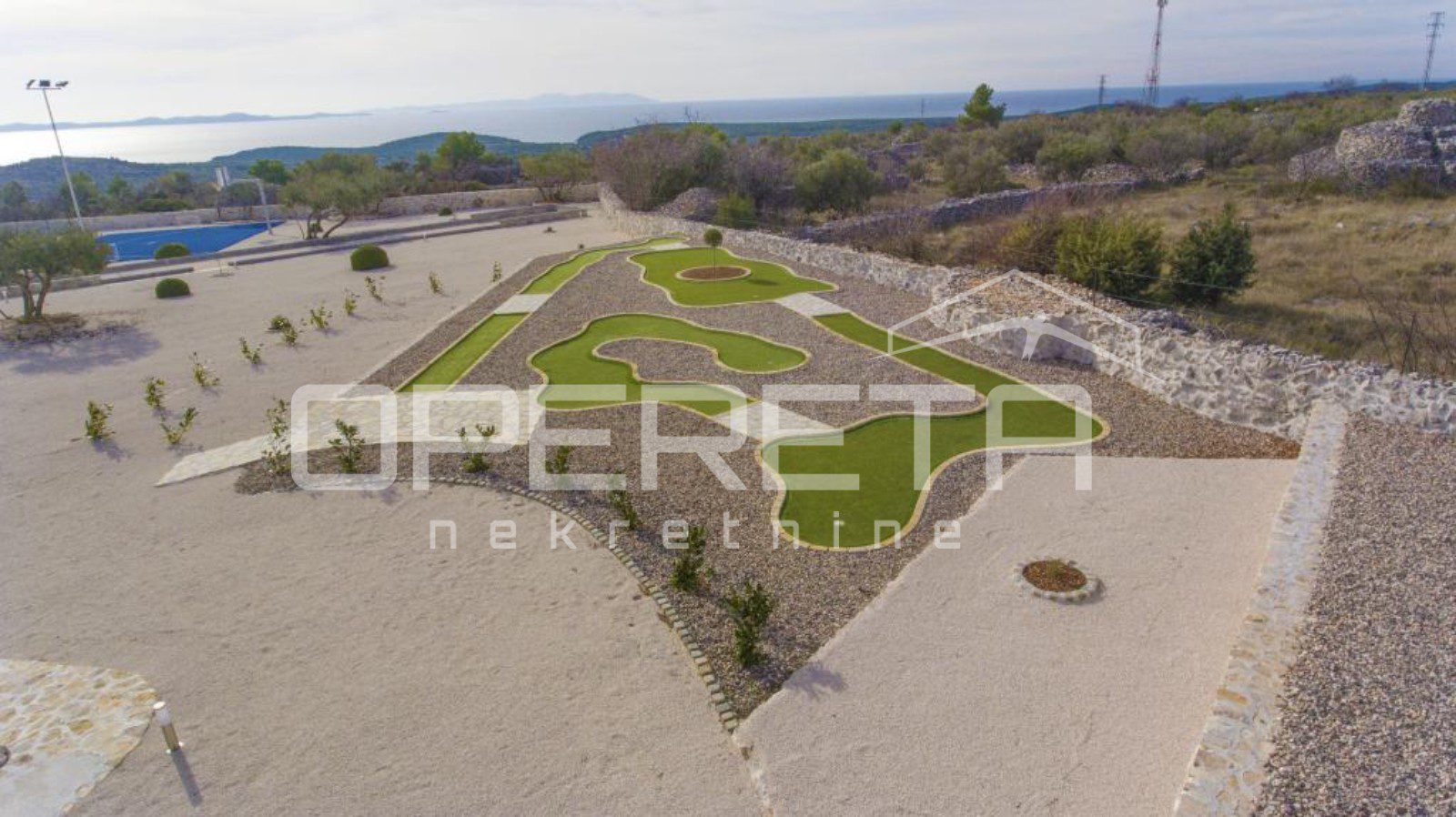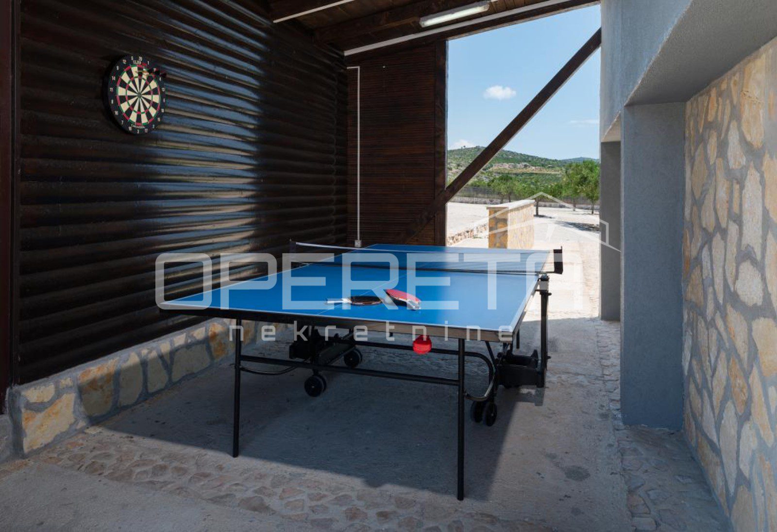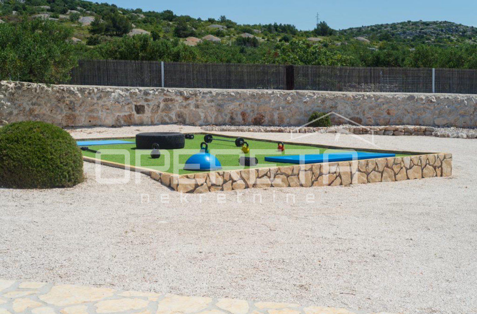 Posebna vrijednost ove nekretnine je okućnica, koja je pažljivo osmišljena i bogato opremljena. Vanjski dio obuhvaća bazen površine 32 m2, jacuzzi i finsku saunu, dva vanjska tuša te više zona za odmor i druženje. U sklopu imanja nalaze se padel teren, košarkaški teren, balotaški teren i mini golf, kao i vanjska teretana. Dodatni sadržaji uključuju stolni tenis, stolni nogomet, biljar, pikado i dječje igralište. Na raspolaganju su i dva vanjska kamina, ljetna kuhinja te vinski podrum, čime je cijeli prostor zaokružen kao samodostatna cjelina.