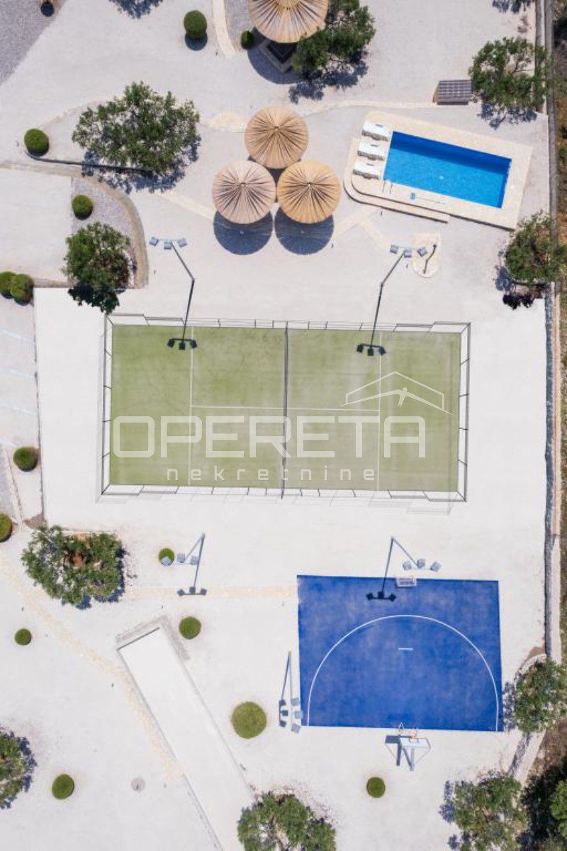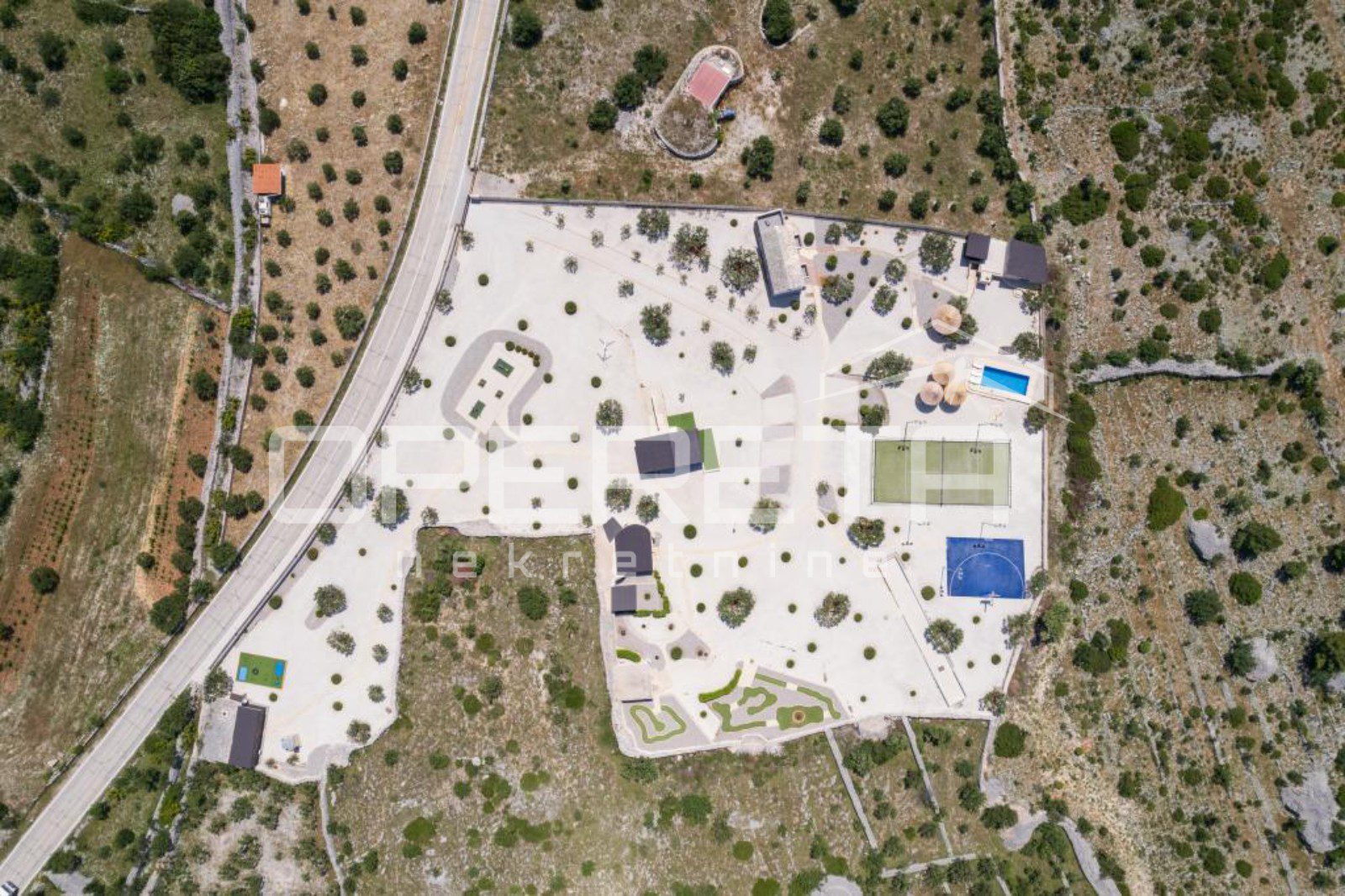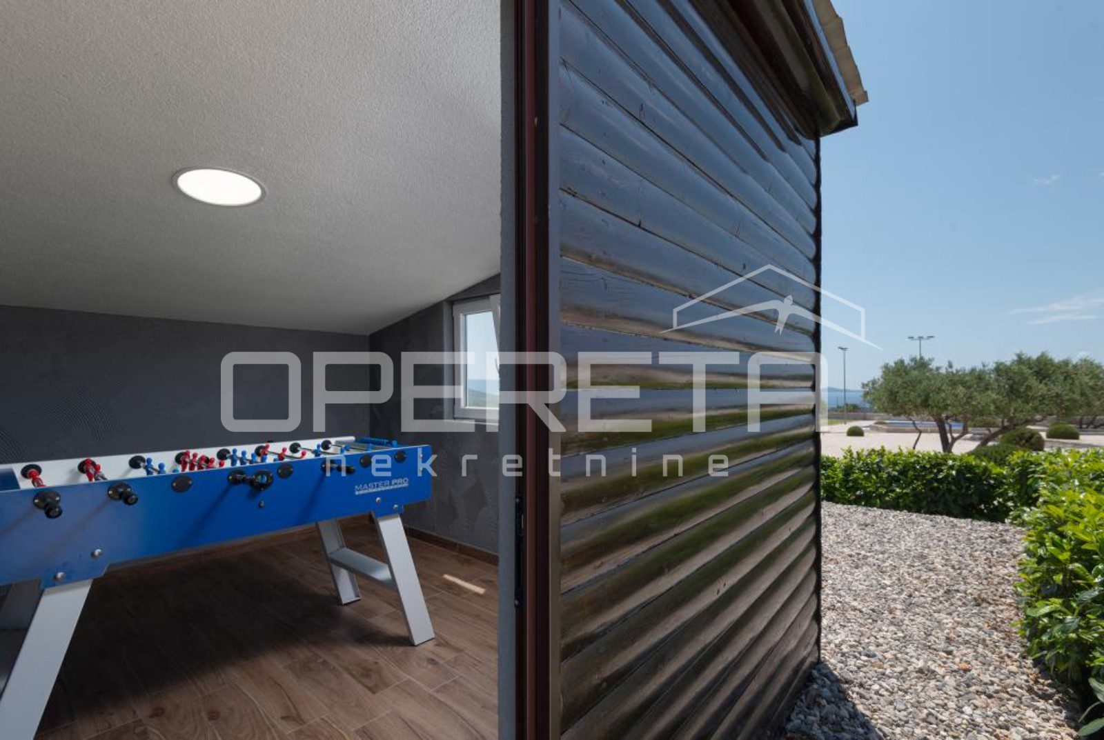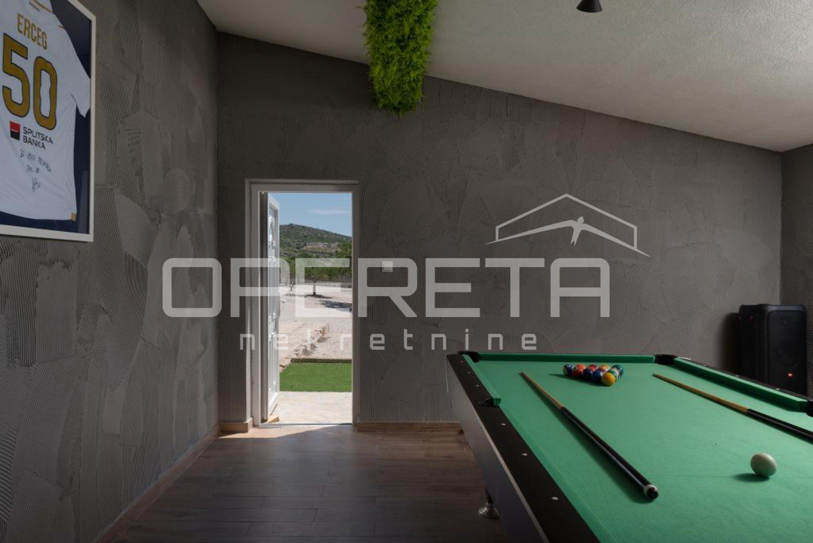 Posebna vrijednost ove nekretnine je okućnica, koja je pažljivo osmišljena i bogato opremljena. Vanjski dio obuhvaća bazen površine 32 m2, jacuzzi i finsku saunu, dva vanjska tuša te više zona za odmor i druženje. U sklopu imanja nalaze se padel teren, košarkaški teren, balotaški teren i mini golf, kao i vanjska teretana. Dodatni sadržaji uključuju stolni tenis, stolni nogomet, biljar, pikado i dječje igralište. Na raspolaganju su i dva vanjska kamina, ljetna kuhinja te vinski podrum, čime je cijeli prostor zaokružen kao samodostatna cjelina.
