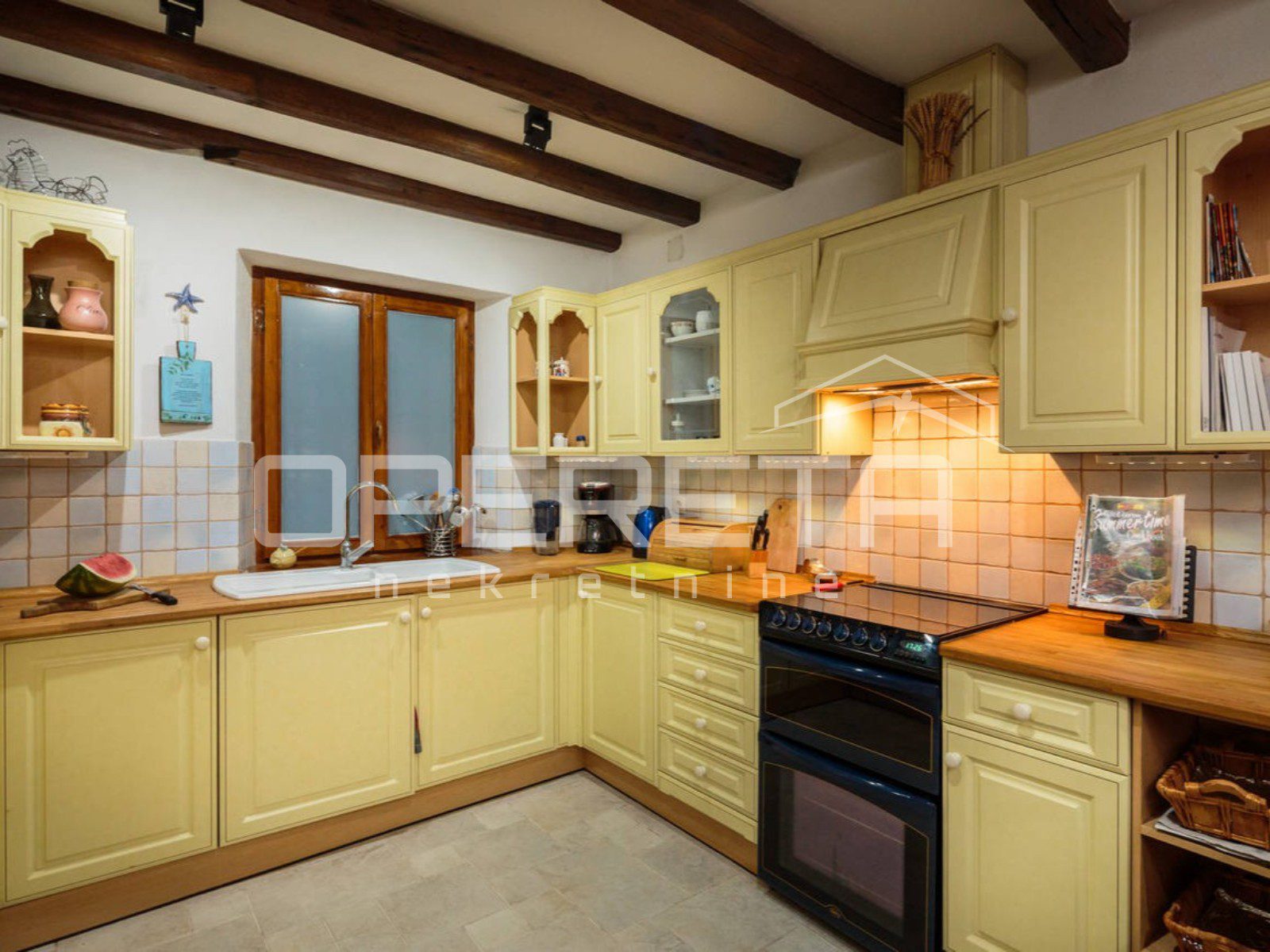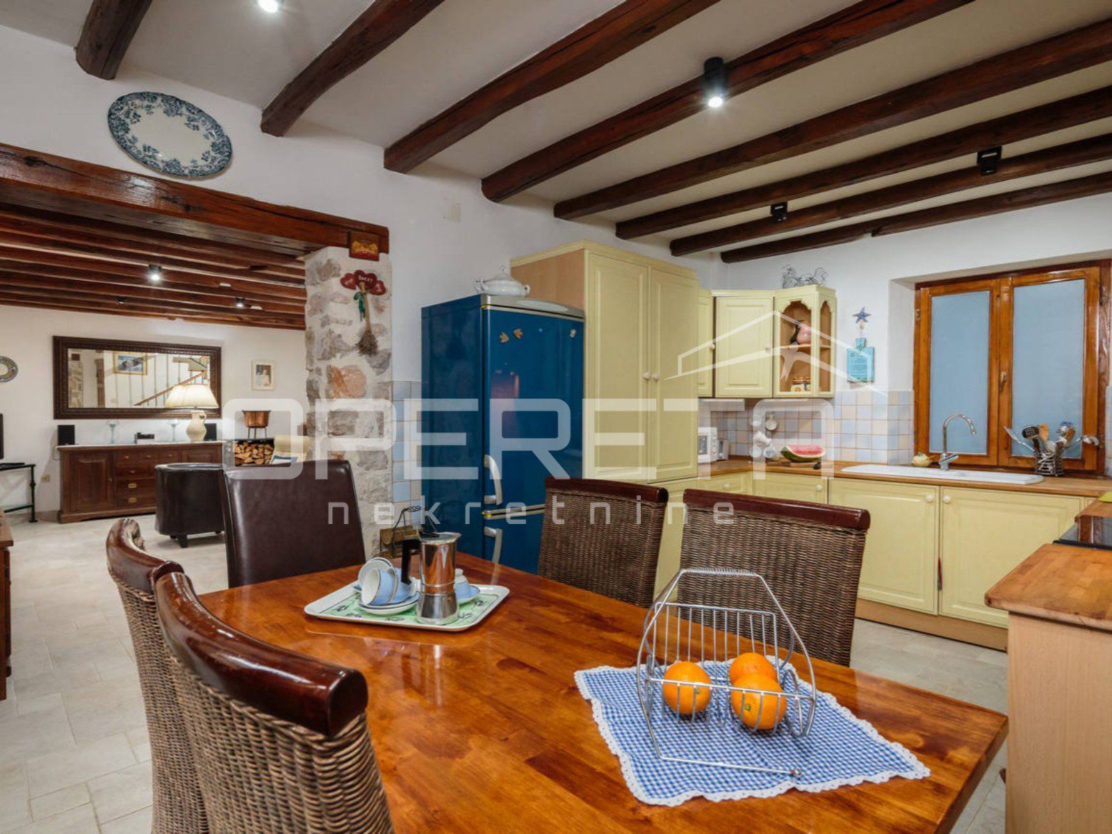 U prizemlju kuće nalazi se kuhinja s blagovaonicom te prostrani dnevni boravak s izlazom na uređeno popločano dvorište koje nudi intimu i prostor za druženje.