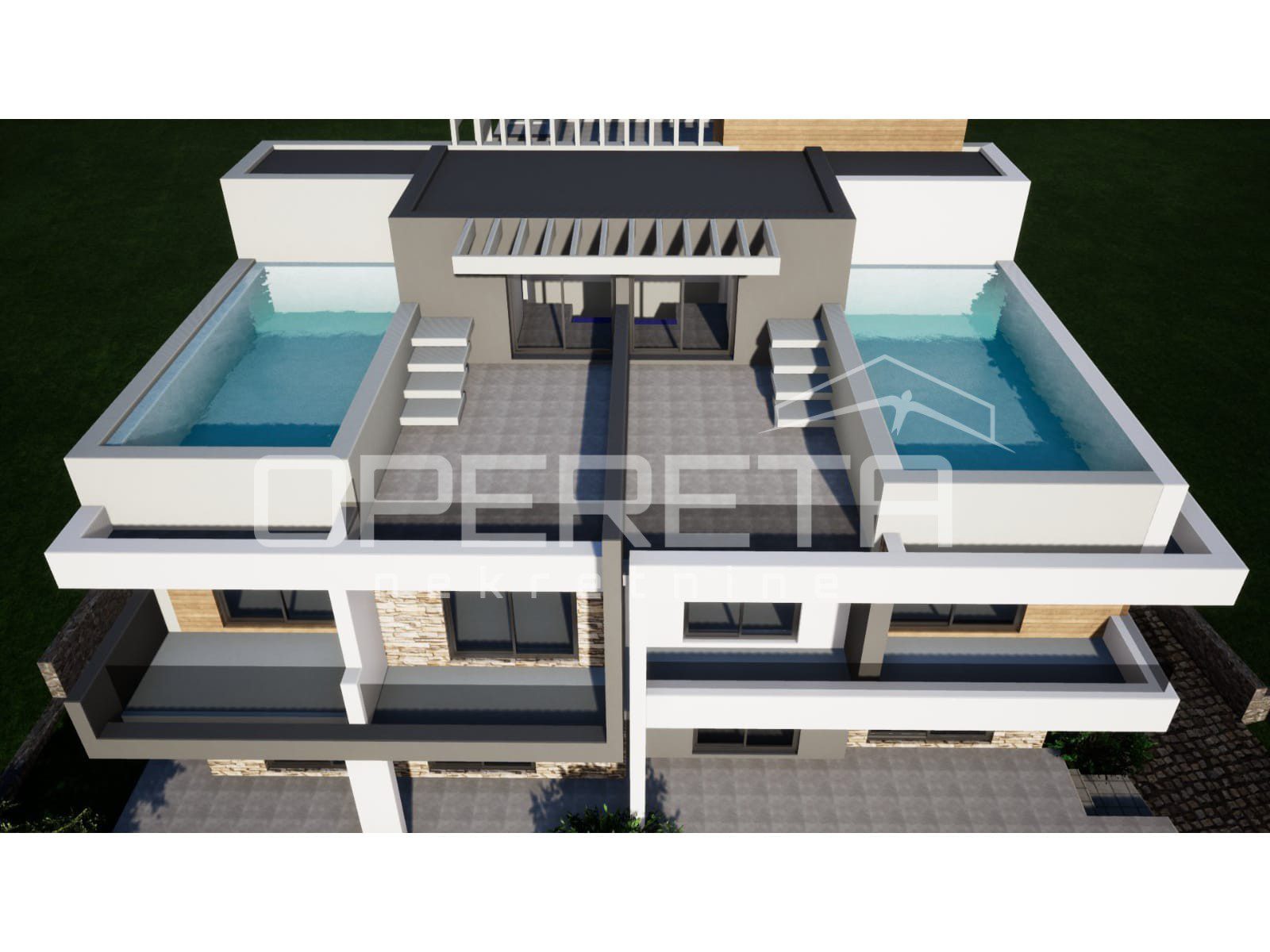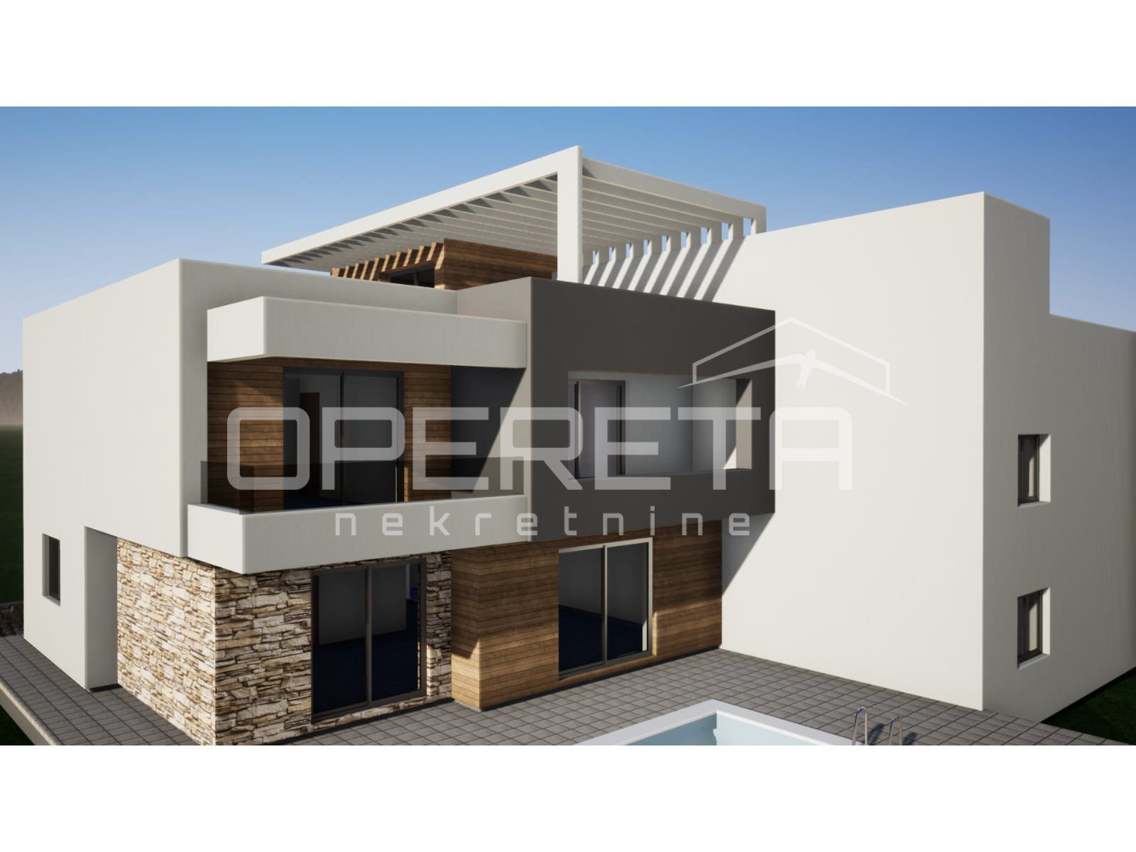S2 površine 174,28 m² prostire se na prizemlje i kat stambenog prostora, uz dodatak terase s bazenom na 2. katu zgrade.