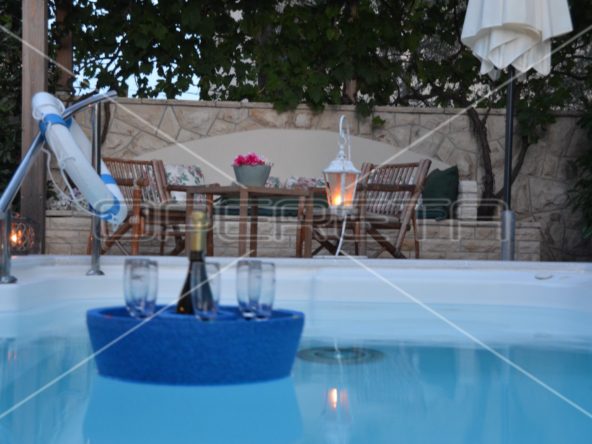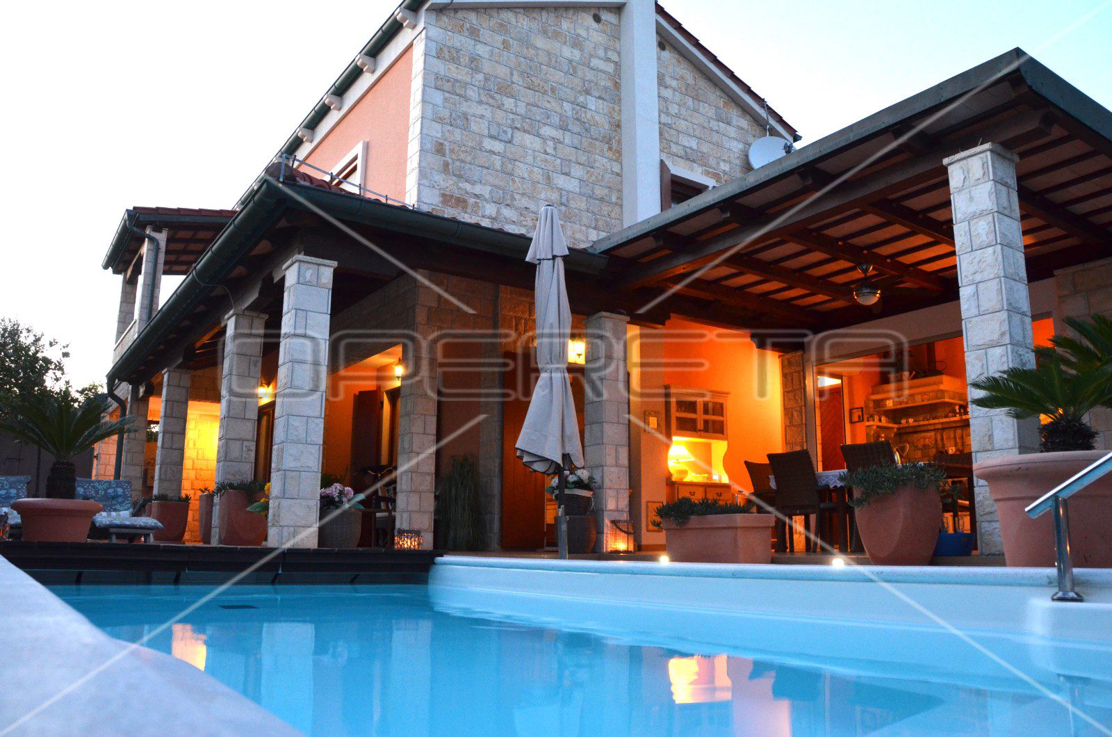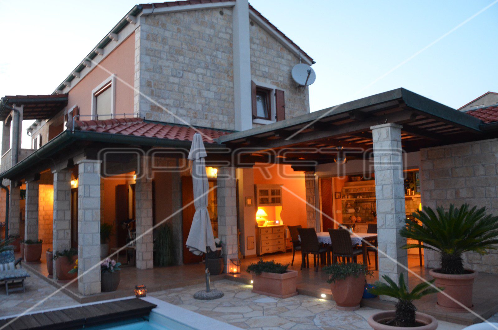 Jedinstvena, luksuzna i rustikalna vila, autohtonog dizajna i arhitekture, izgrađena 2010. g., ukupne površine od 197 m2 s uređenom i ograđenom okućnicom koja pruža mir i privatnost u blizini centra Novalje. Udaljena svega 250 m od glavnog trga te 350 m od mora i plaže. Razvedena u dvije etaže: donjom etažom prostire se dnevni boravak s kaminom i izlazom na terasu, blagovaonica s kuhinjom, velika prostorija za druženja, kupaonica te zaseban wc. Raskošnim stubištem povezana je gornjom etažom na kojoj se nalaze 3 spavaće sobe od kojih je jedna povezana s prostorom s jacuzzijem za 3 osobe, lođe, kupaonice s wc-om i hodnika. Kvalitetno građena pomno biranim detaljima i opremljena najkvalitetnijim materijalima, uređajima i talijanskim namještajem. Dnevni boravak u prizemlju komunicira s vanjskom natkrivenom terasom uz koju se nalaze ljetna kuhinja i prostorija s tušem. Prostor za uživanje nastavlja se u potpuno ograđenoj okućnici u kojoj se smjestio bazen veličine 3×5 m. Privatan luksuz u centru Novalje i blizini mora! Preporuka!