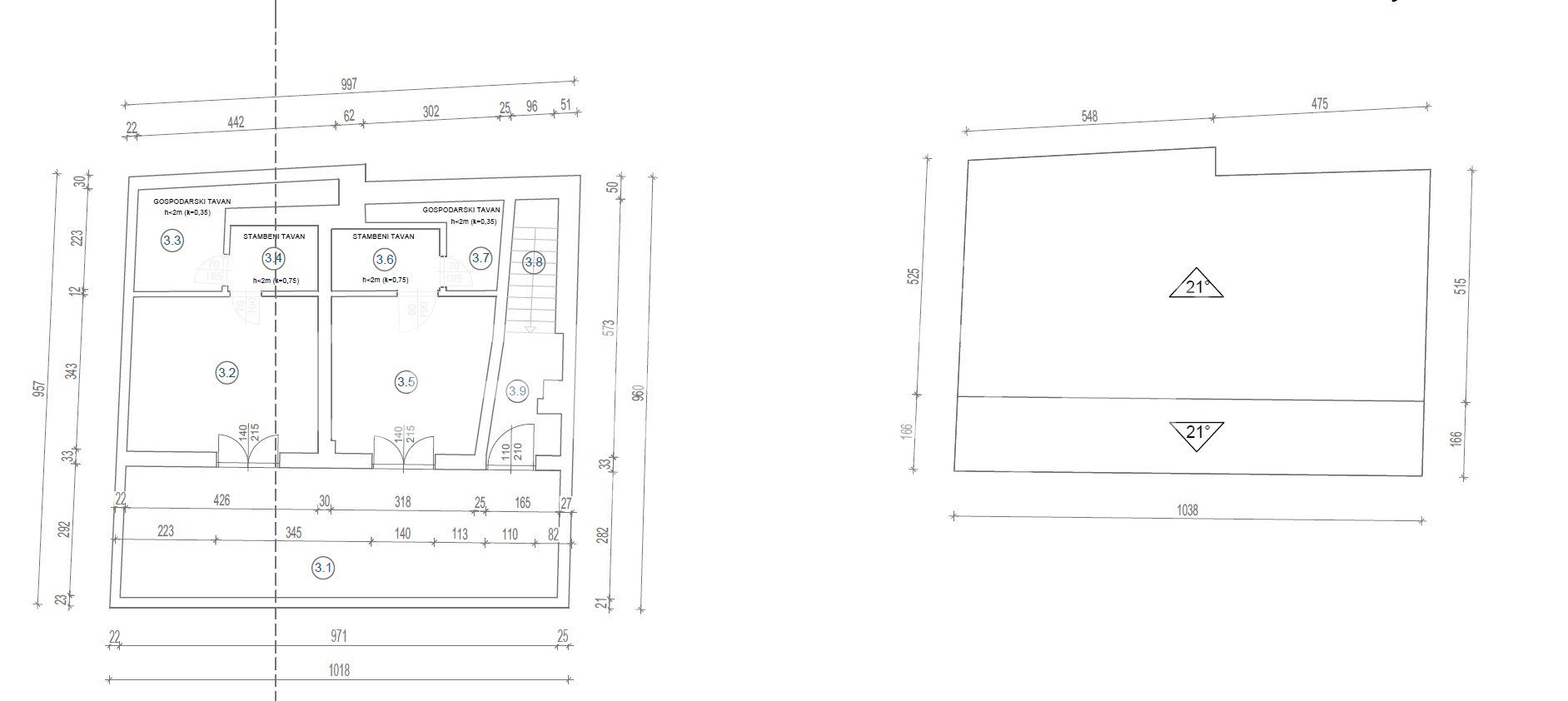 Trenutno prizemlje obuhvaća dnevni boravak, sobu, kupaonicu, spremište i hodnik koji unutarnjim stepenicama vodi na prvi kat.