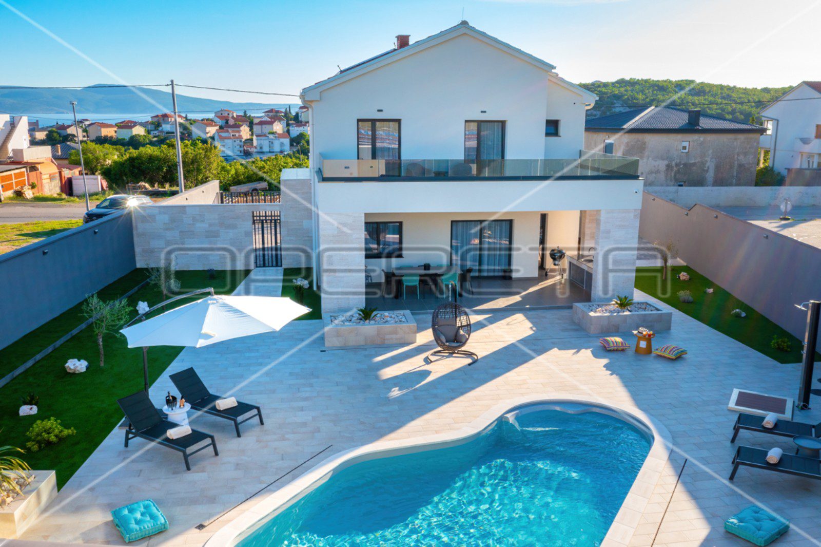 Na sredini dvorišta se nalazi prekrasan veliki bazen s ležaljkama.