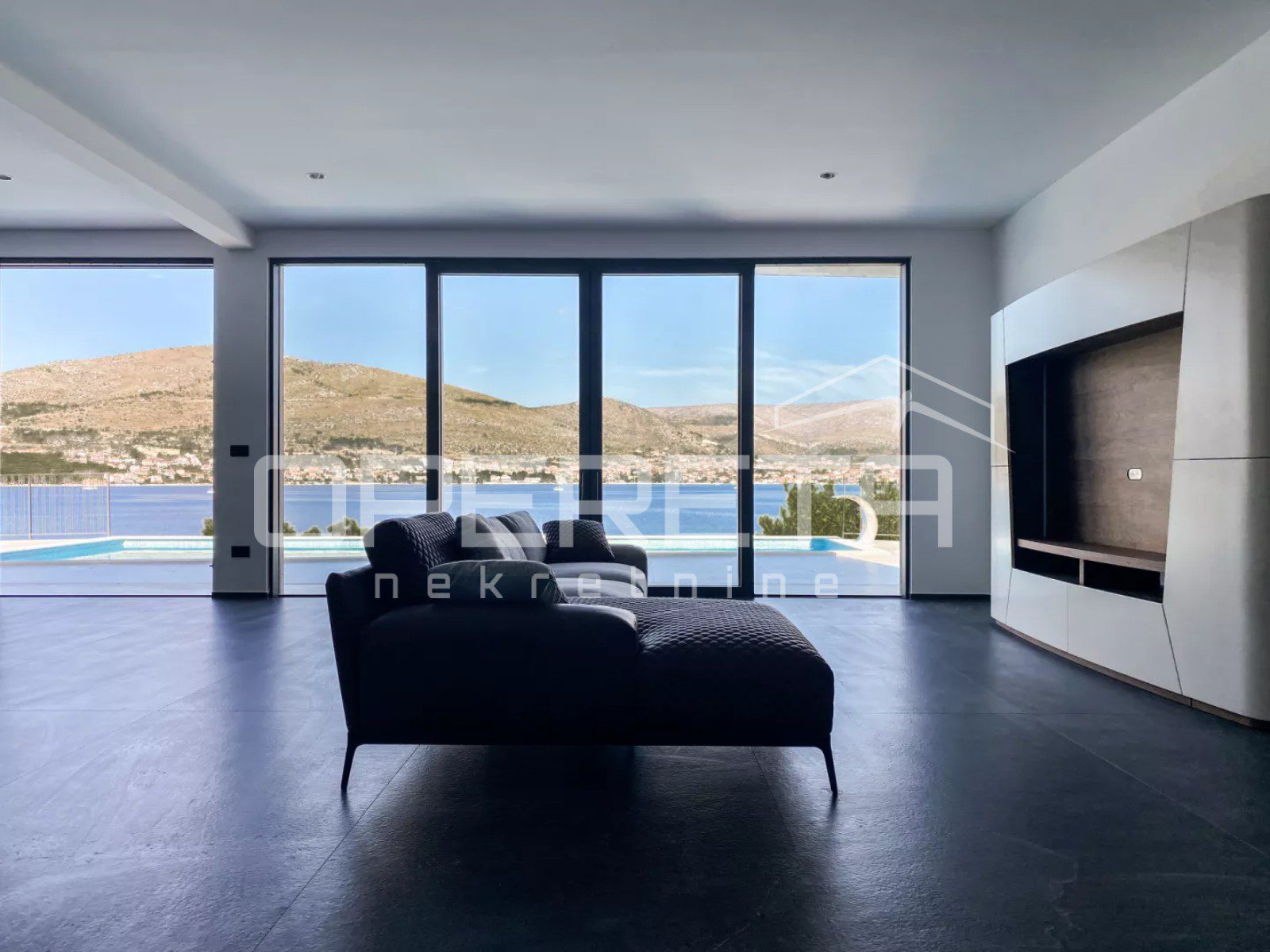 Izlaz na veliku terasu na kojoj se nalazi grijani bazen dug 11 metara je osiguran iz dnevng boravka.