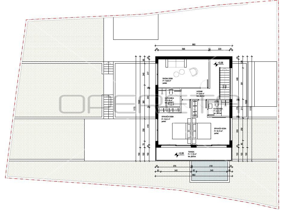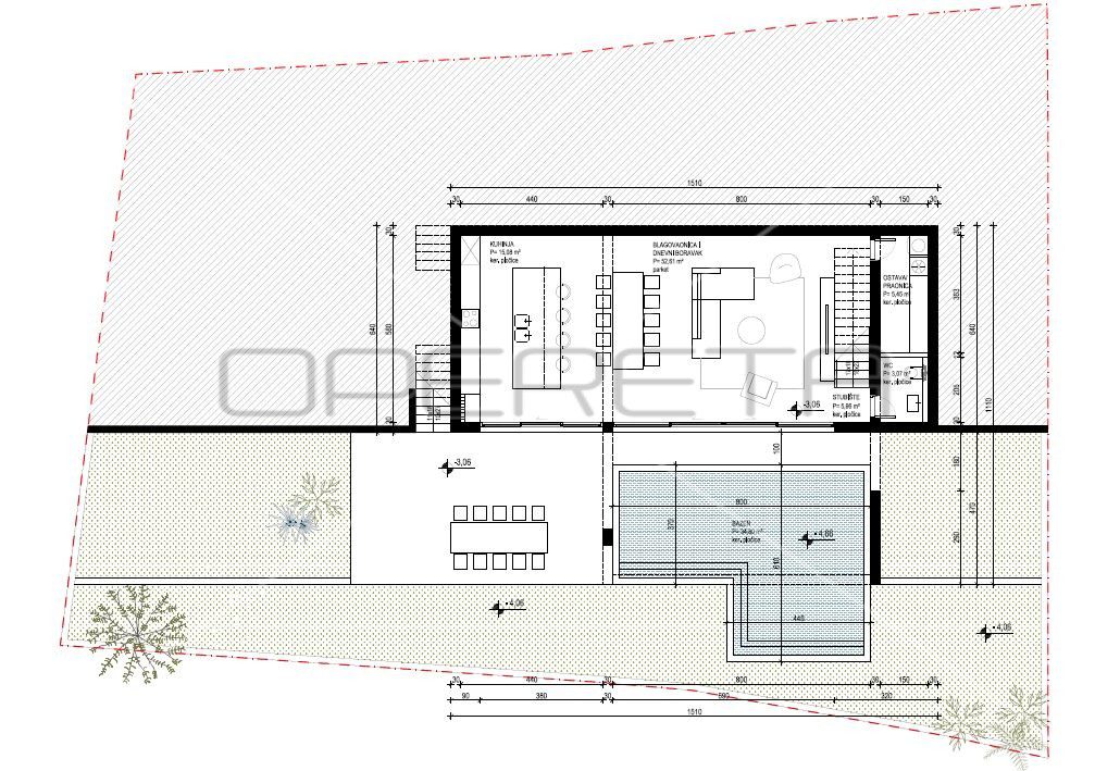 Vila se proteže na tri etaže. U prizemlju se nalazi prostrani dnevni boravak s kuhinjom i blagovaonicom, otvoren prema velikoj terasi i sunčalištu s bazenom te vanjskim tušem. Na srednjoj etaži smještena je glavna spavaća soba s vlastitom kupaonicom, walk-in garderobom i izlazom na terasu, uz prostor koji može služiti kao garaža ili dodatna prostorija prema želji vlasnika. Na gornjoj etaži nalaze se dvije prostrane spavaće sobe s vlastitim kupaonicama i terasama s pogledom na more, kao i velika radna soba.
