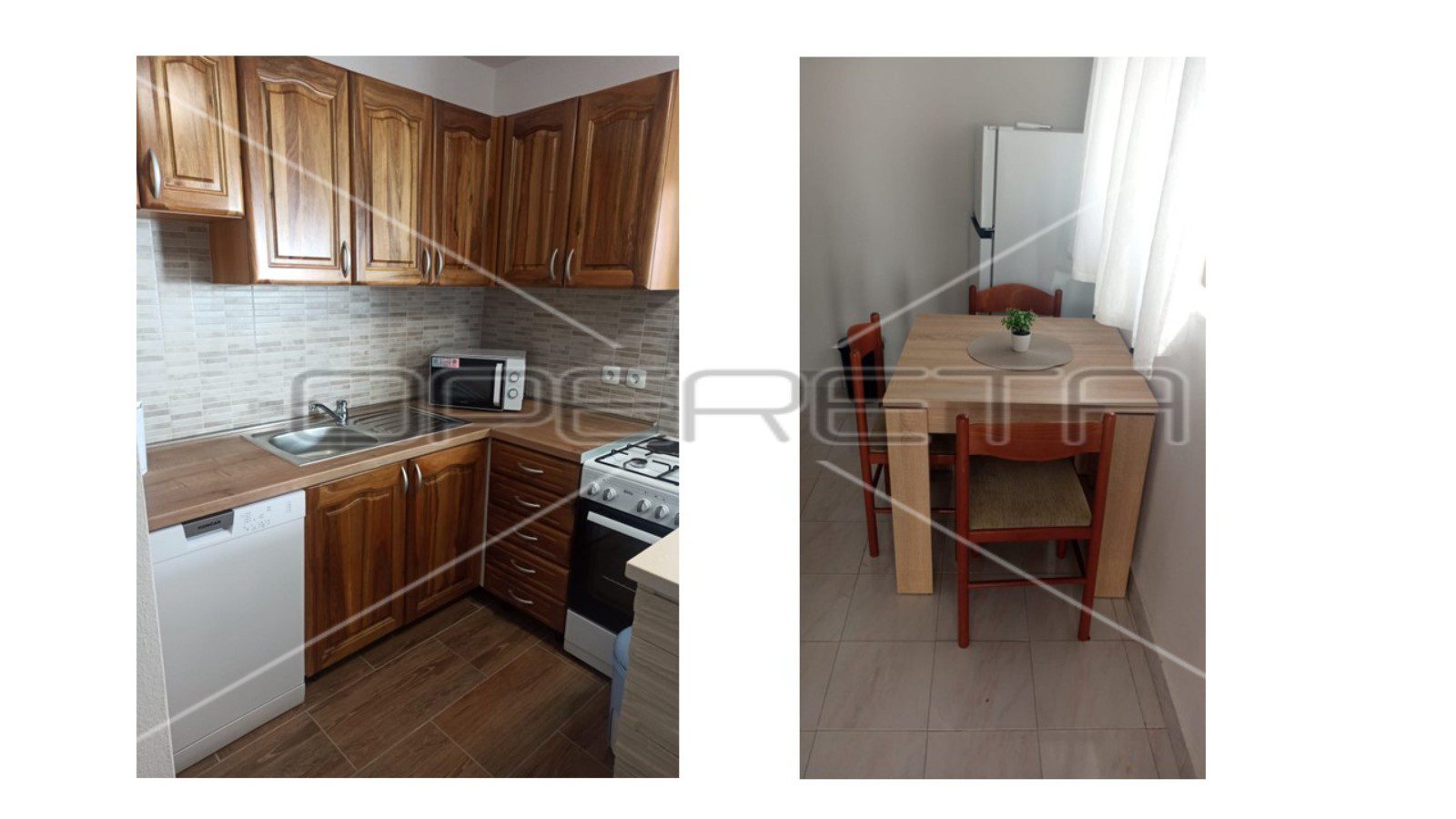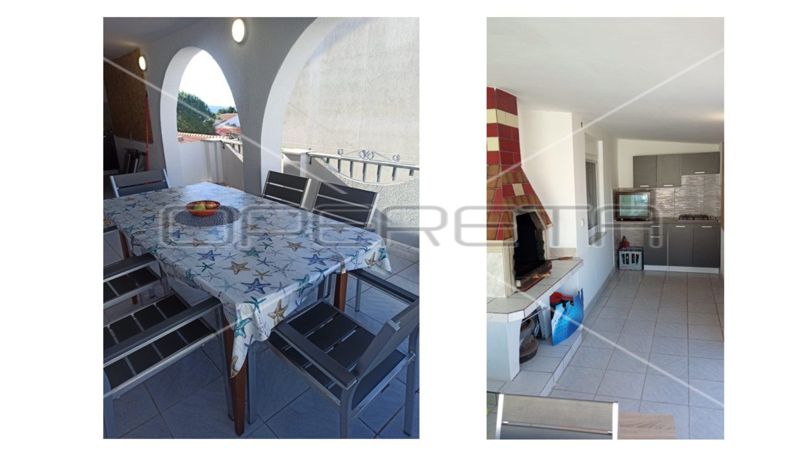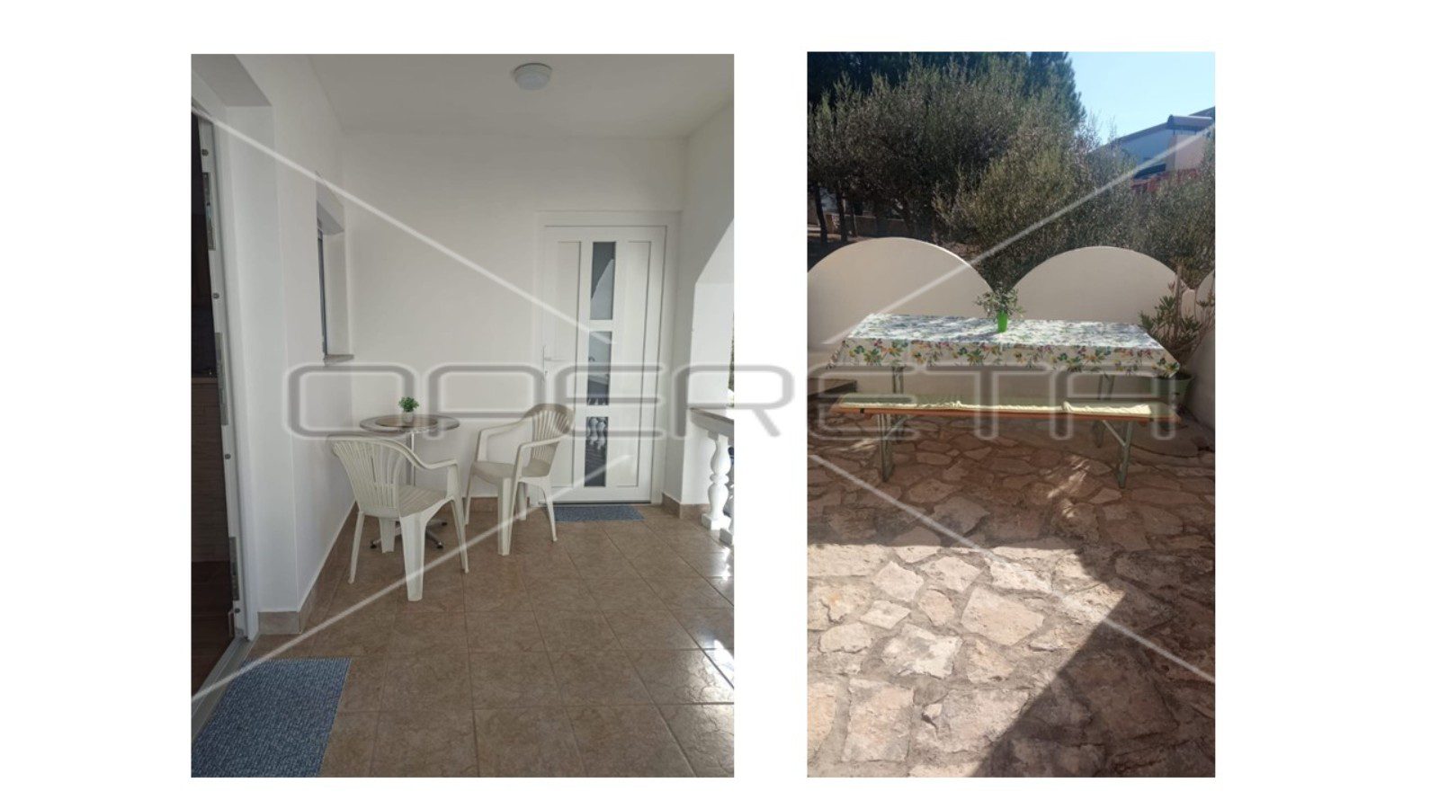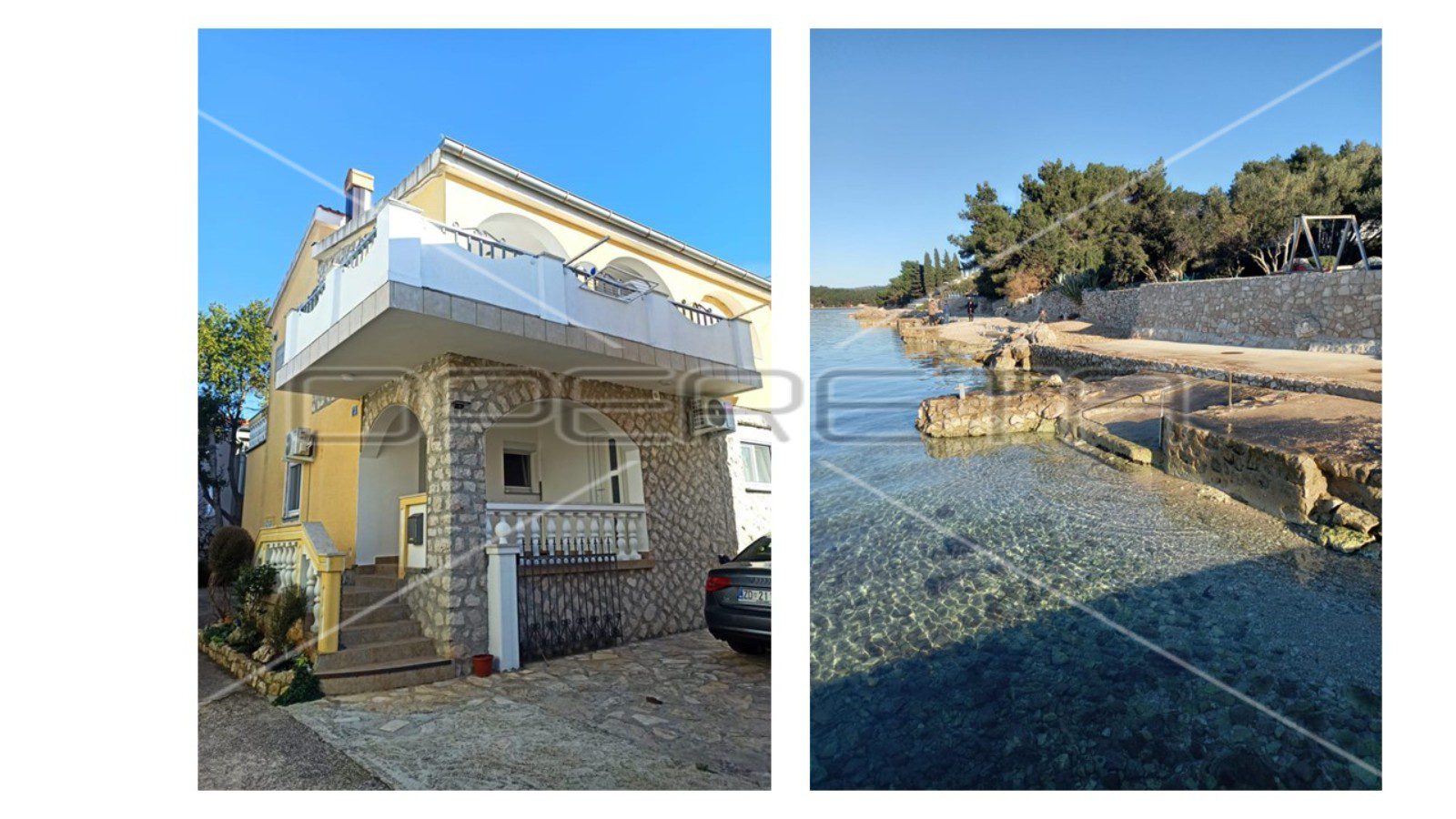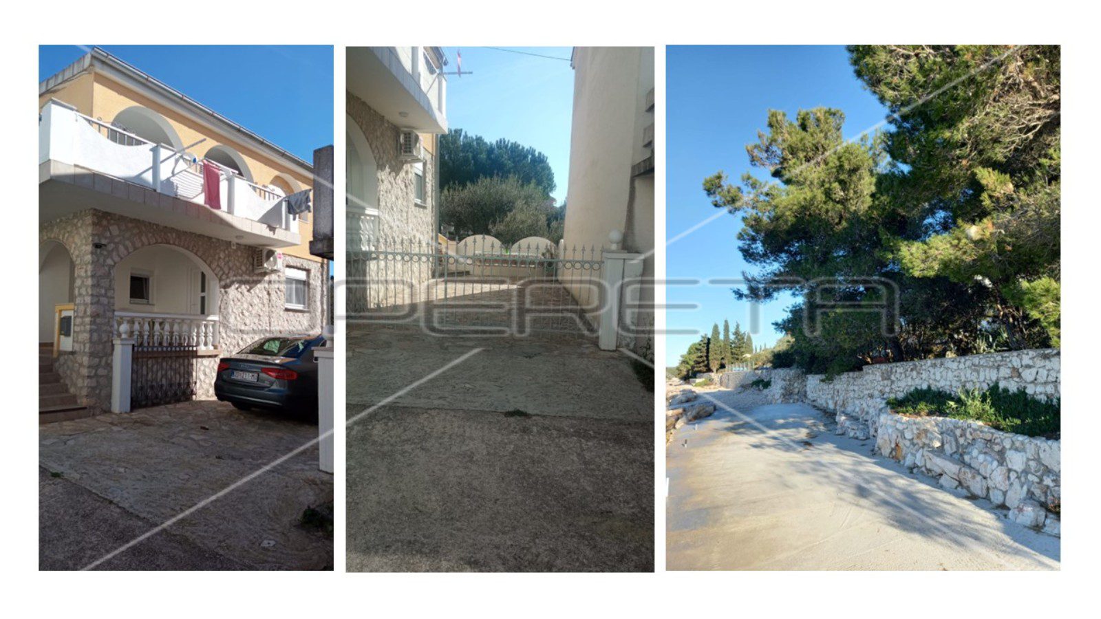 Kuća ima podrum, uređeno dvorište i tri parkirna mjesta. Gornji apartman posjeduje veliku terasu s ljetnom kuhinjom i roštiljem te djelomičan pogled na more. Donji apartmani trenutno su u najmu. Udaljenost do trgovine, restorana i kafića je 600 metara. Plaža u blizini je mirna i privatna, zahvaljujući organizaciji pristupa iz svake ulice.