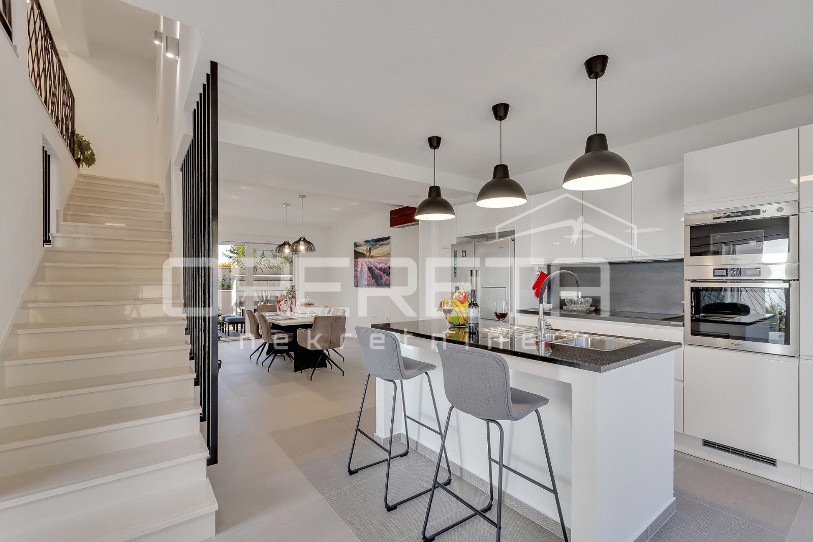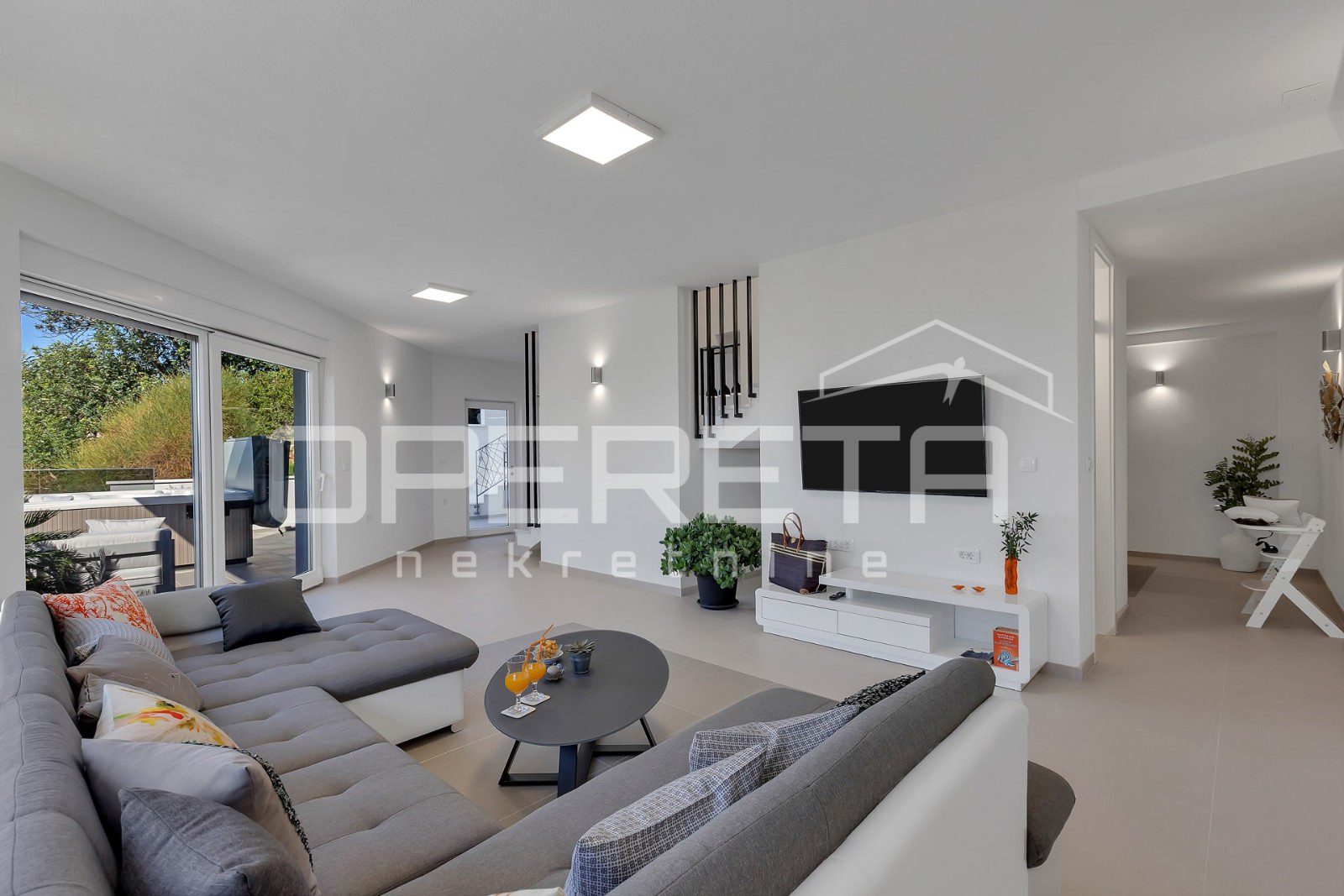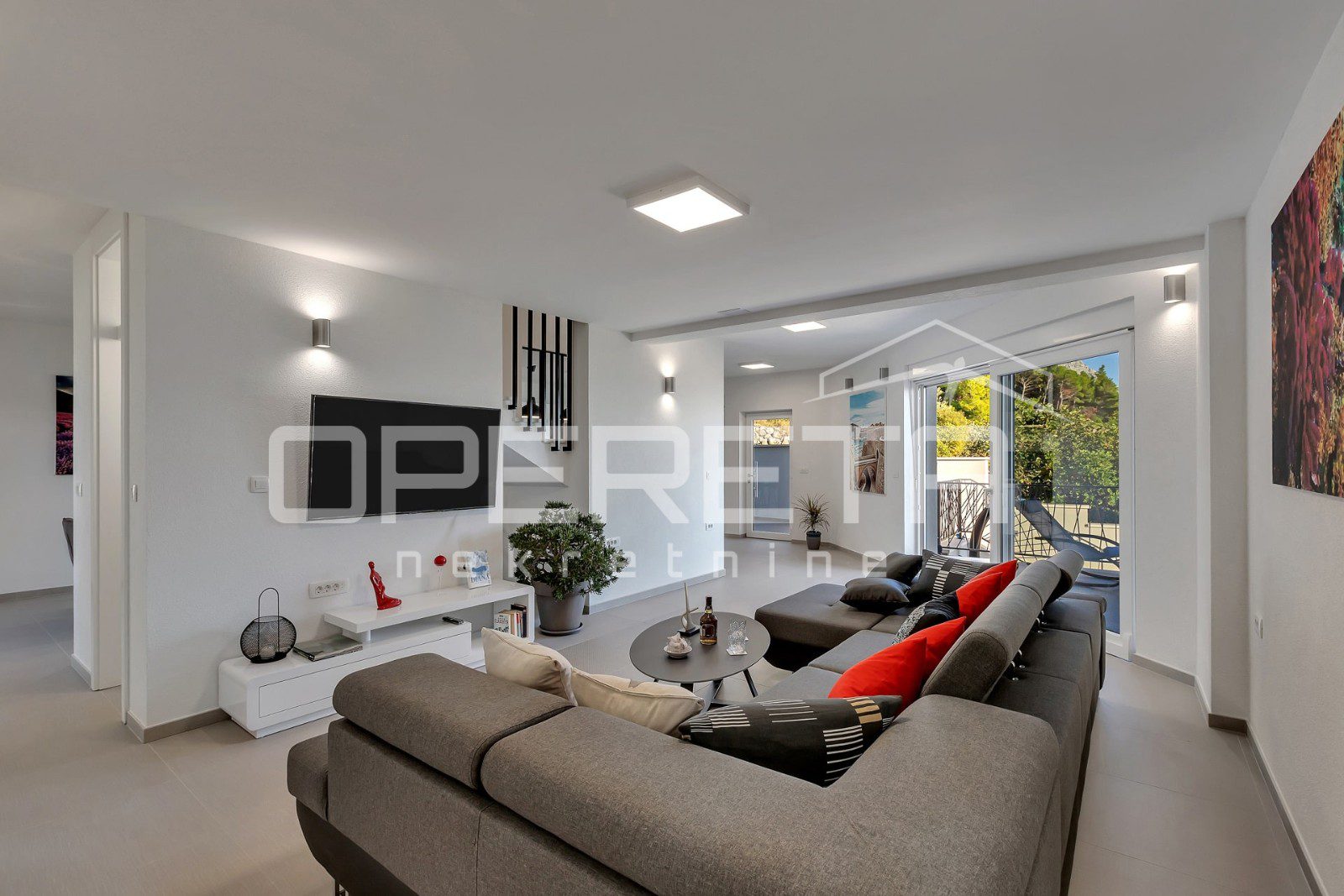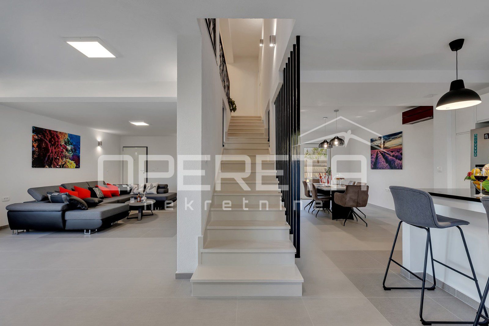 Kvaliteta izvedbe vidljiva je u svim detaljima. Ugrađeno je podno grijanje, moderne kuhinje i kupaonice, sustavi pametnog upravljanja i rasvjete te visokokvalitetni materijali u interijeru i eksterijeru. Staklene ograde naglašavaju horizonte, dok kamene i krajobrazne obloge stvaraju mediteranski ugođaj i trajnost. Objekt je novoije gradnje s godinom izvedbe 2018., uz suvremene standarde komfora i energetike.