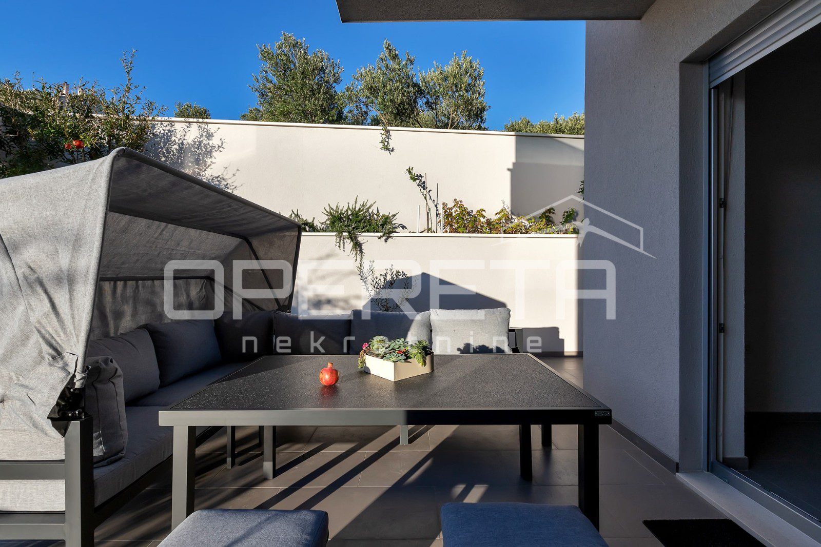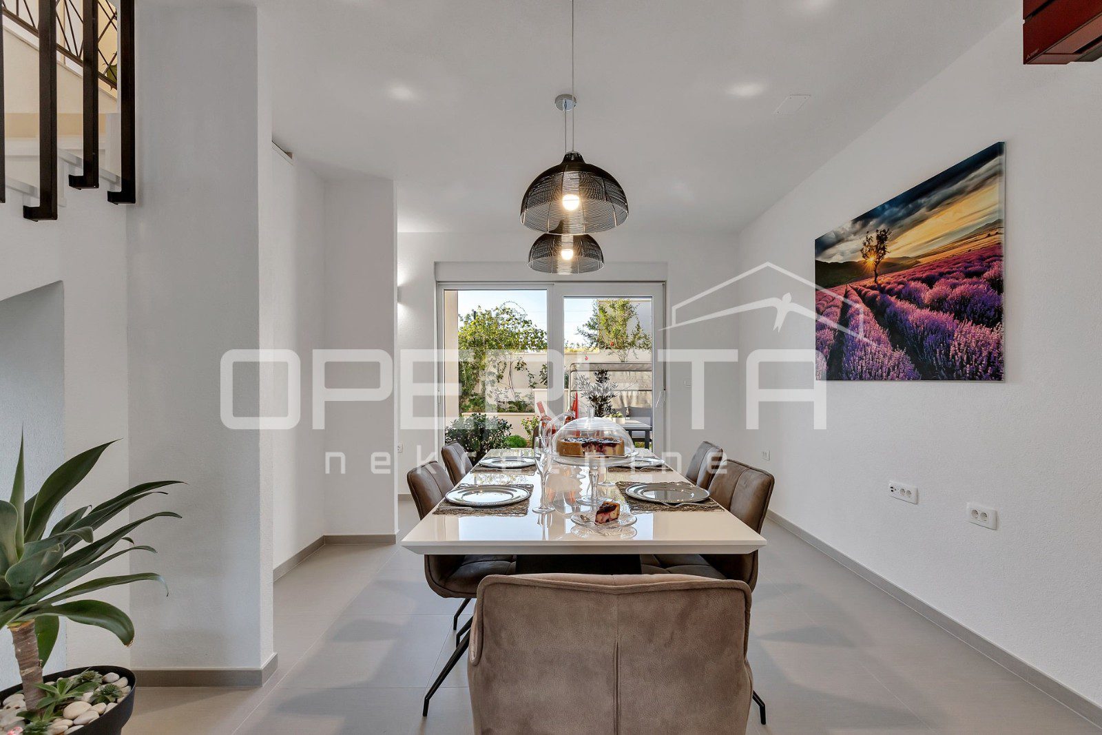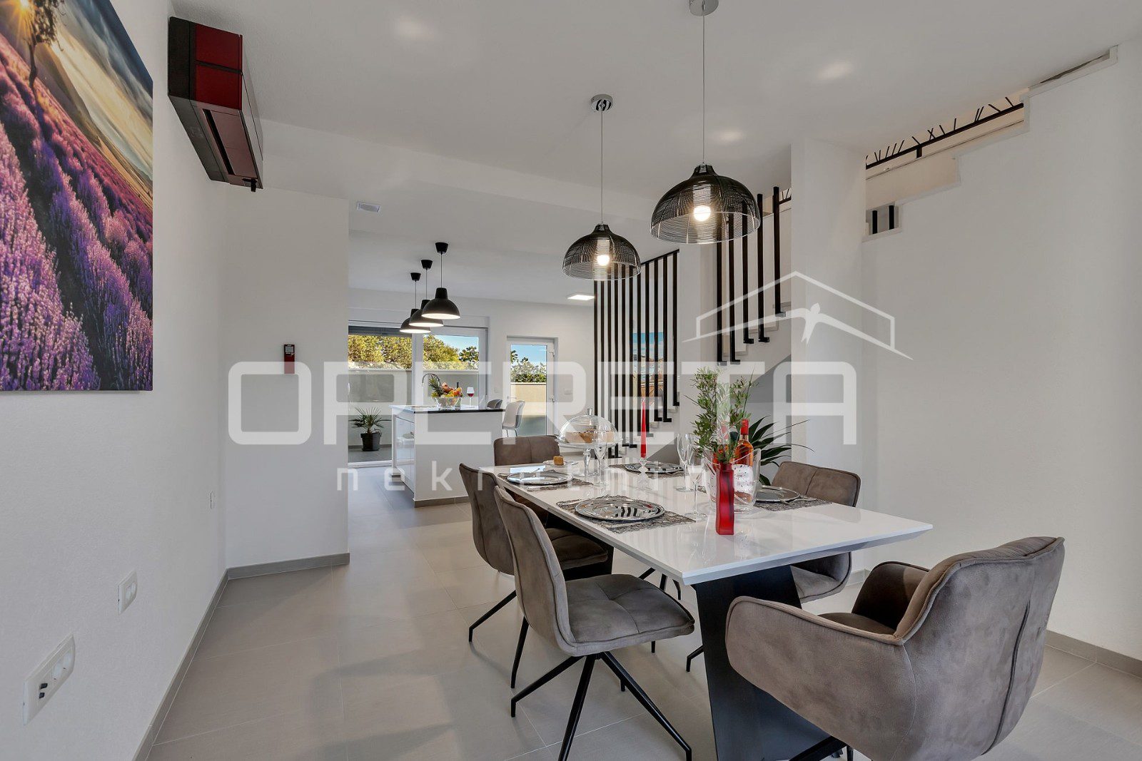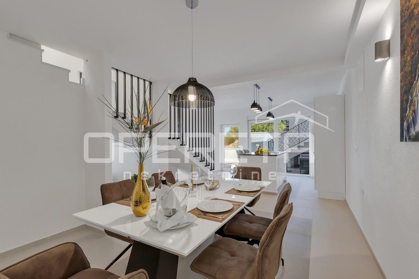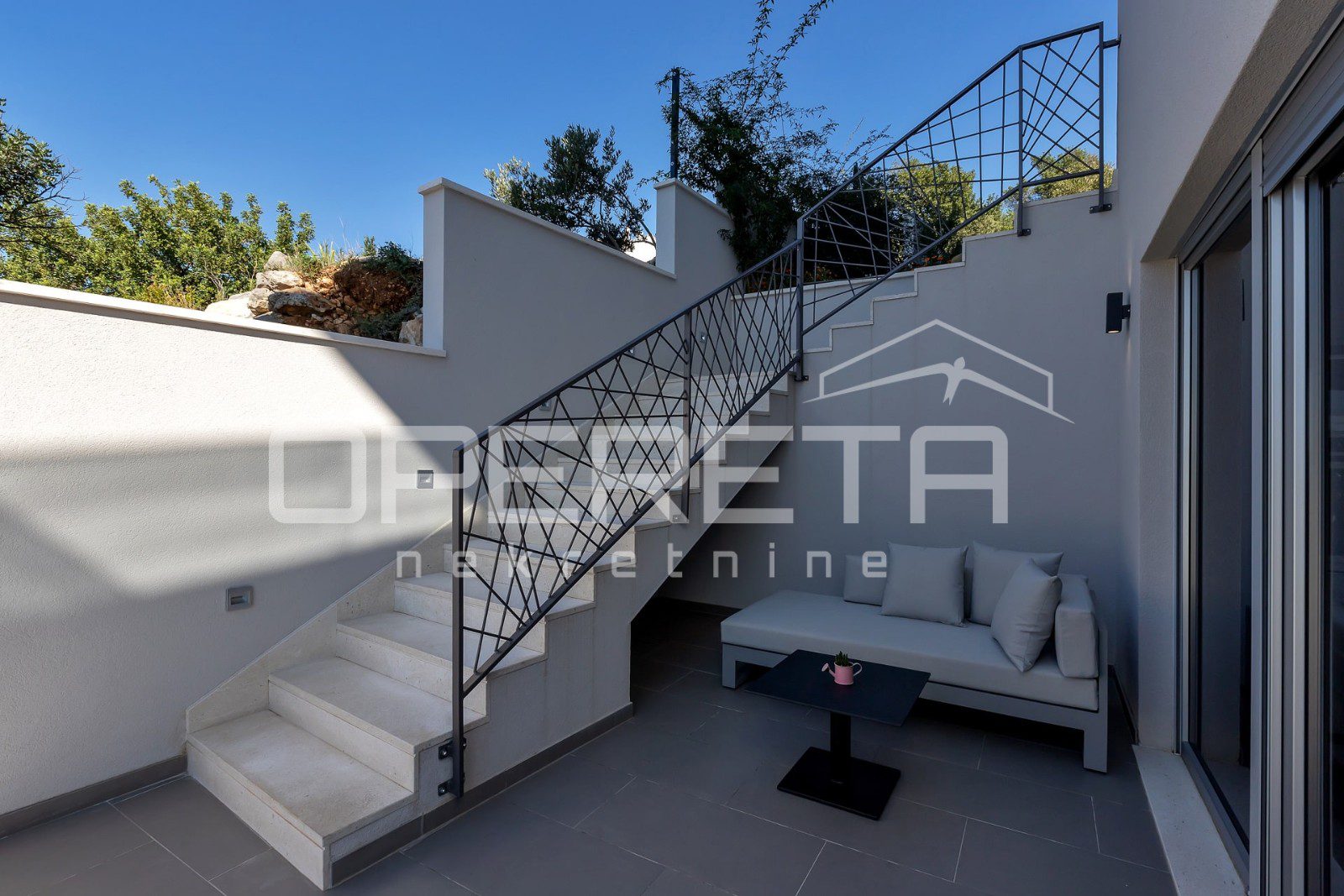 Kvaliteta izvedbe vidljiva je u svim detaljima. Ugrađeno je podno grijanje, moderne kuhinje i kupaonice, sustavi pametnog upravljanja i rasvjete te visokokvalitetni materijali u interijeru i eksterijeru. Staklene ograde naglašavaju horizonte, dok kamene i krajobrazne obloge stvaraju mediteranski ugođaj i trajnost. Objekt je novoije gradnje s godinom izvedbe 2018., uz suvremene standarde komfora i energetike.