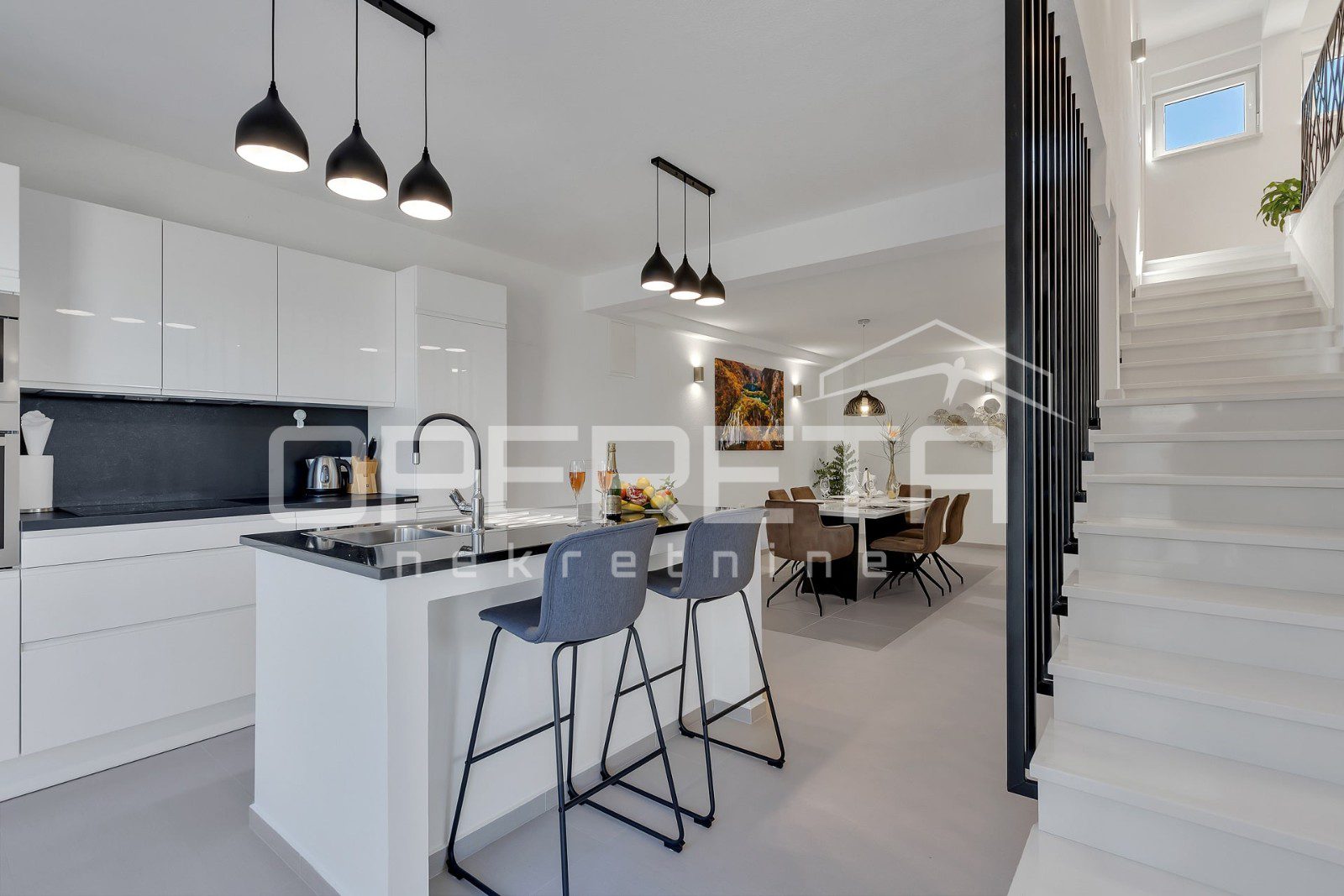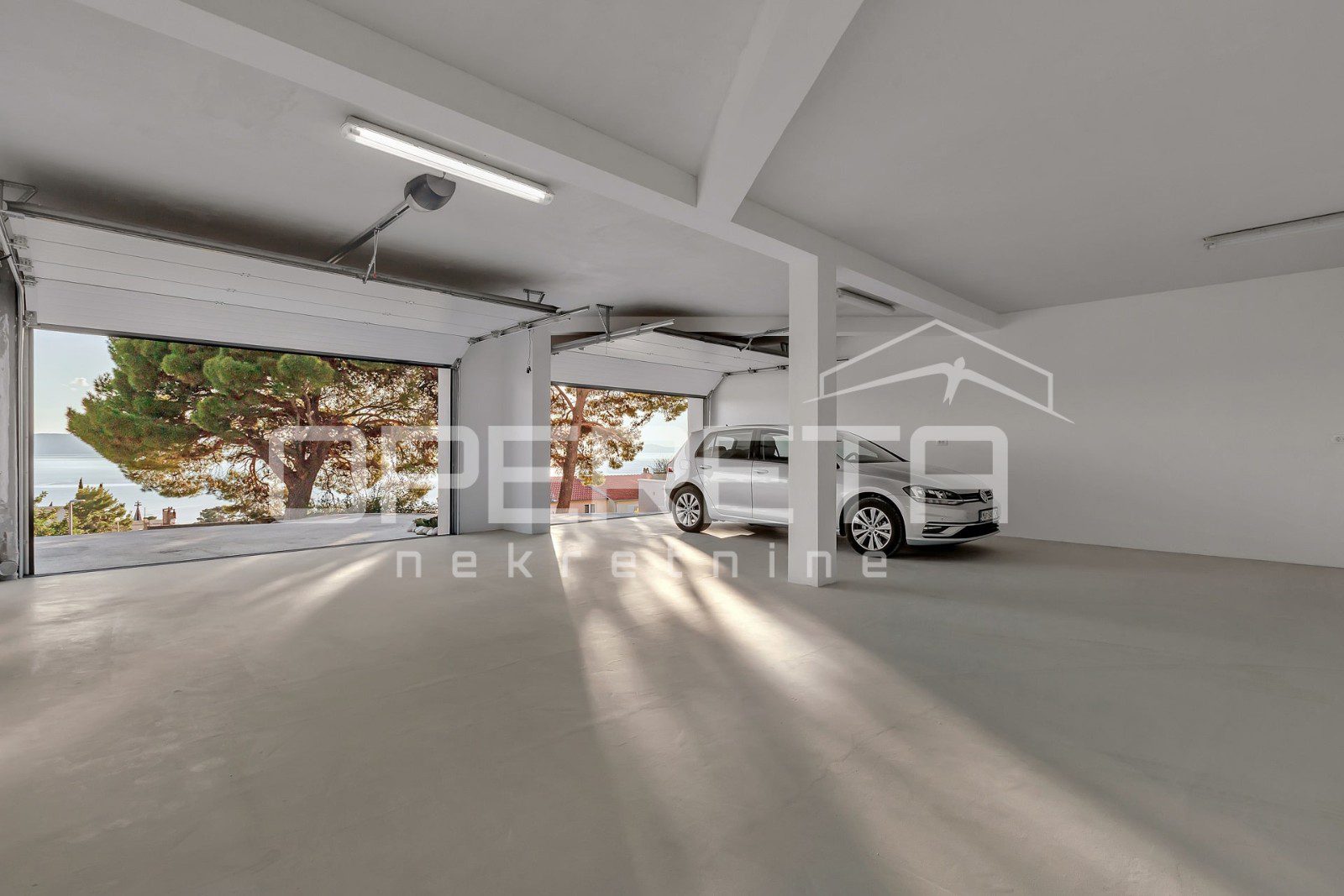 Arhitektonski koncept razvijen je na četiri razine s ukupno oko 760 m² stambene površine, uz skladan odnos interijera i vanjskih prostora. U prizemlju se nalaze garaže i prostrani skladišni dio, što pojednostavljuje logistiku i sezonsko održavanje. Na prvoj etaži planiran je izdvojeni prostor za fitness te bazen s pripadajućim sunčalištem i zonom za opuštanje, dok uređeni eksterijer uključuje vrt, vanjski roštilj rađen po mjeri i uređene površine za boravak na otvorenom. Na raspolaganju je kombinacija garažnih i vanjskih parkirnih mjesta.