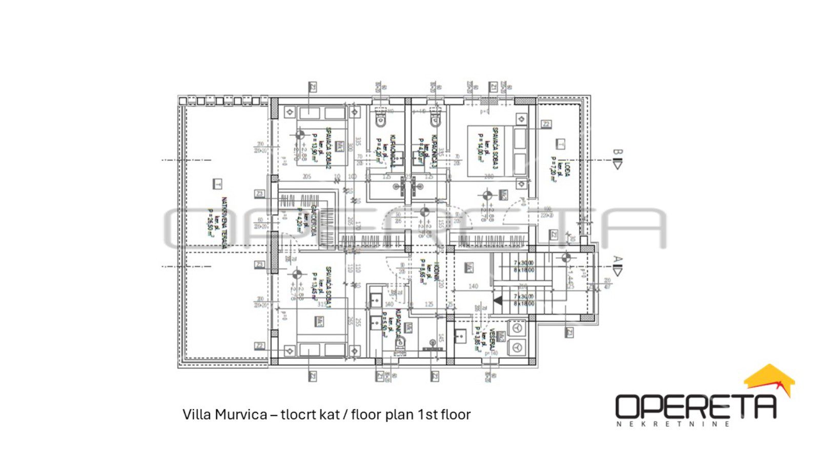 Kat je osmišljen kao spavaći dio vile u kojem su smještene tri spavaće sobe, svaka sa vlastitom kupaonicom. Dvije spavaće sobe izlaze na zajedničku natkrivenu terasu površine 26 m2. Master spavaća soba ima i odvojeni prostor garderobe površine 4 m2, dok treća spavaća soba ima izlaz na lođu površine 7 m2. Prekrasan pogled na bazen, vrt i okoliš.