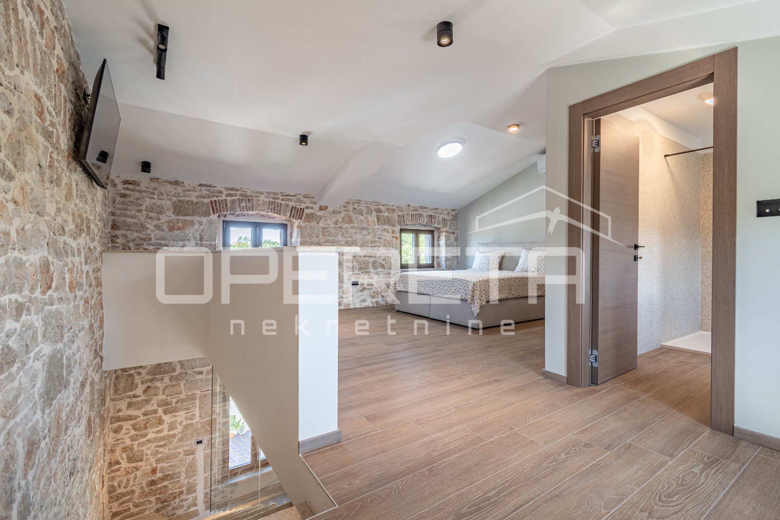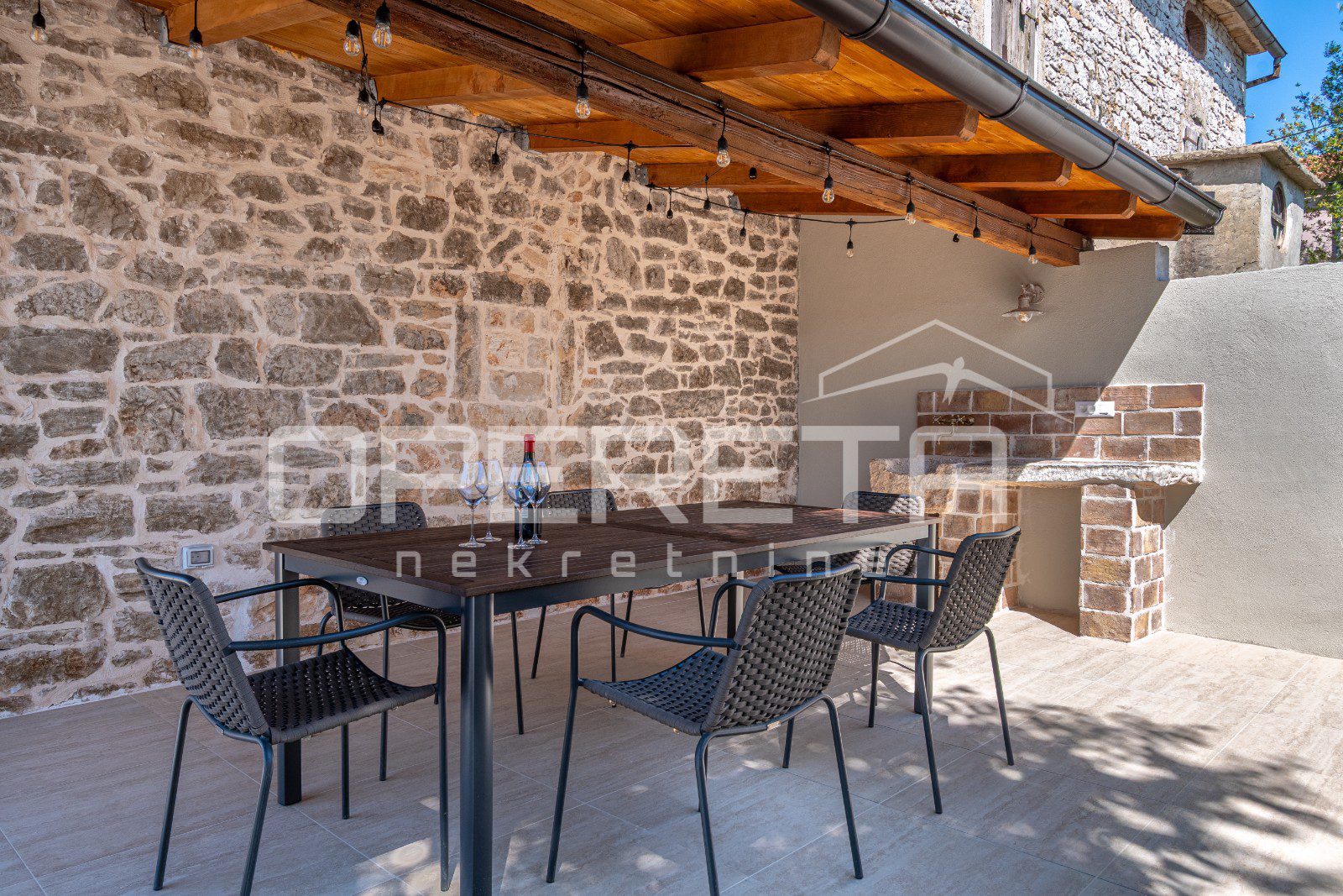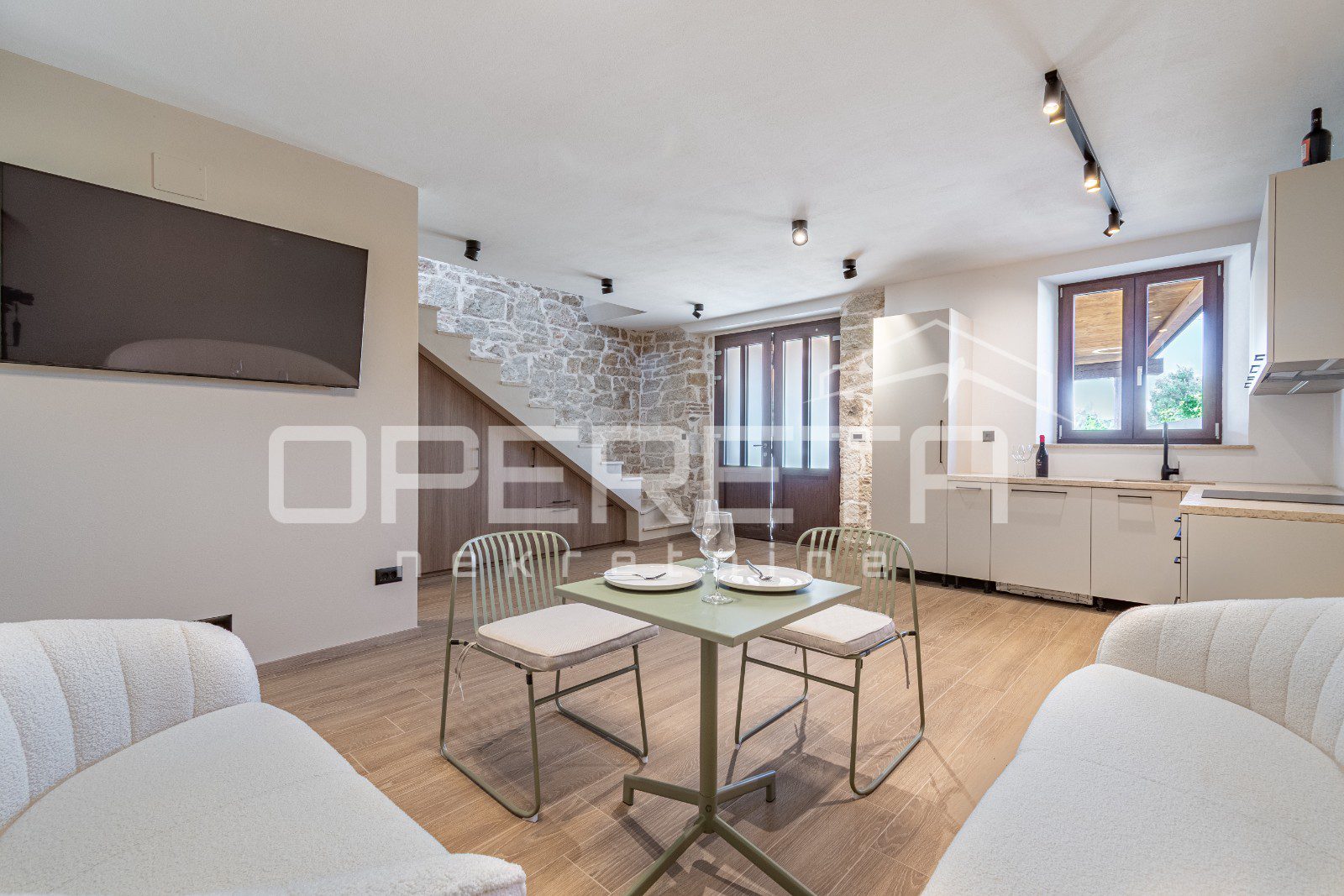Kuhinja je funkcionalna i skladno uklopljena u rustikalni stil kuće, dok dnevni boravak poziva na opuštanje u toplom ambijentu kamenih zidova i drvenih detalja.