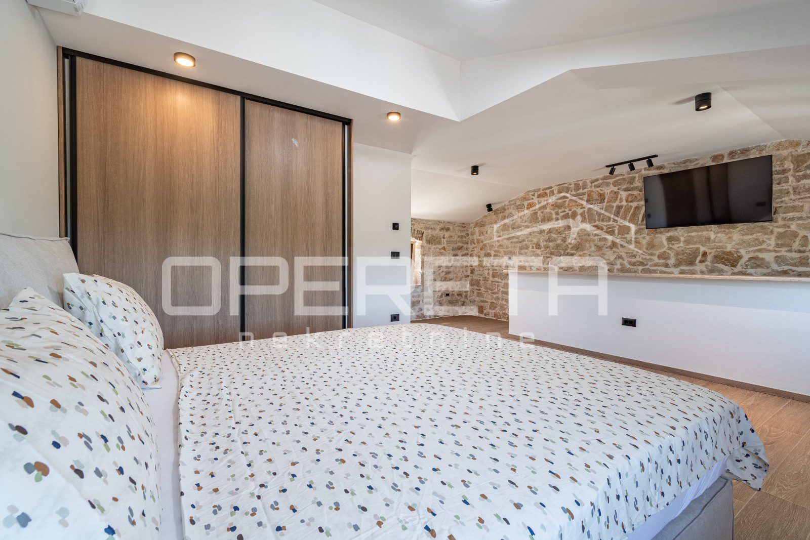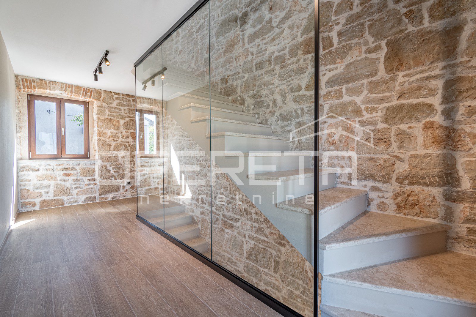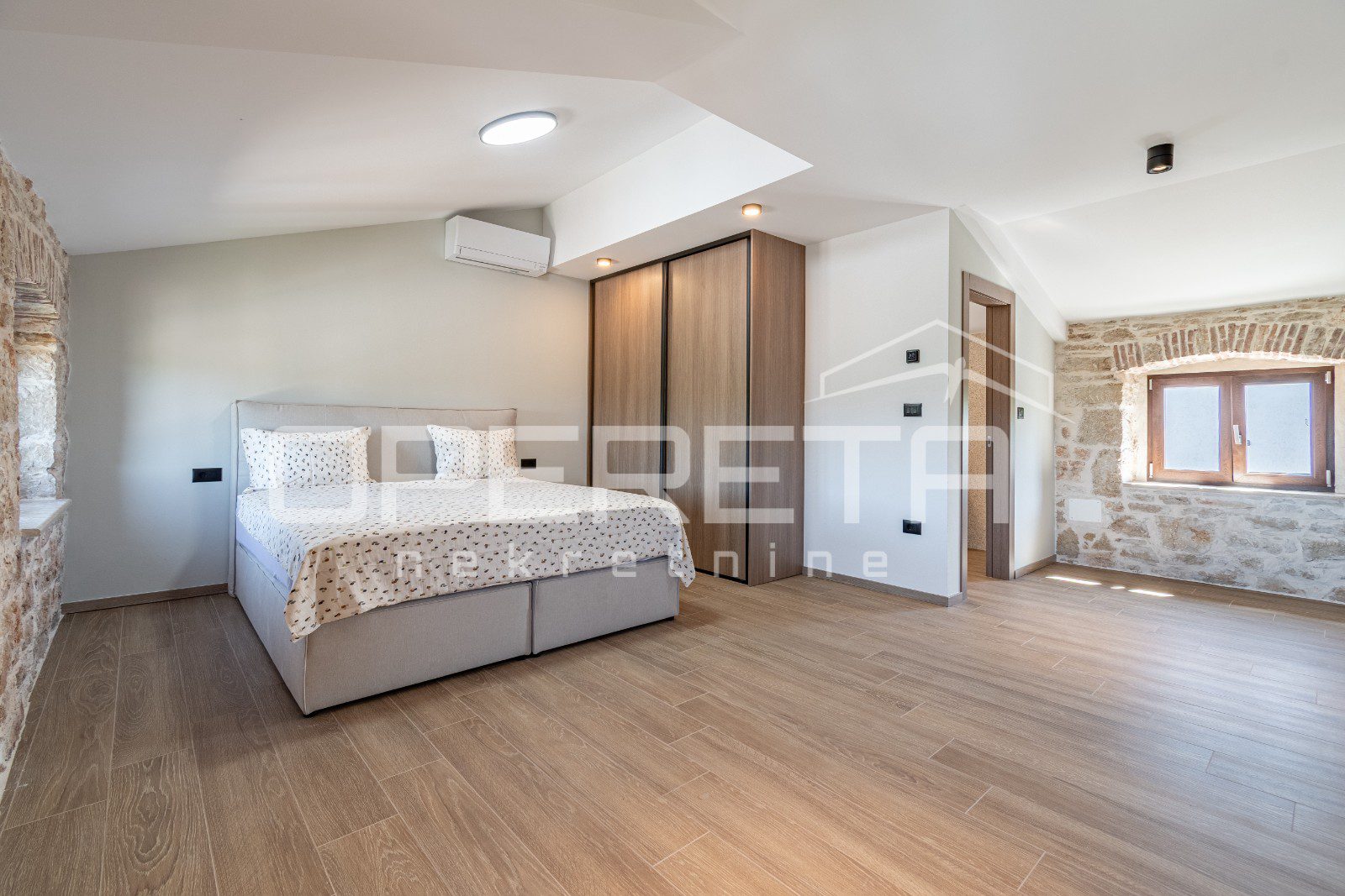 Kuhinja je funkcionalna i skladno uklopljena u rustikalni stil kuće, dok dnevni boravak poziva na opuštanje u toplom ambijentu kamenih zidova i drvenih detalja.