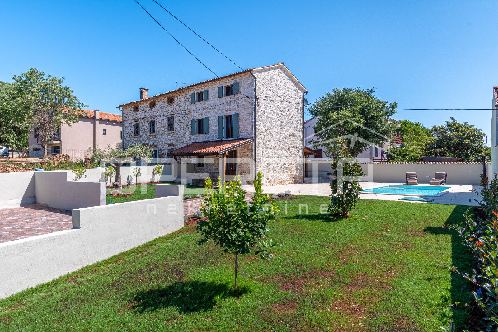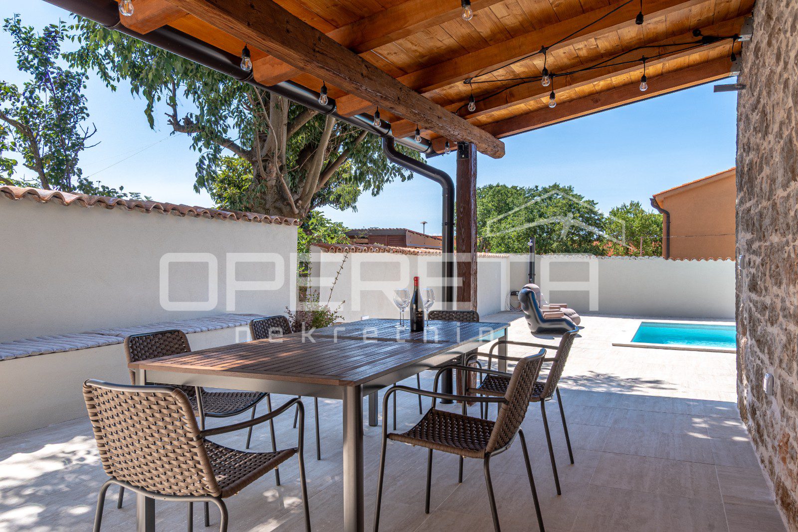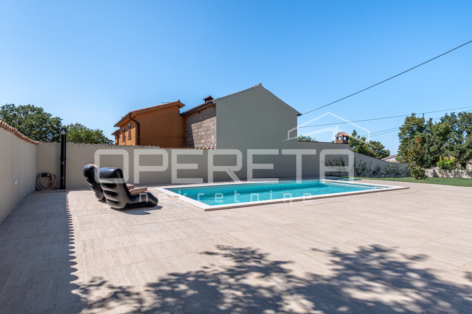 Kuća ima prostranu okućnicu površine 480 m², koja nudi potpunu privatnost i mir. U središtu dvorišta nalazi se veliki bazen sa sunčalištem i natkrivena ljetna kuhinja, savršeno mjesto za uživanje na otvorenom.