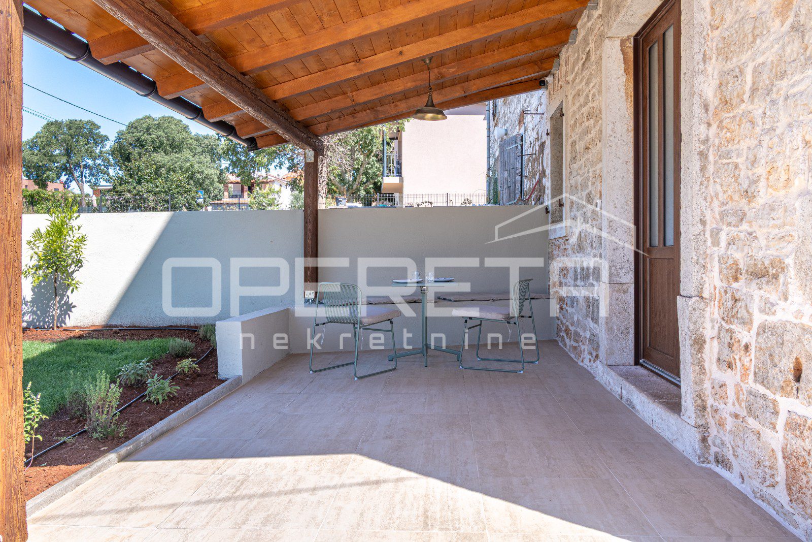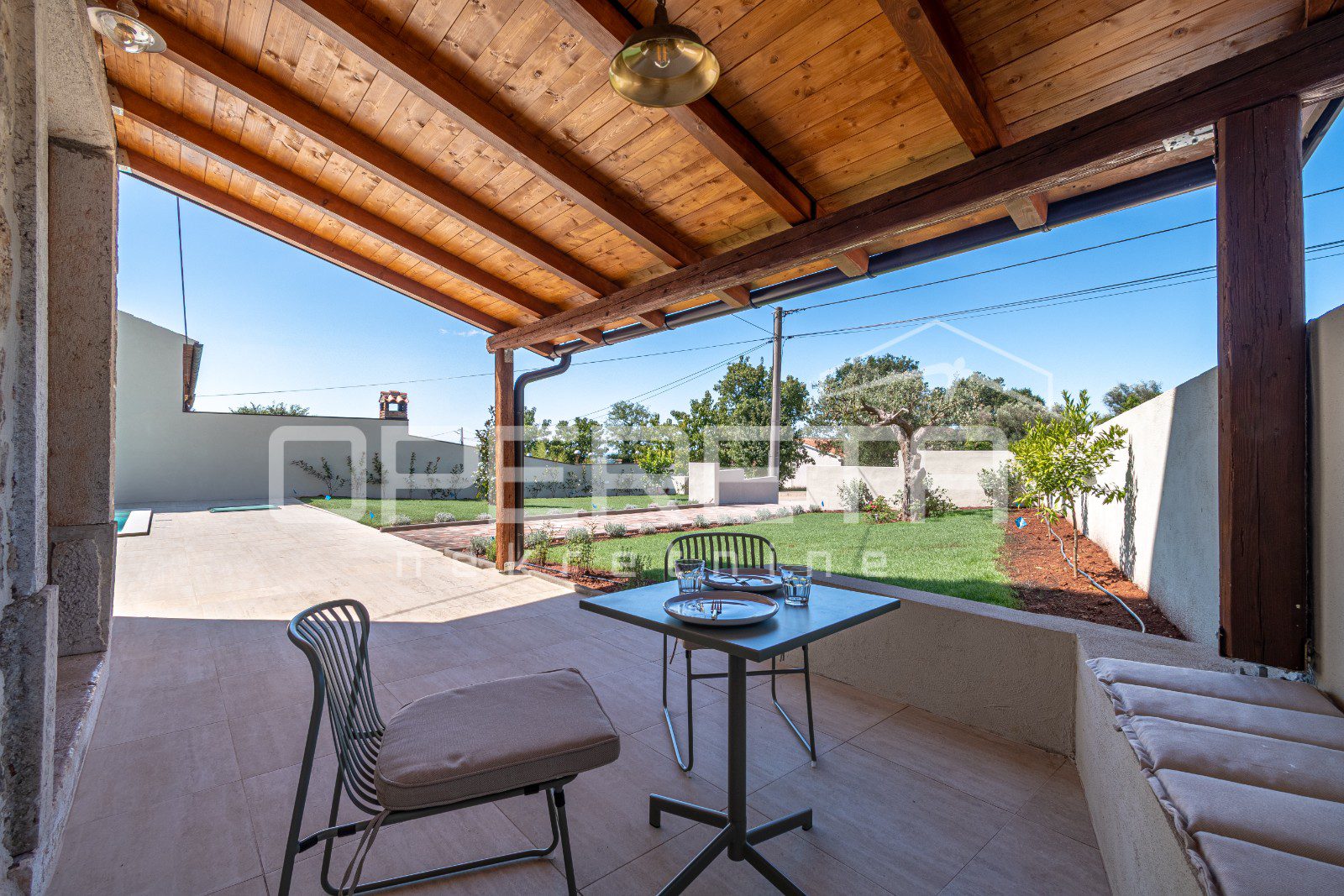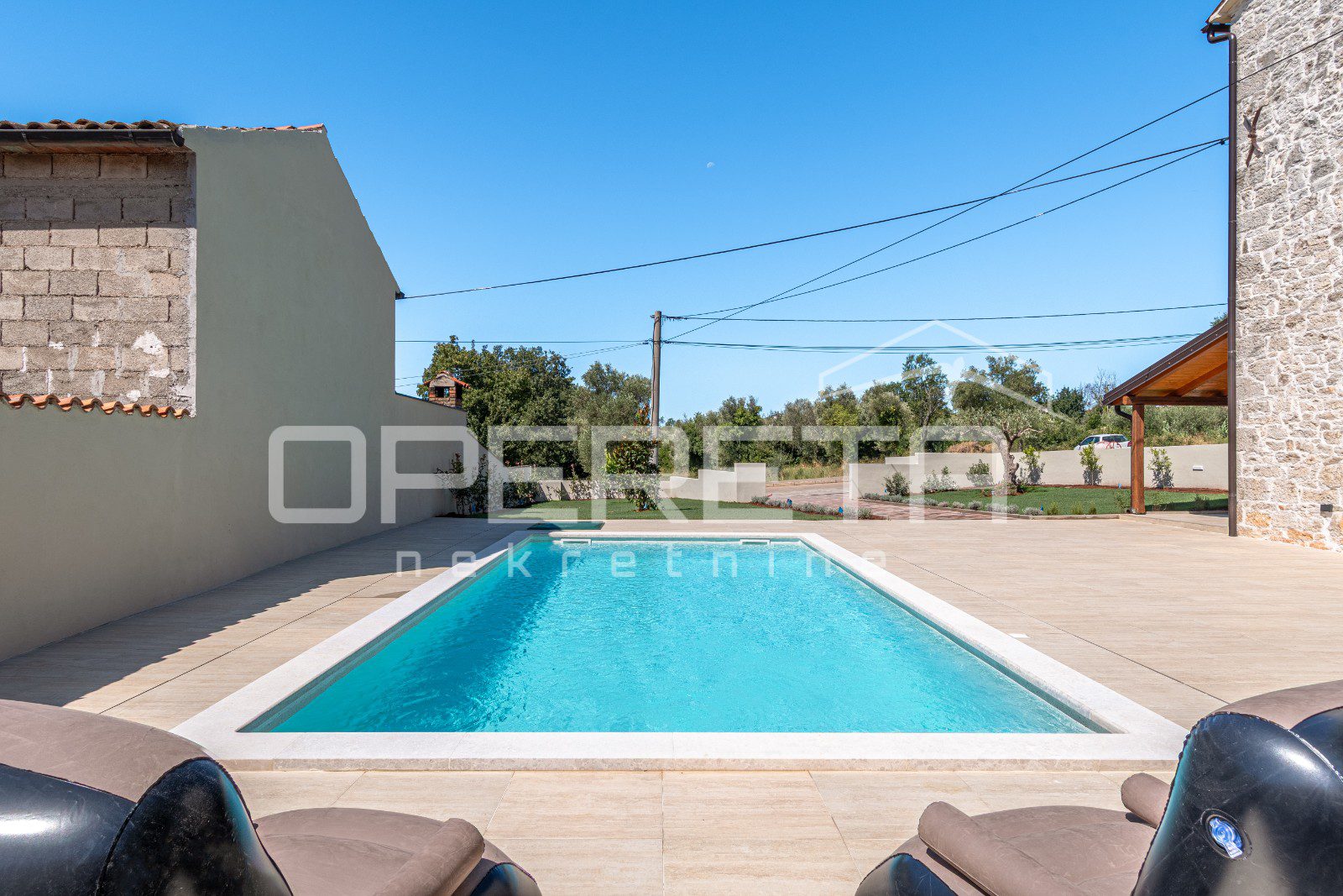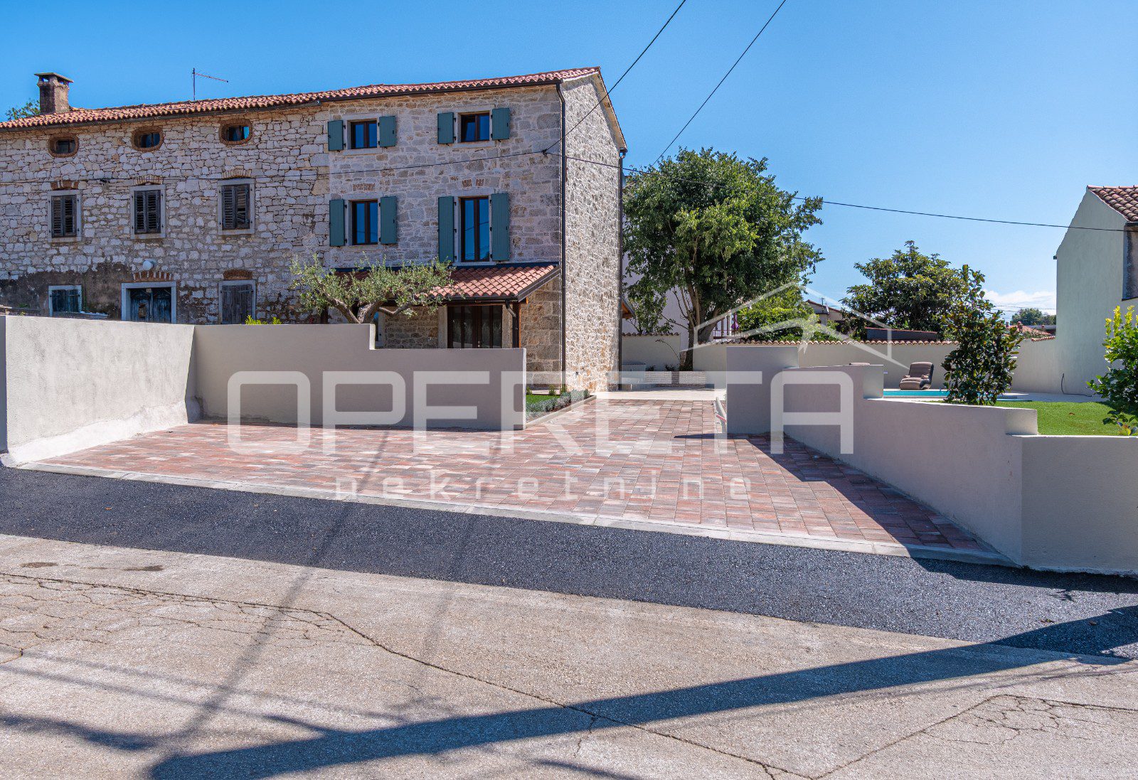 Kuća ima prostranu okućnicu površine 480 m², koja nudi potpunu privatnost i mir. U središtu dvorišta nalazi se veliki bazen sa sunčalištem i natkrivena ljetna kuhinja, savršeno mjesto za uživanje na otvorenom.