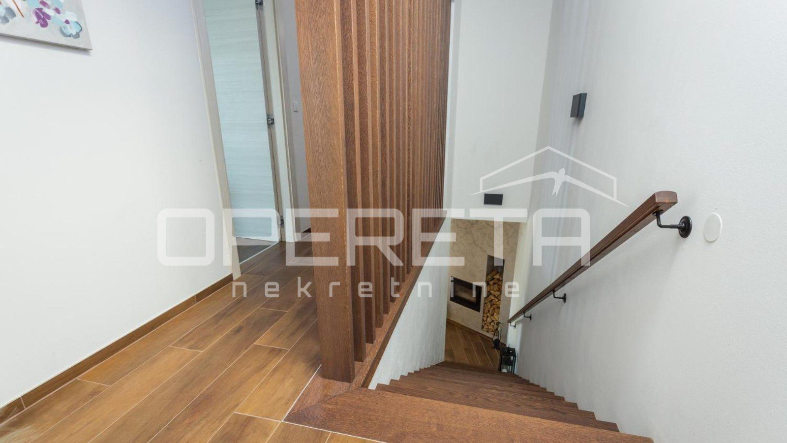 U prizemlju se nalazi prostrani dnevni boravak s blagovaonicom i švedskom peći koja daje osjećaj domaće topline i rustikalnog, ali modernog ugođaja, otvorena kuhinja te odvojeni toalet. Iz dnevnog boravka pruža se izlaz na natkrivenu terasu površine 25 m² i uređeni vrt s bazenom (6 x 4 m) i vanjskim tušem.