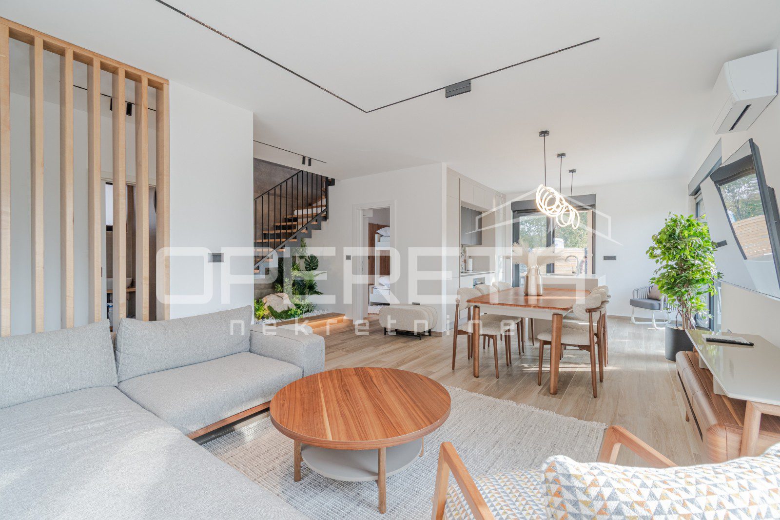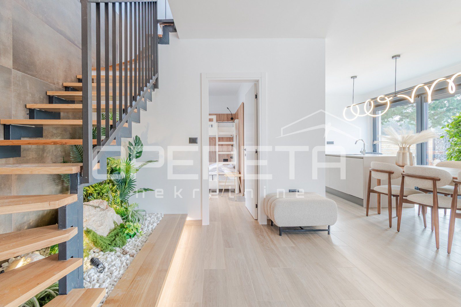Prizemlje je zamišljeno kao elegantan, otvoreni koncept koji spaja prostrani dnevni boravak s blagovaonicom i kuhinjom, a nadopunjuje ga manja spavaća soba, toalet za goste i tehnička soba. Kroz velike staklene stijene izlazi se direktno na terasu uz bazen.