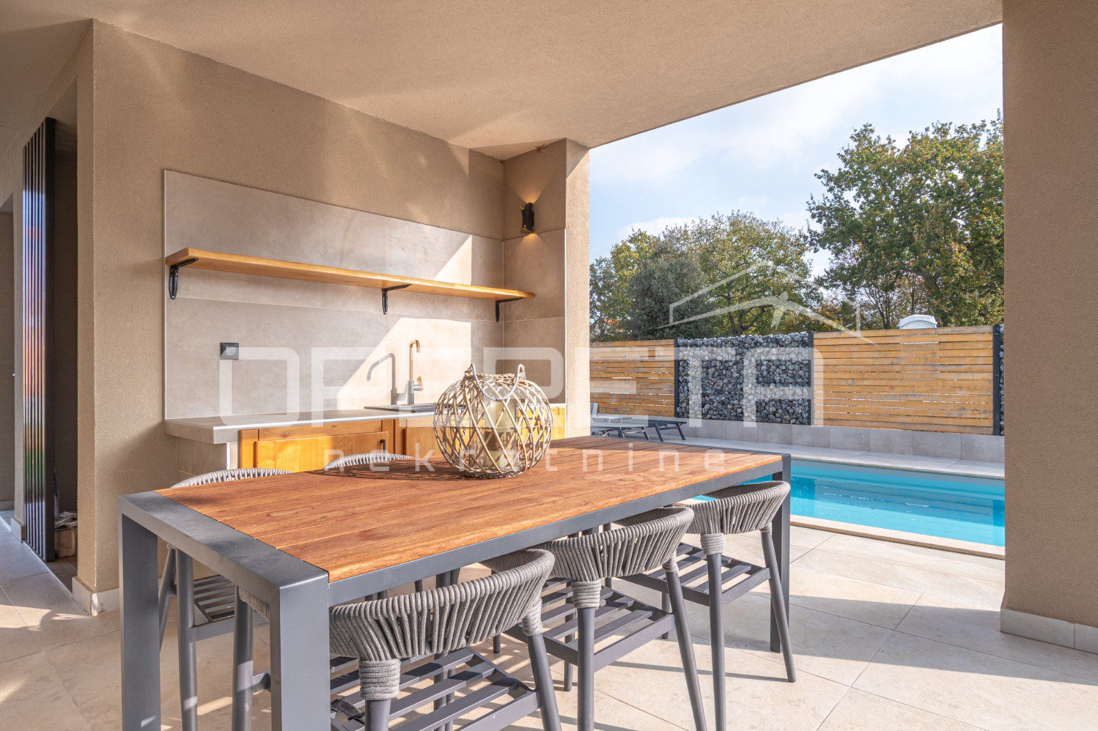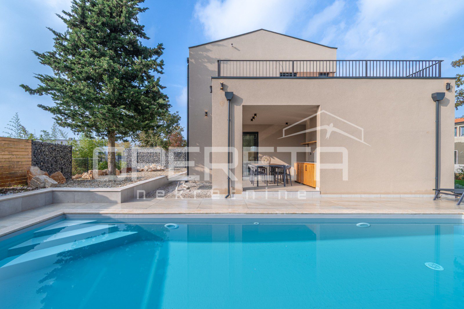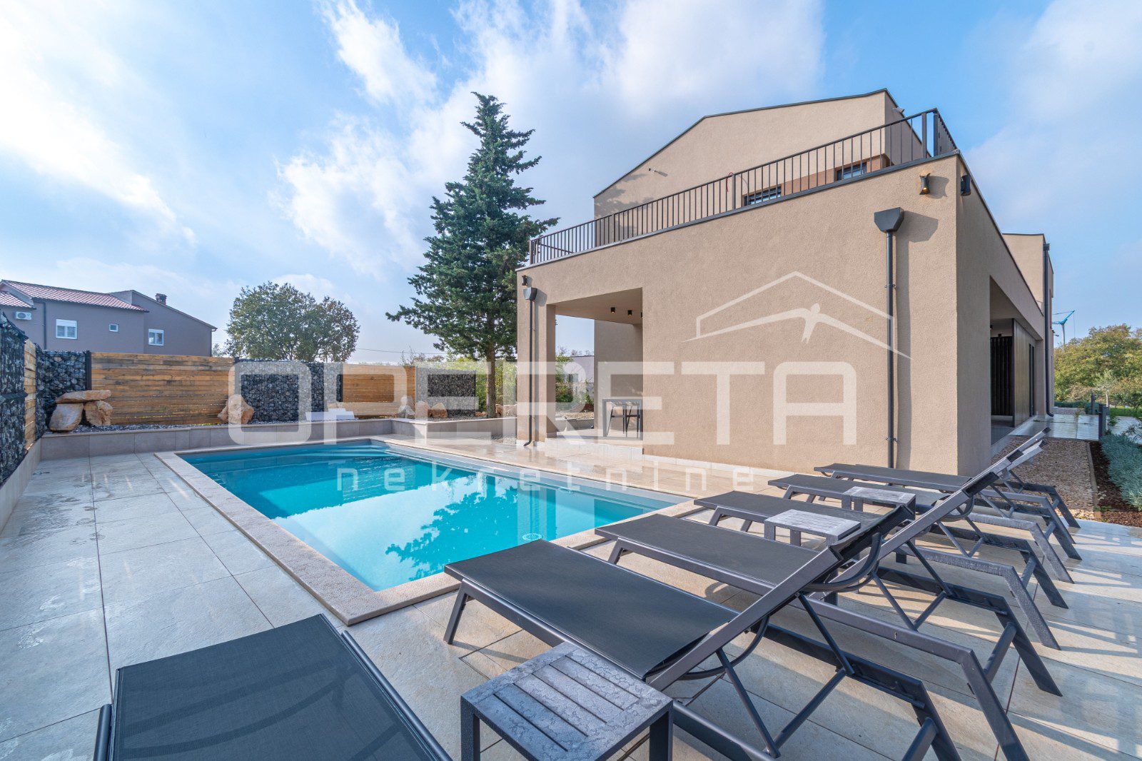 Centralni dio prekrasno ograđene okućnice krasi veliki bazen s opuštajućim sunčalištem.