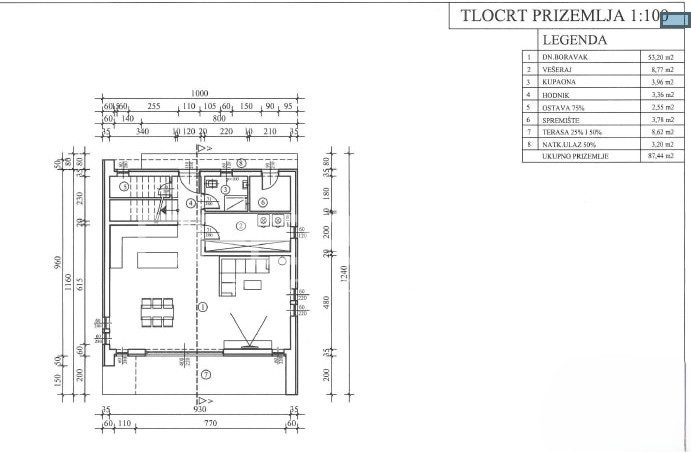 U prizemlju nalazimo kuhinju s blagovaonicom i dnevnim boravkom koja ima izlaz na terasu, kupaonicu, vešeraj i spremište.