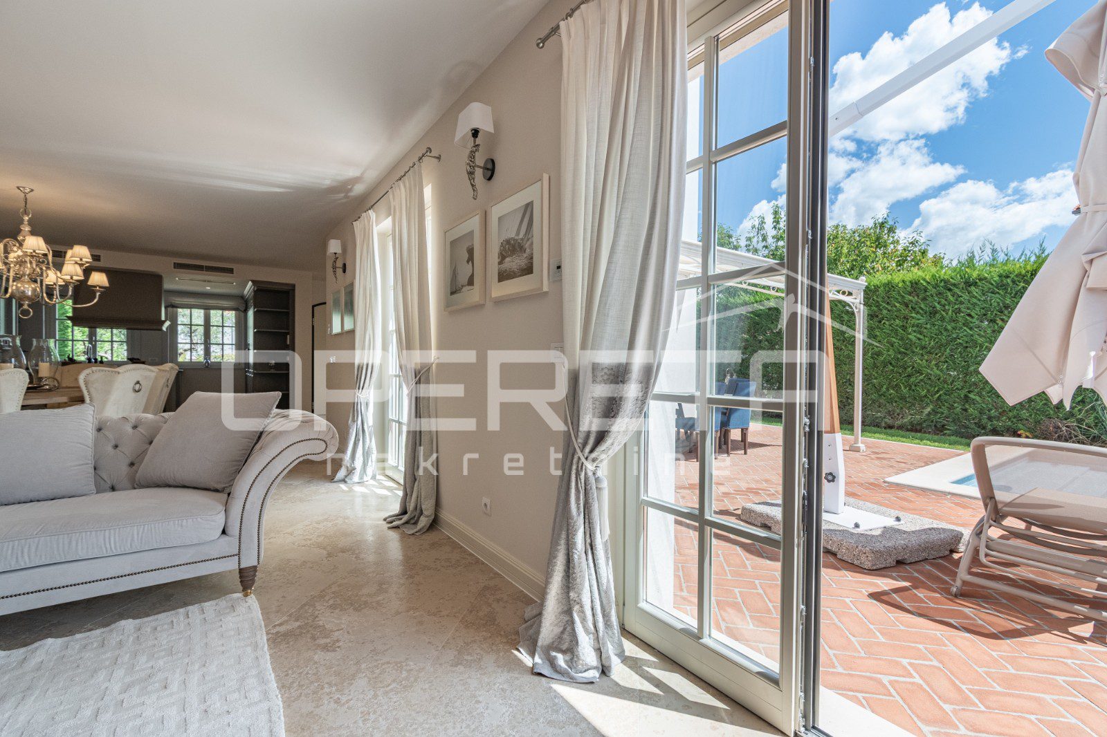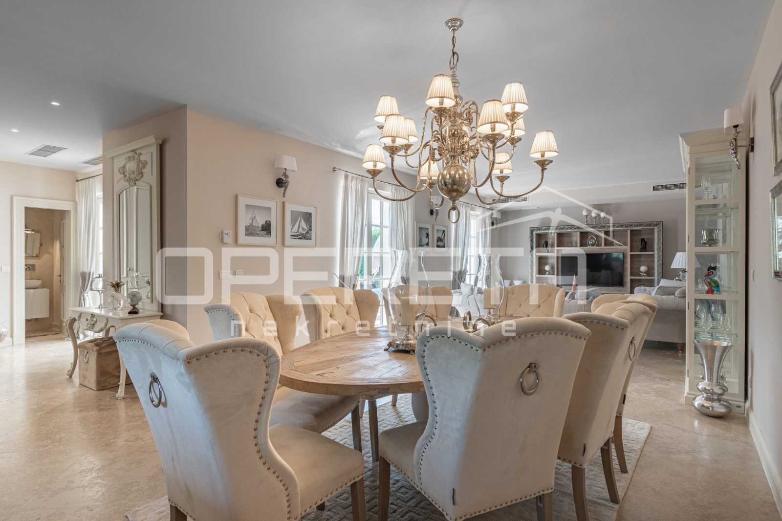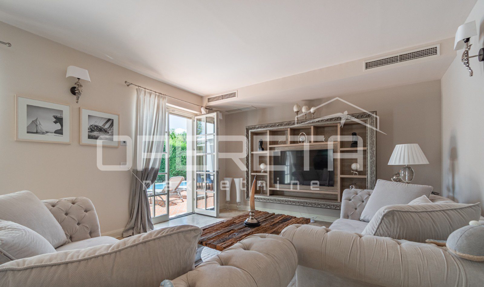 U prizemlju vile dočekuje vas elegantan ulazni hodnik koji vodi u impresivan open space koncept. Ovdje se savršeno spajaju vrhunski opremljena kuhinja s modernim Miele aparatima, prostrana blagovaonica i svijetao dnevni boravak. Iz dnevnog boravka omogućen je direktan izlaz na prostrano sunčalište i predivno uređen vrt, gdje dominira osvježavajući bazen dimenzija 8×4 metra, idealan za opuštanje i uživanje u toplim danima.