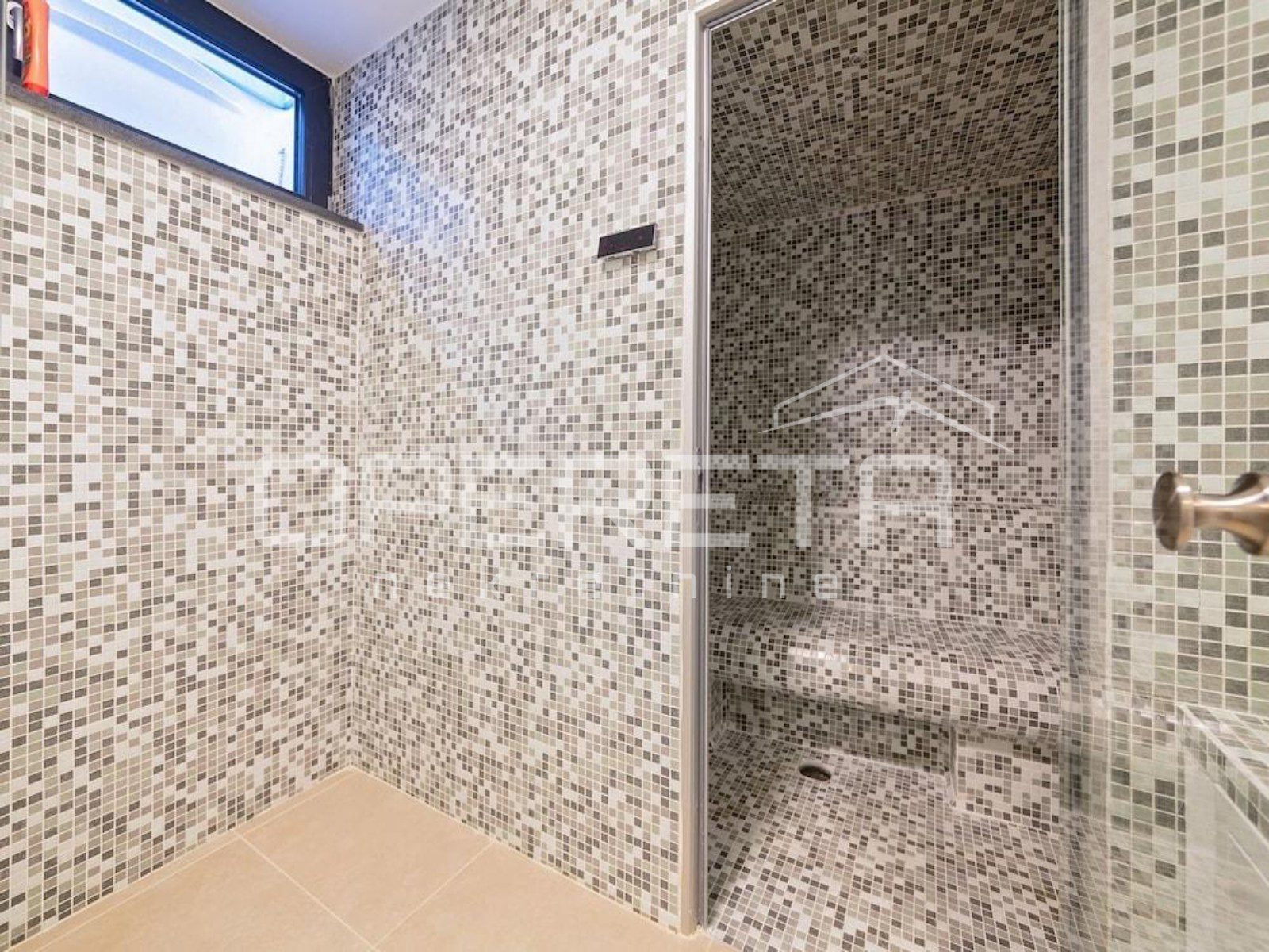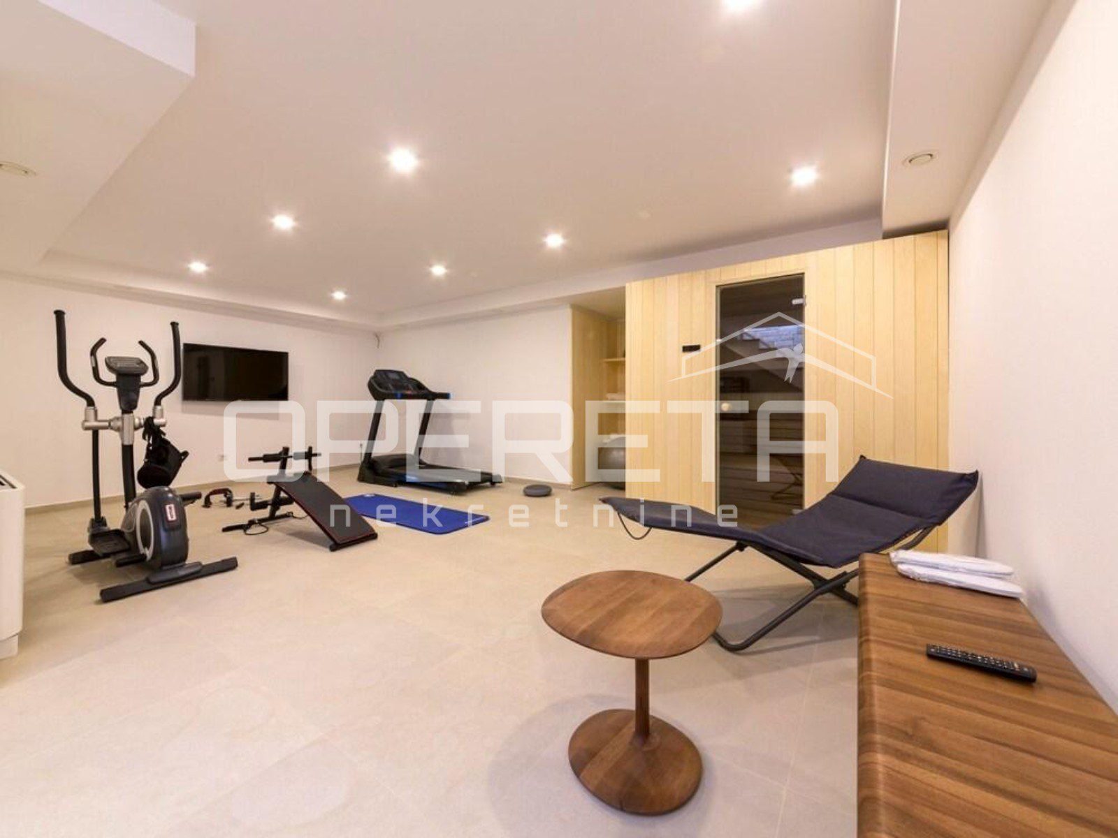 Privatna zona na katu obuhvaća tri luksuzne spavaće sobe, od kojih svaka raspolaže vlastitom kupaonicom, pružajući stanarima maksimalan komfor i privatnost. Dodatnu vrijednost čine dvije terase na katu, idealne za mirne trenutke opuštanja. Za potpuni wellness doživljaj, vila u suterenu krije privatnu oazu opremljenu saunom, tušem i potpuno opremljenim fitness dijelom, dok se na kruni kuće – prostranoj krovnoj terasi – nalazi jacuzzi s panoramskim pogledom na more i nezaboravne zalaske sunca.