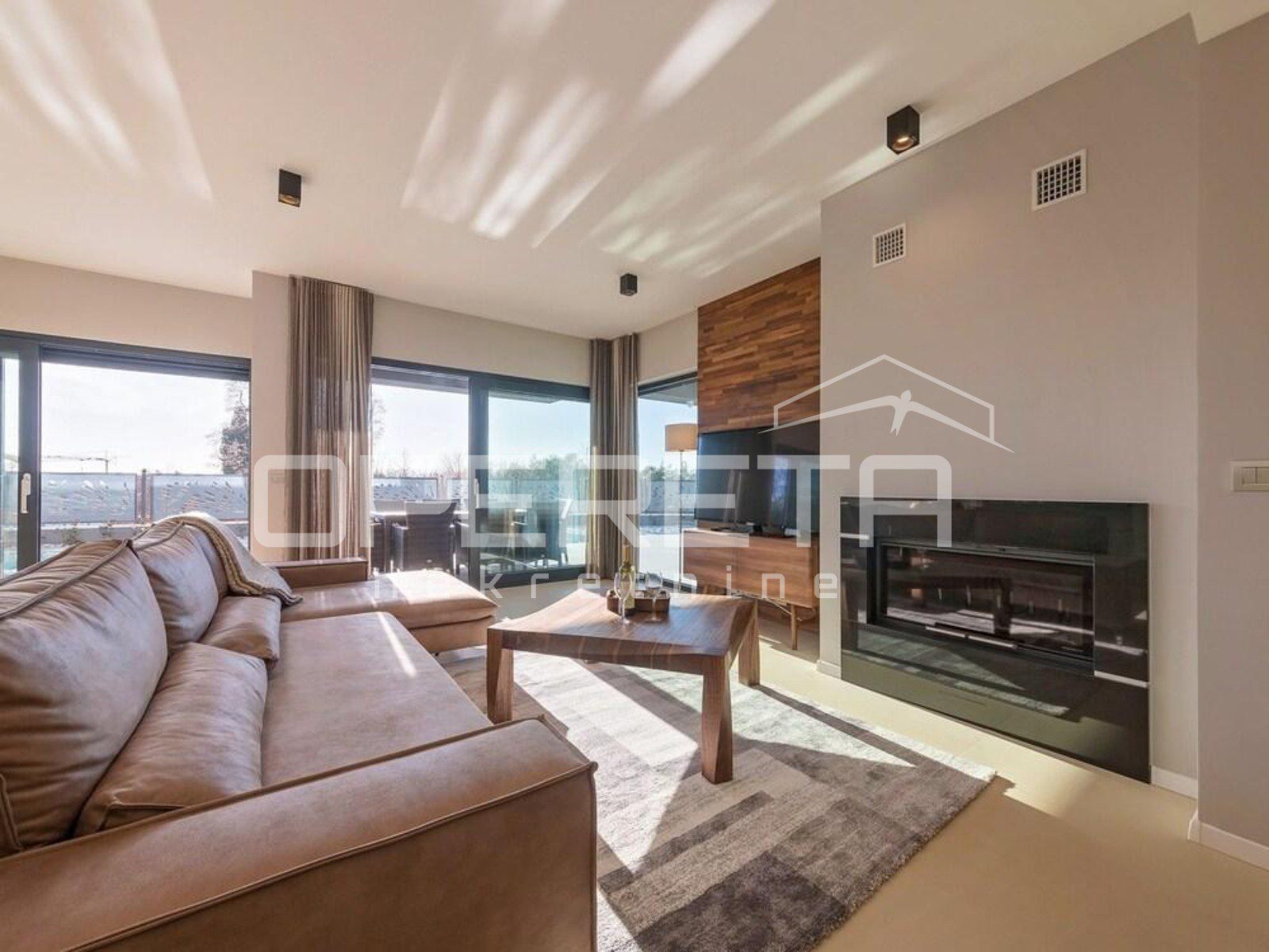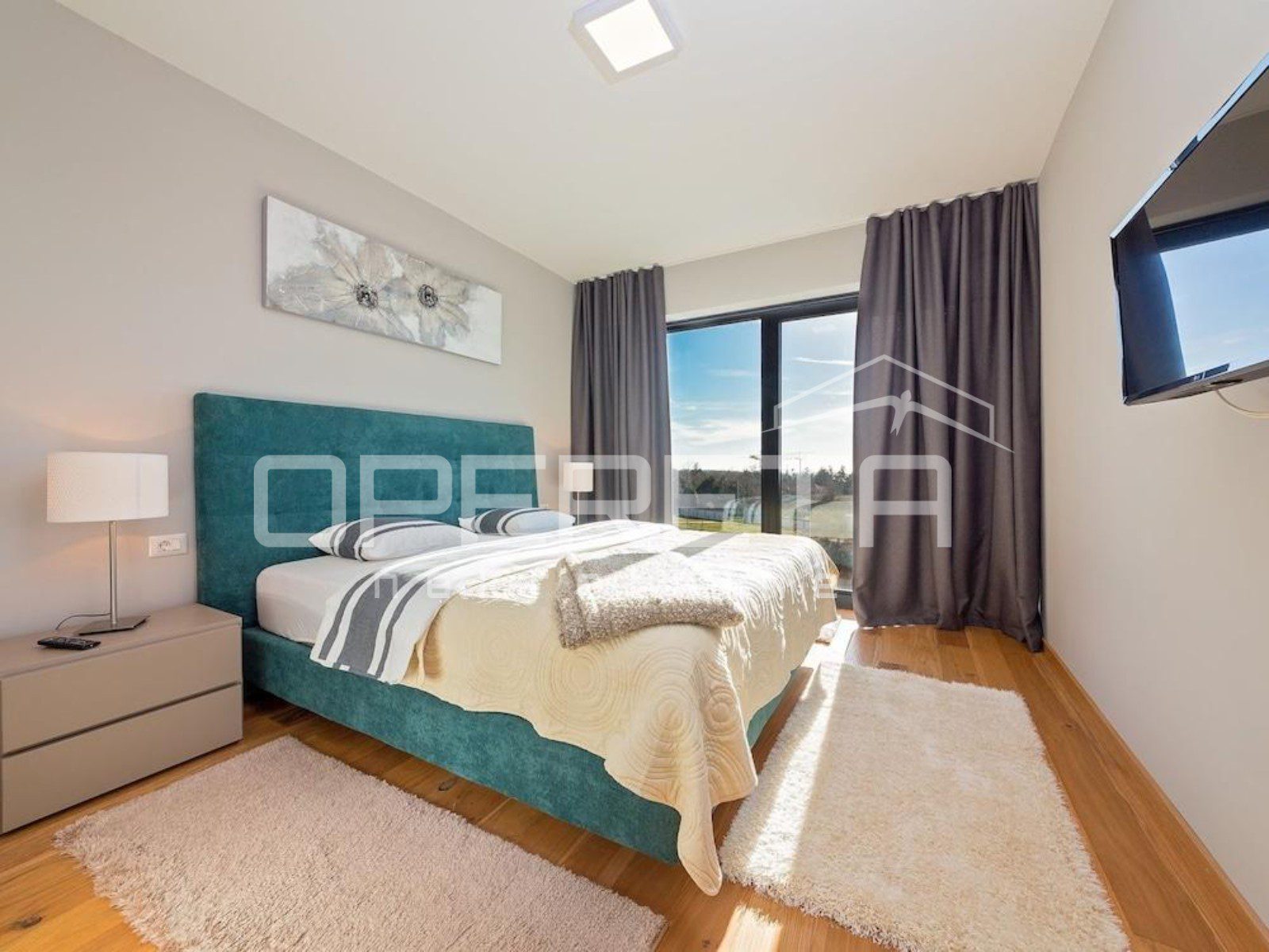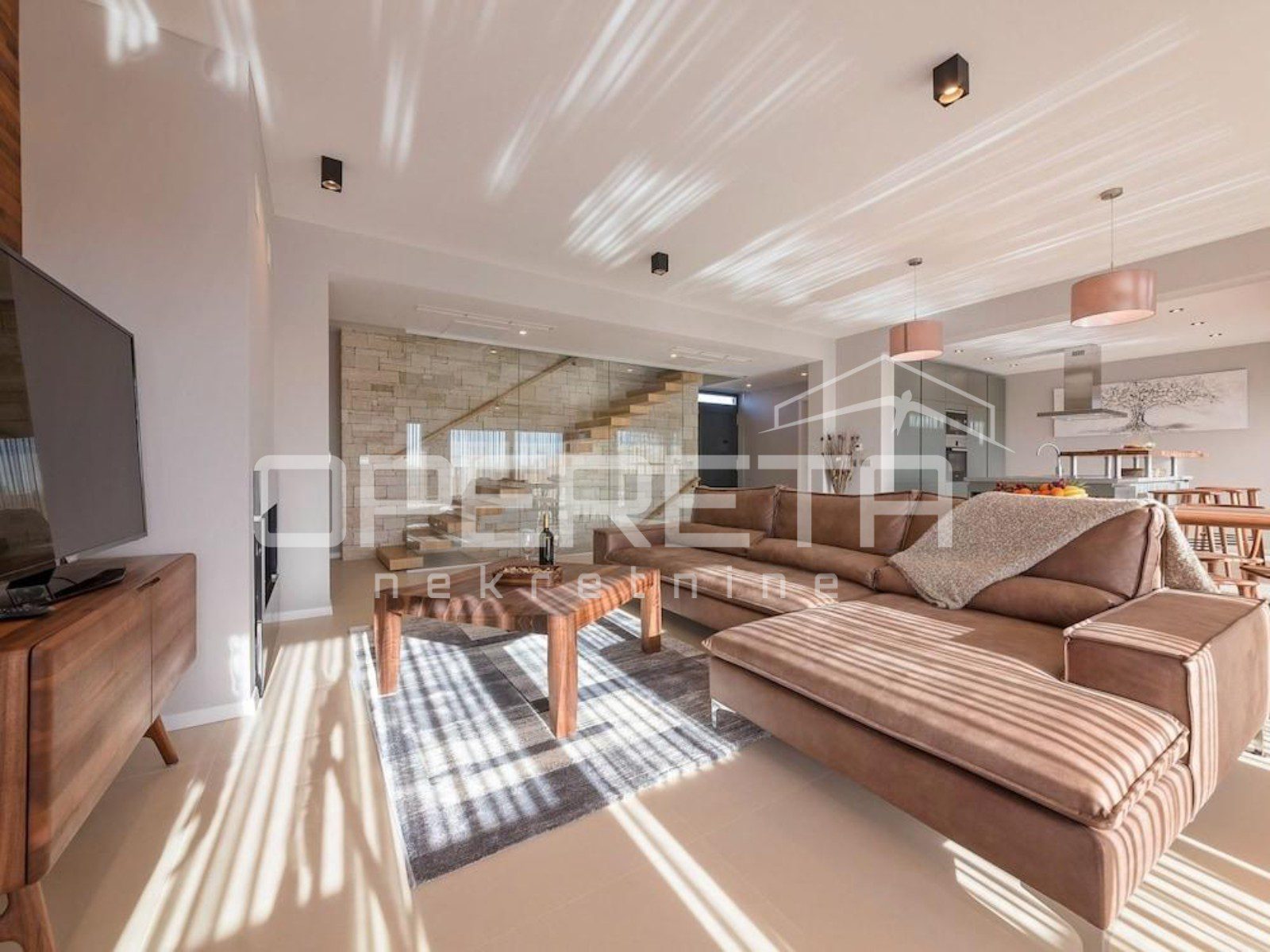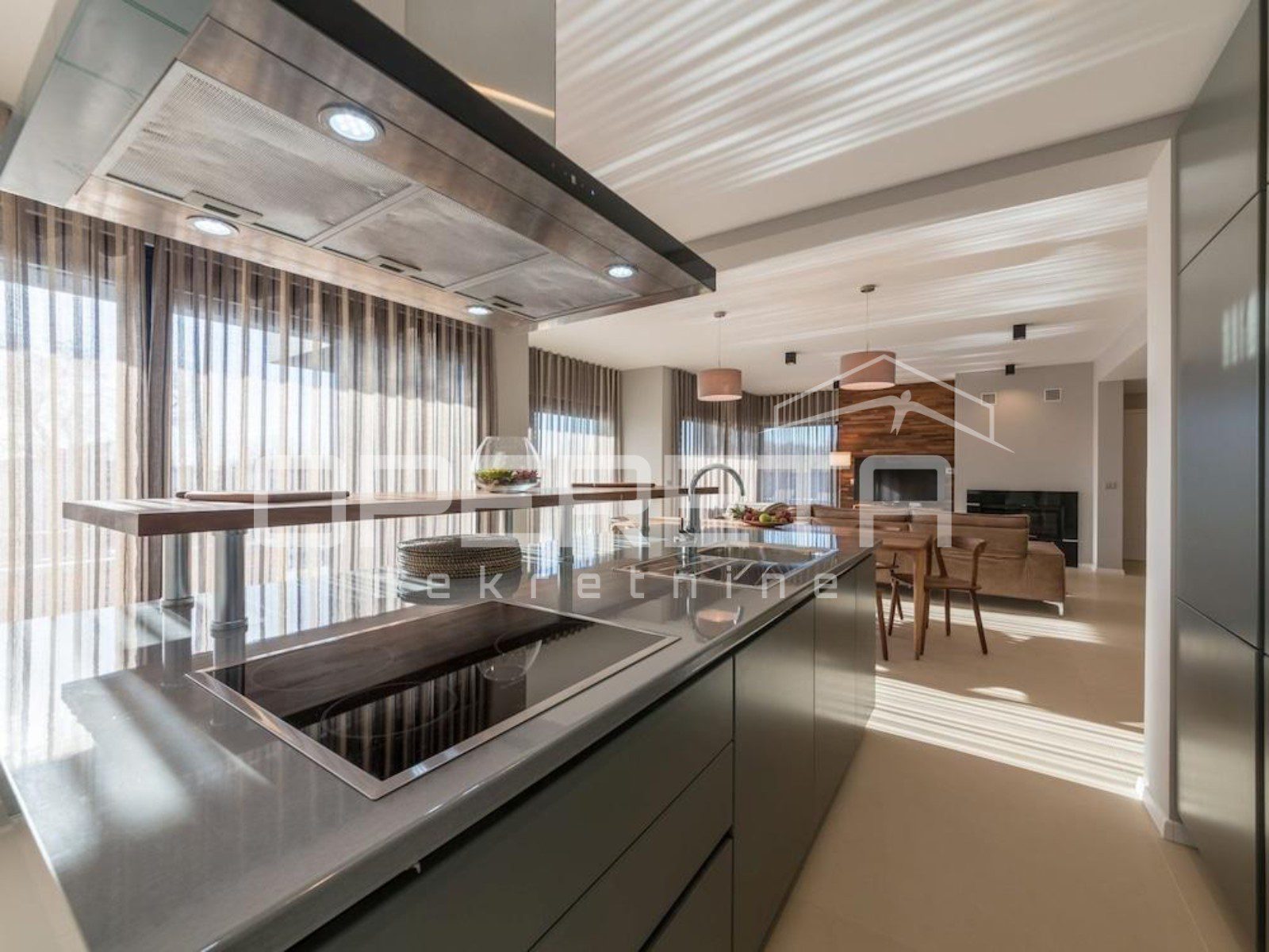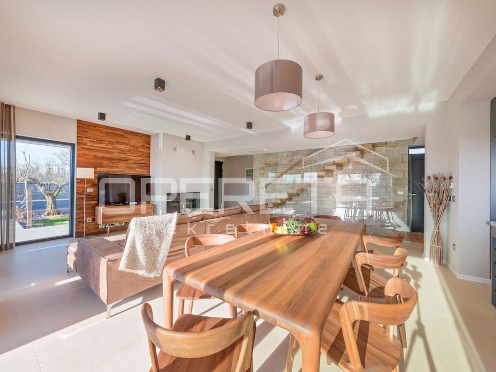 Unutrašnjost vile odiše prostranošću i svjetlošću, a srce prizemlja čini impresivan otvoreni prostor u kojem se isprepliću dnevni boravak, blagovaonica i vrhunska kuhinja s otokom. Cijeli je prostor opremljen pomno biranim dizajnerskim namještajem, dok velike staklene stijene otvaraju pogled prema bazenu i terasi, stvarajući besprijekoran prijelaz između unutarnjeg i vanjskog prostora. Za dodatnu toplinu i ugođaj, u prizemlju se nalazi i kamin na drva, uz praktično riješeno spremište, garderobu i gostinjski toalet.