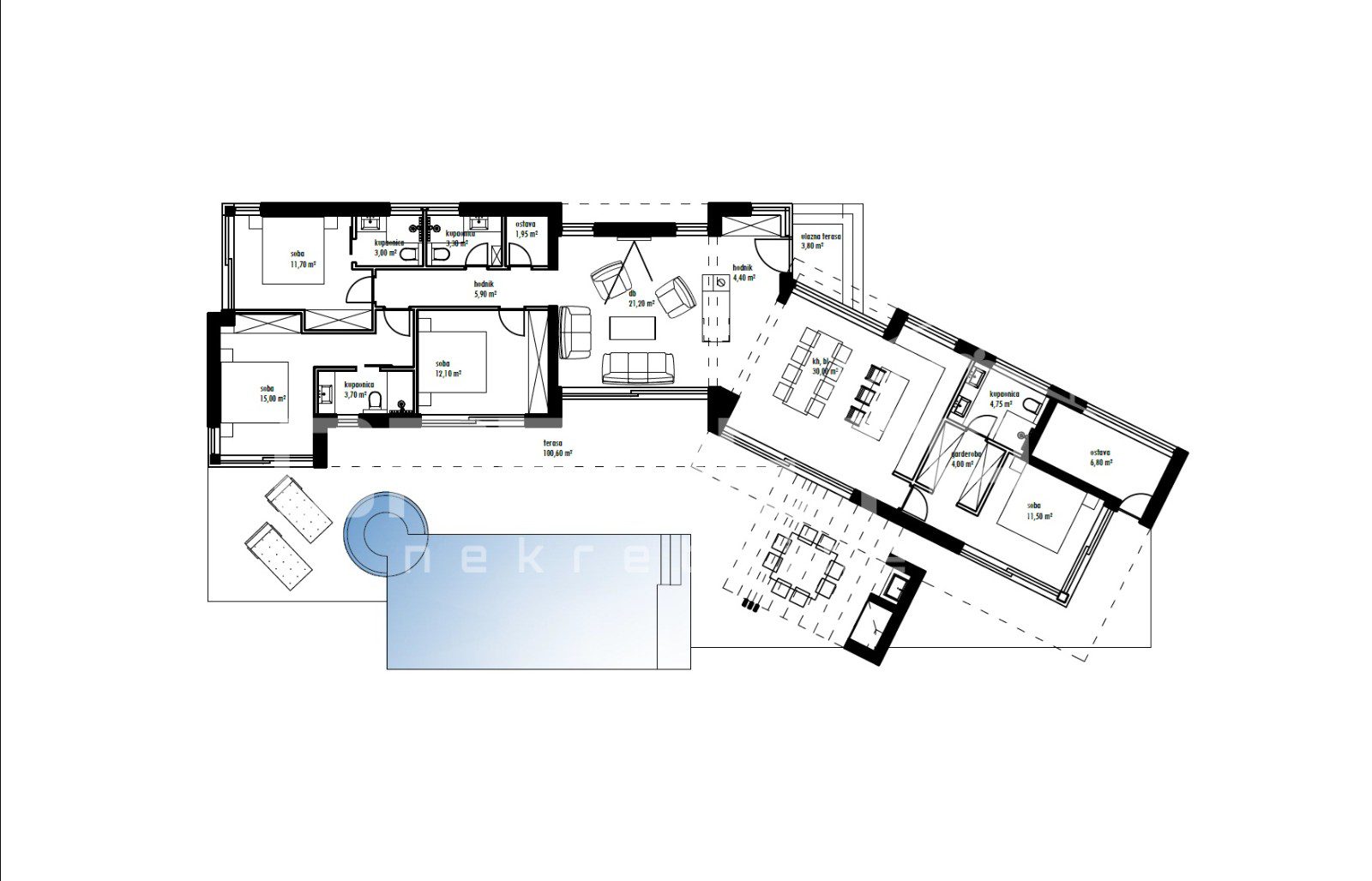 Na terasi, osim bazena, predviđen je i veliki prostor za roštilj. Terasa ima površinu veću od 100 m².