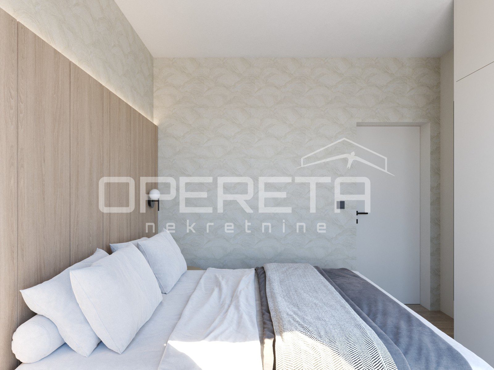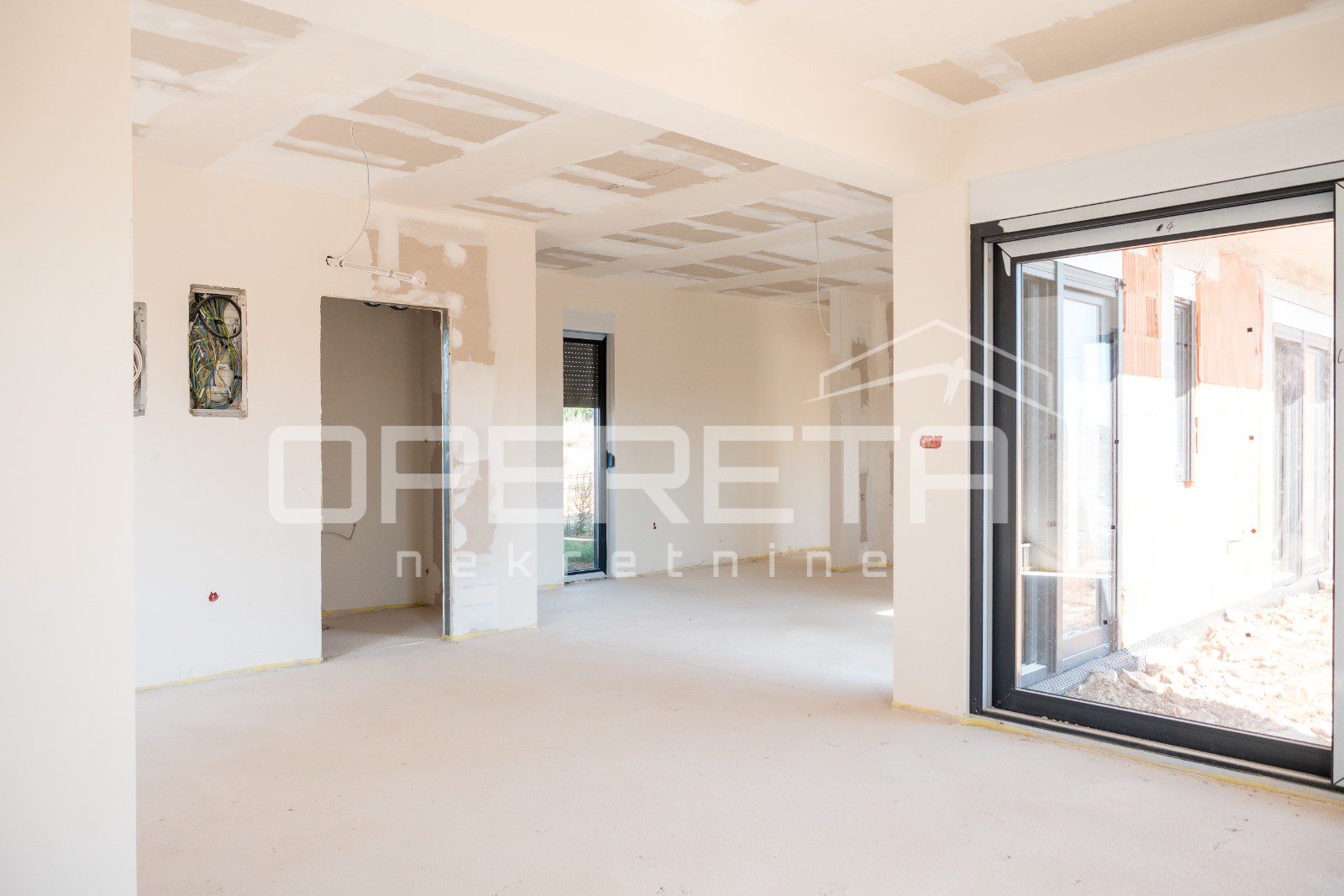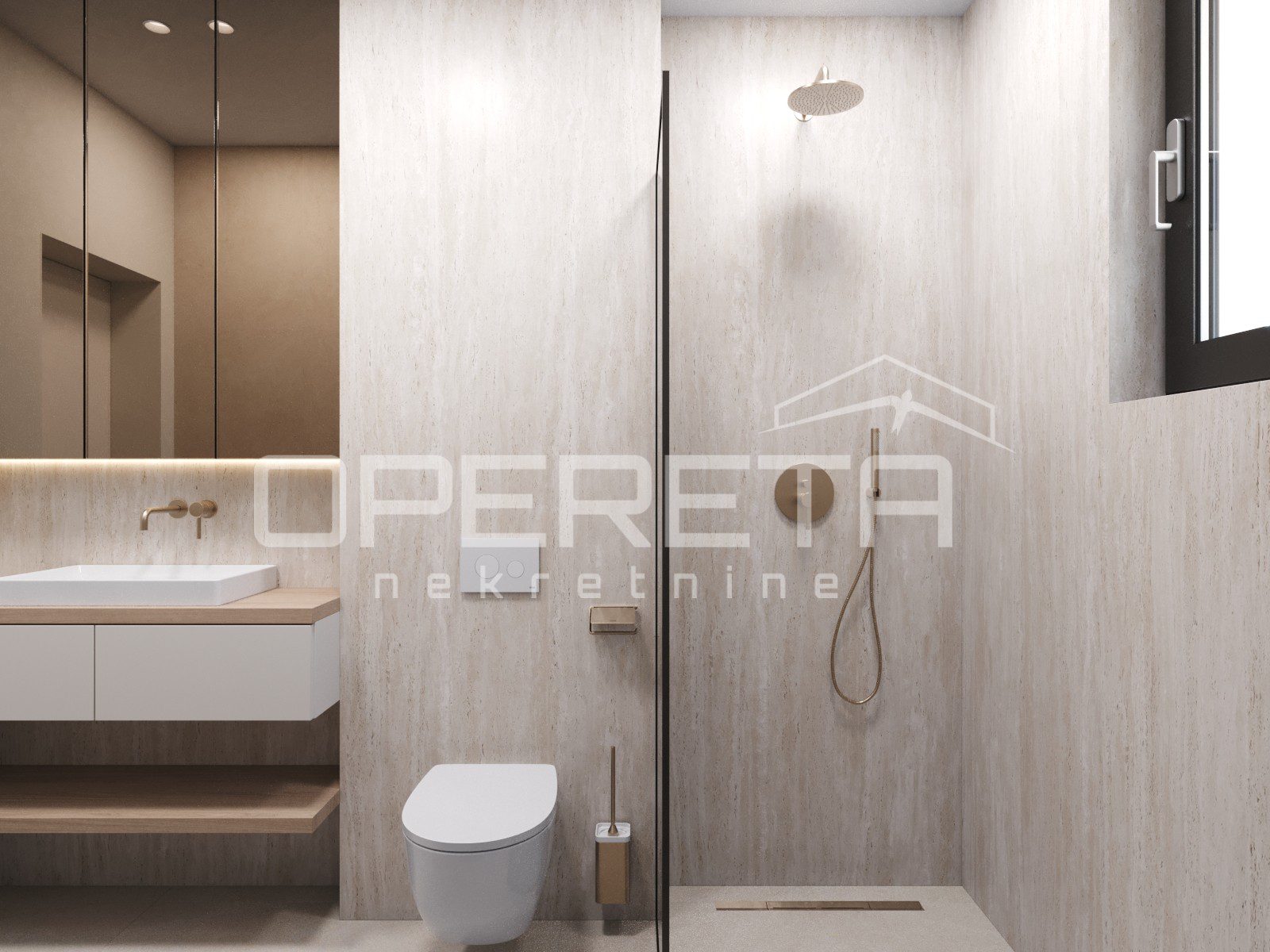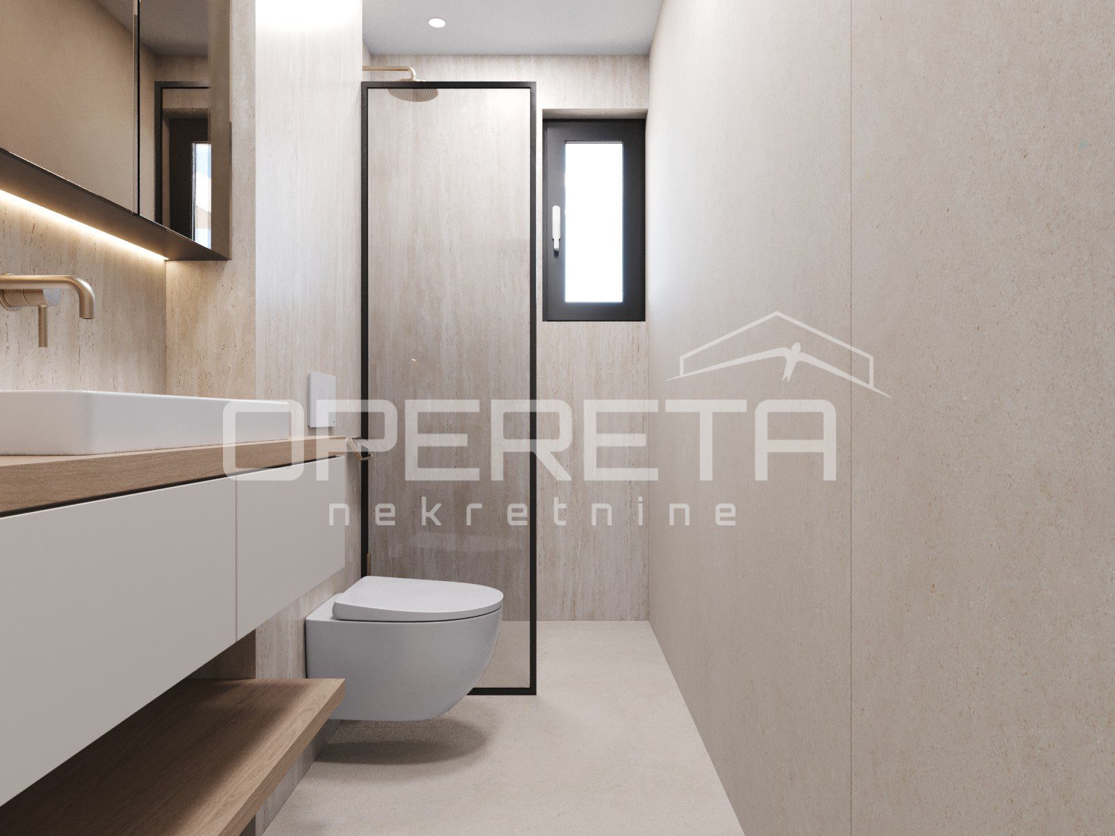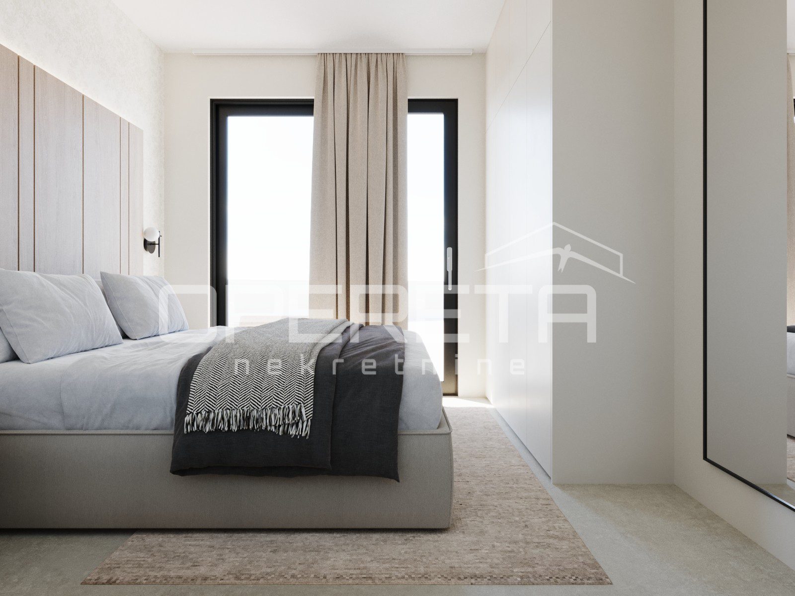 Prostor je organiziran na dvije etaže. U prizemlju se nalazi prostrana open space kuhinja s blagovaonicom i dnevnim boravkom površine 46 m², obasjana prirodnim svjetlom zahvaljujući velikim staklenim stijenama koje vode prema dvorištu i bazenu. Na istoj etaži nalazi se i treća spavaća soba uz toalet. Kat donosi glavnu spavaću sobu s vlastitom kupaonicom te dodatnu sobu s odvojenom kupaonicom.