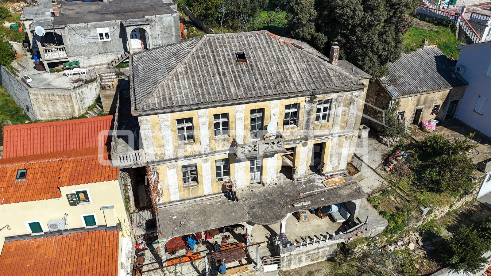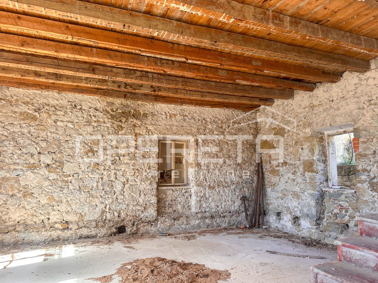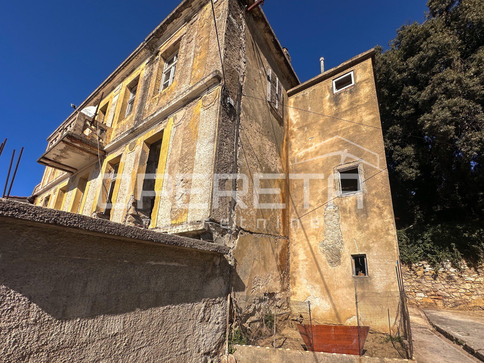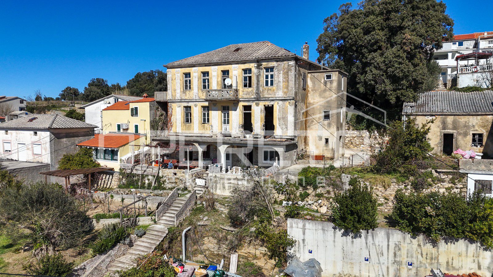 Glavna zgrada ima oko 450 m2 bruto površine, raspoređenih na tri etaže i tavan, a izgrađena je u kamenoj konstrukciji. S prednje strane ističu se terase s pogledom na more, dok se u prizemlju već nalazi djelomično uređen apartman i rustikalna konoba, koja ostavlja prostor za daljnje oblikovanje prema vlastitim idejama.
