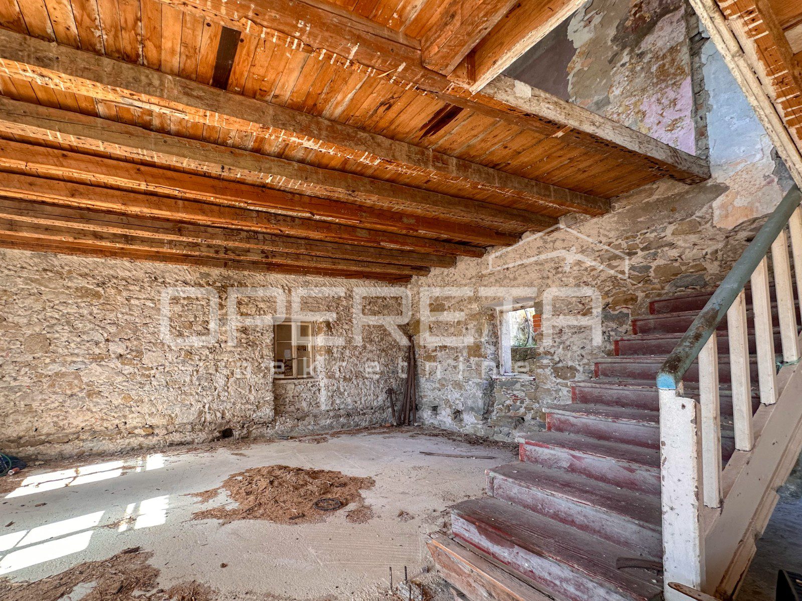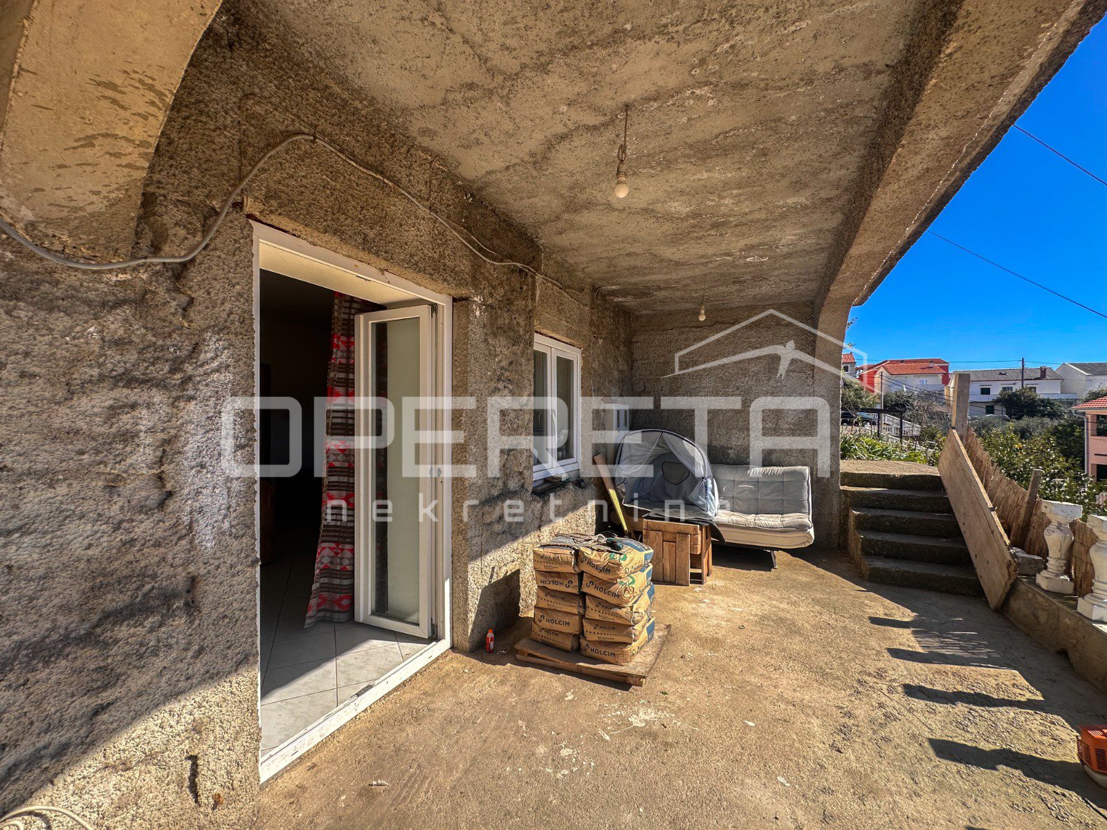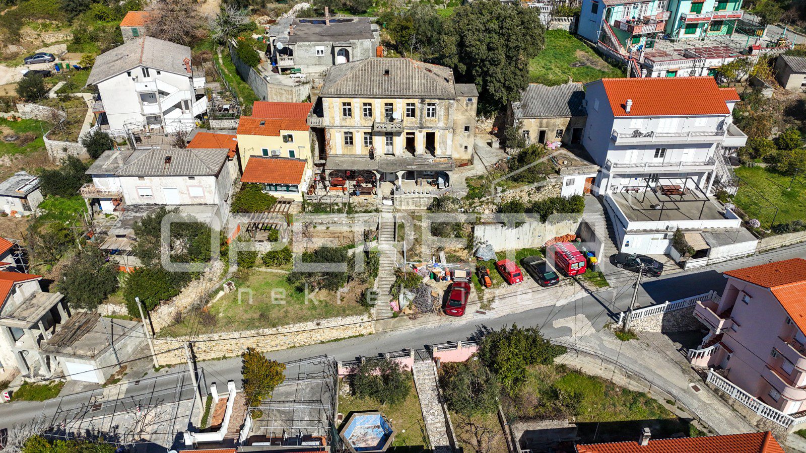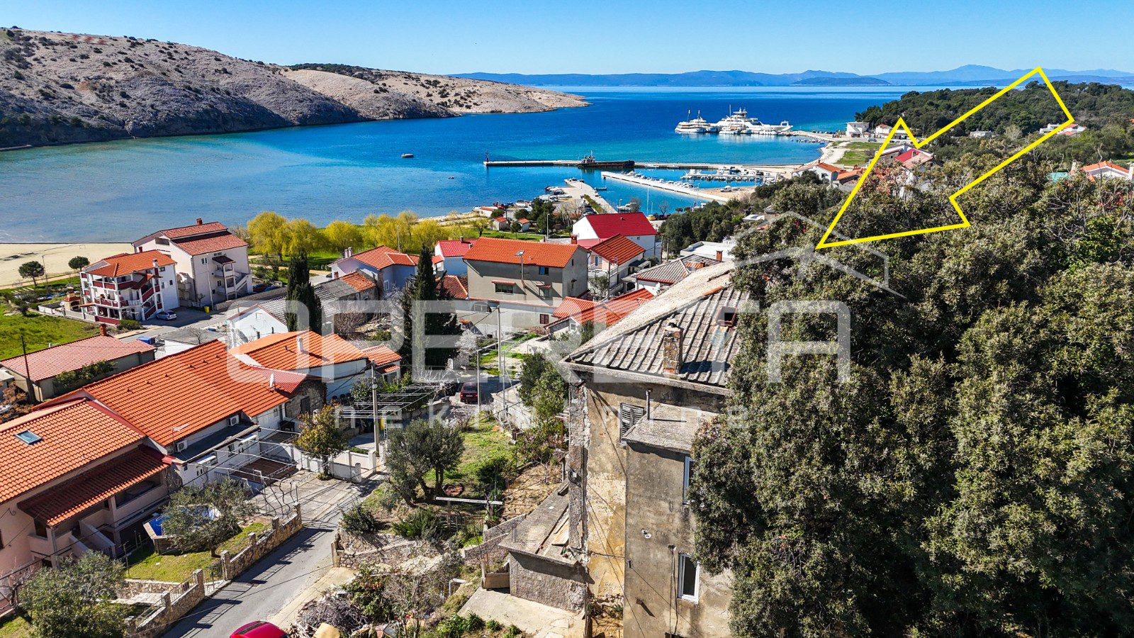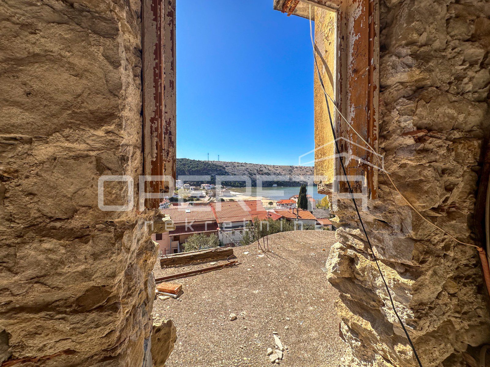 Glavna zgrada ima oko 450 m2 bruto površine, raspoređenih na tri etaže i tavan, a izgrađena je u kamenoj konstrukciji. S prednje strane ističu se terase s pogledom na more, dok se u prizemlju već nalazi djelomično uređen apartman i rustikalna konoba, koja ostavlja prostor za daljnje oblikovanje prema vlastitim idejama.