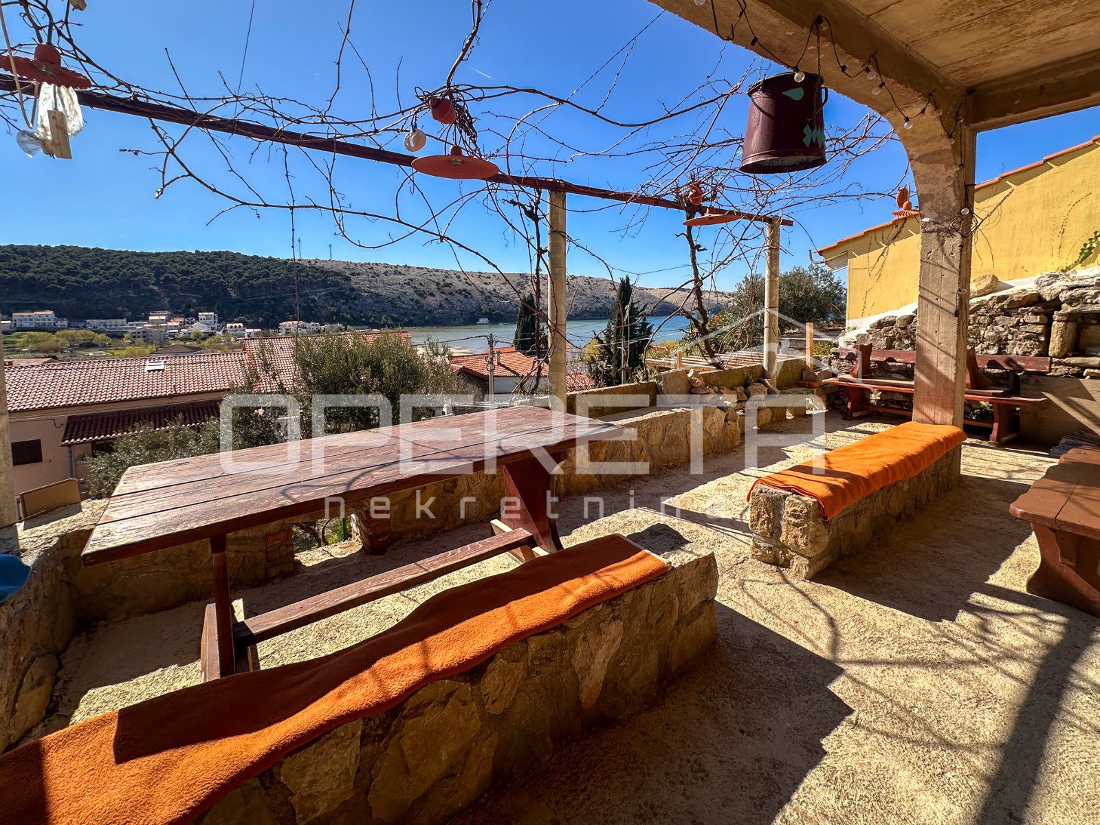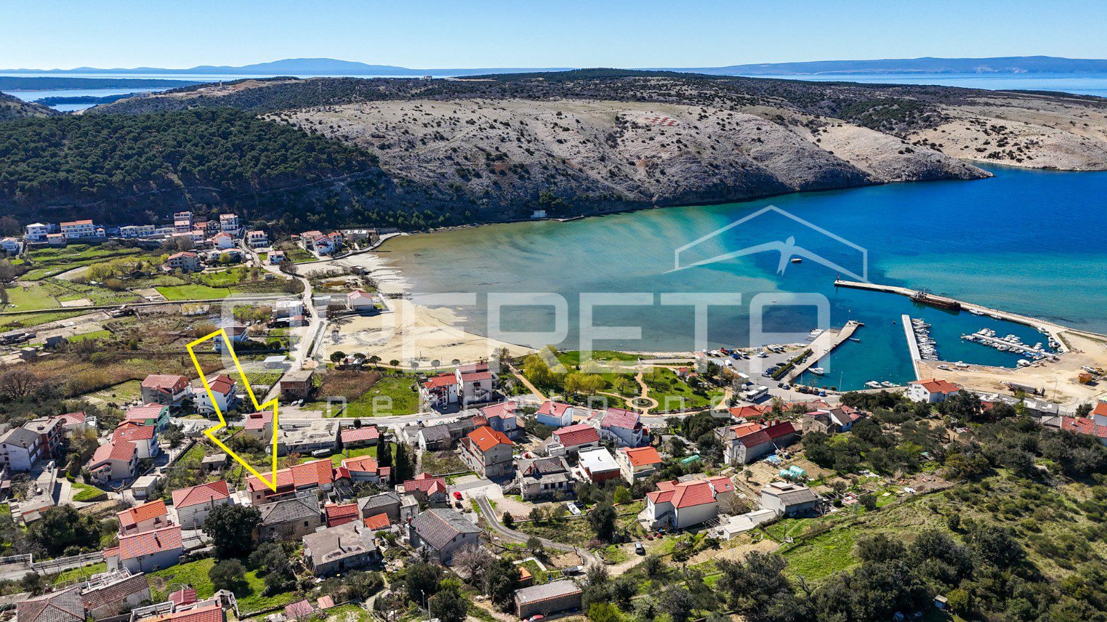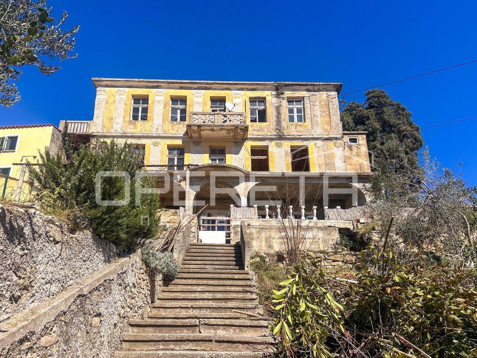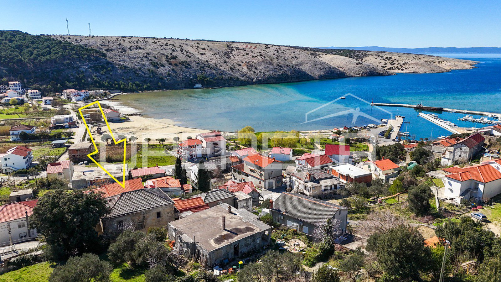 Glavna zgrada ima oko 450 m2 bruto površine, raspoređenih na tri etaže i tavan, a izgrađena je u kamenoj konstrukciji. S prednje strane ističu se terase s pogledom na more, dok se u prizemlju već nalazi djelomično uređen apartman i rustikalna konoba, koja ostavlja prostor za daljnje oblikovanje prema vlastitim idejama.