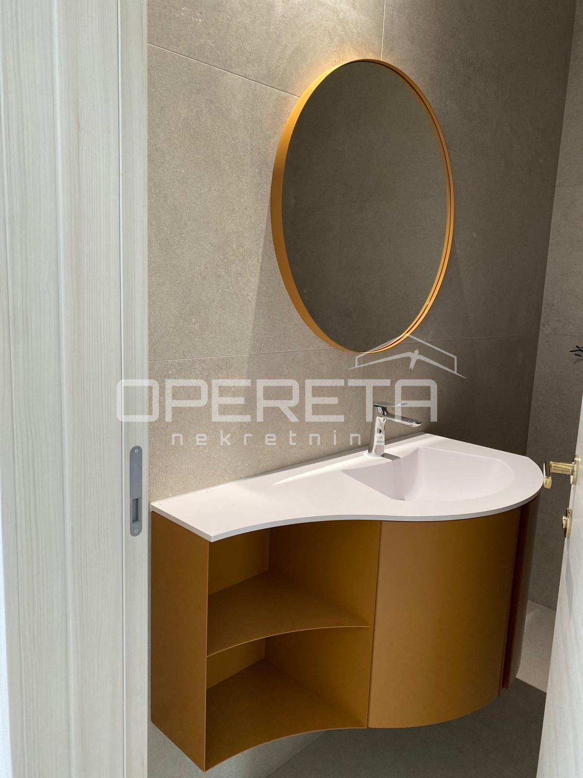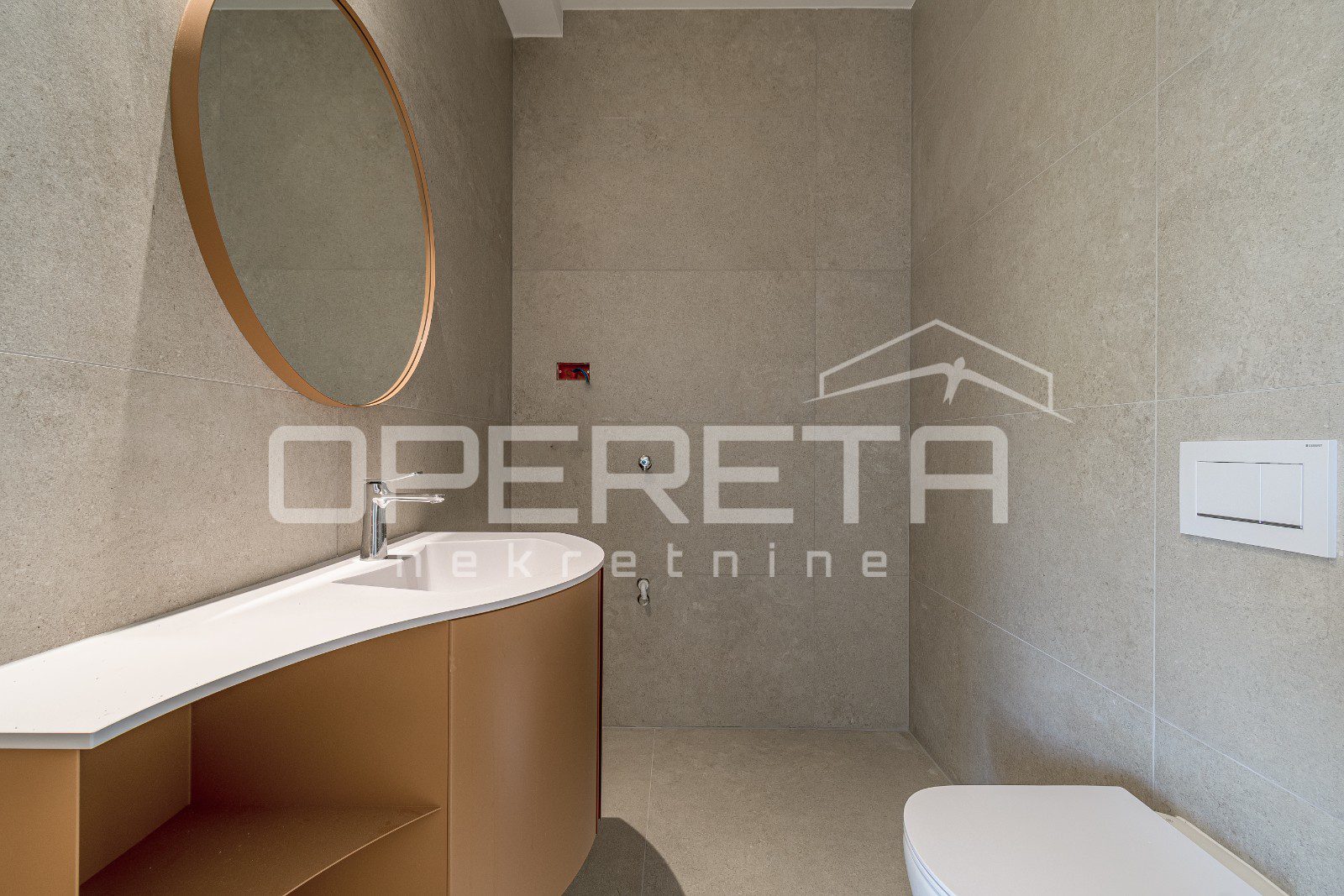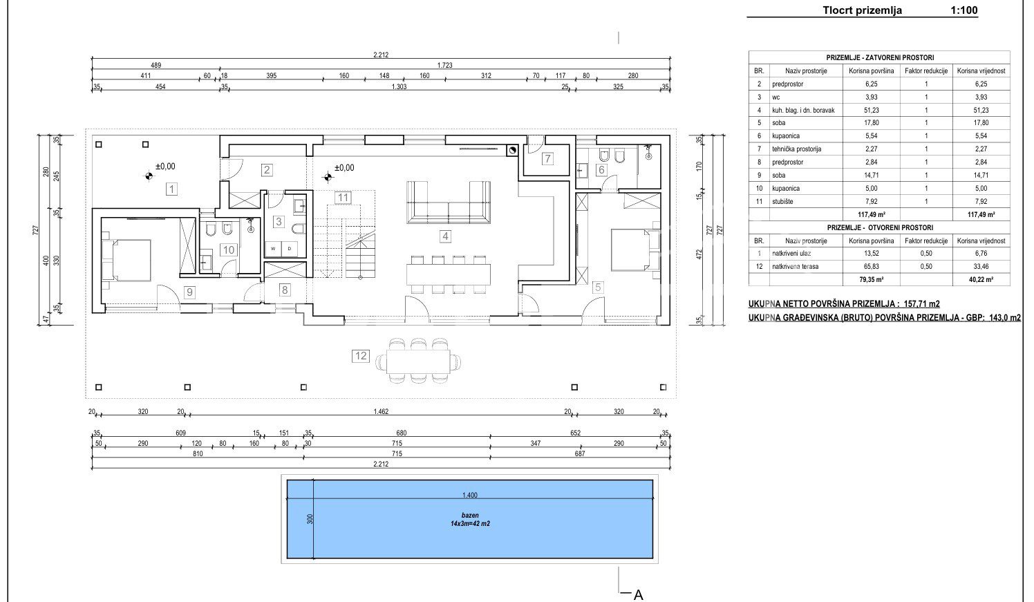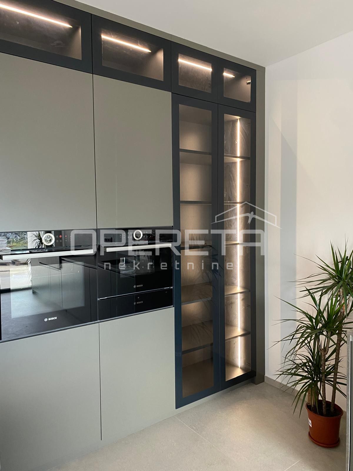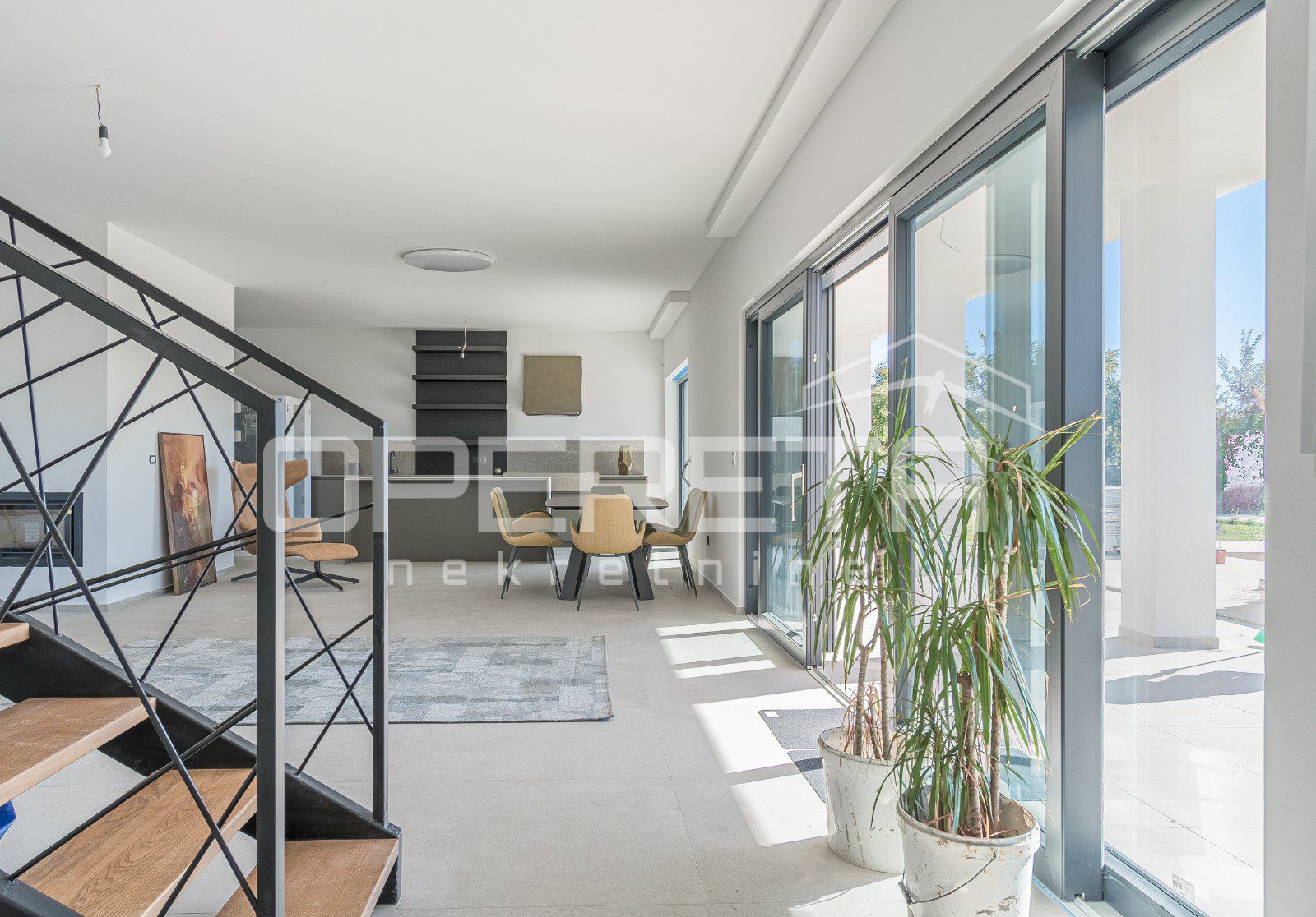 U prizemlju se nalaze dvije spavaće sobe s vlastitim kupaonicama, prostrani dnevni boravak otvorenog tipa s blagovaonicom te kuhinja opremljena prema najvišim suvremenim standardima. Gostinjski toalet uključuje perilicu i sušilicu rublja. Velike staklene stijene omogućuju izlaz na prostranu terasu s uređenom okućnicom i bazenom površine 42 m², s pogledom na šumu i more.