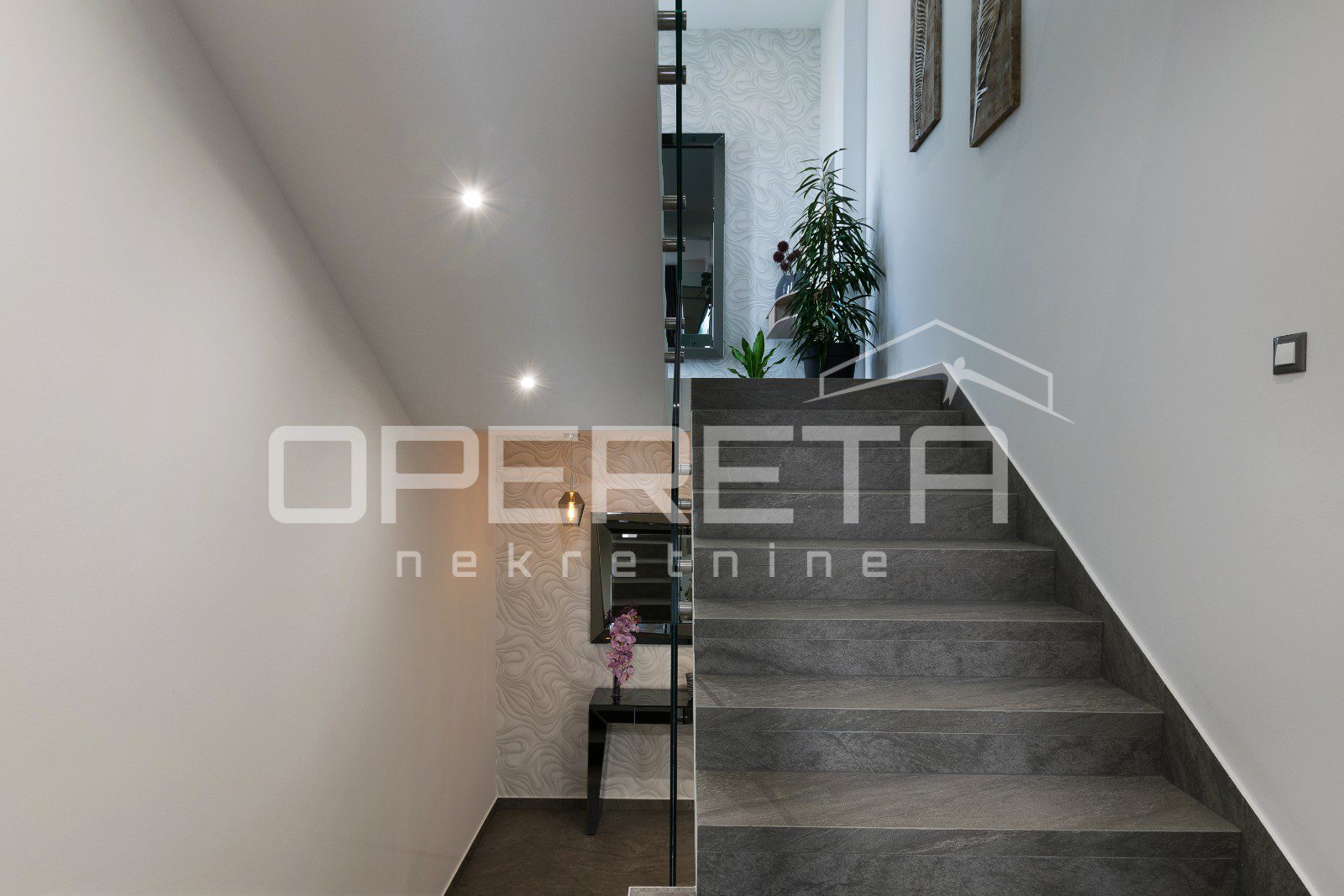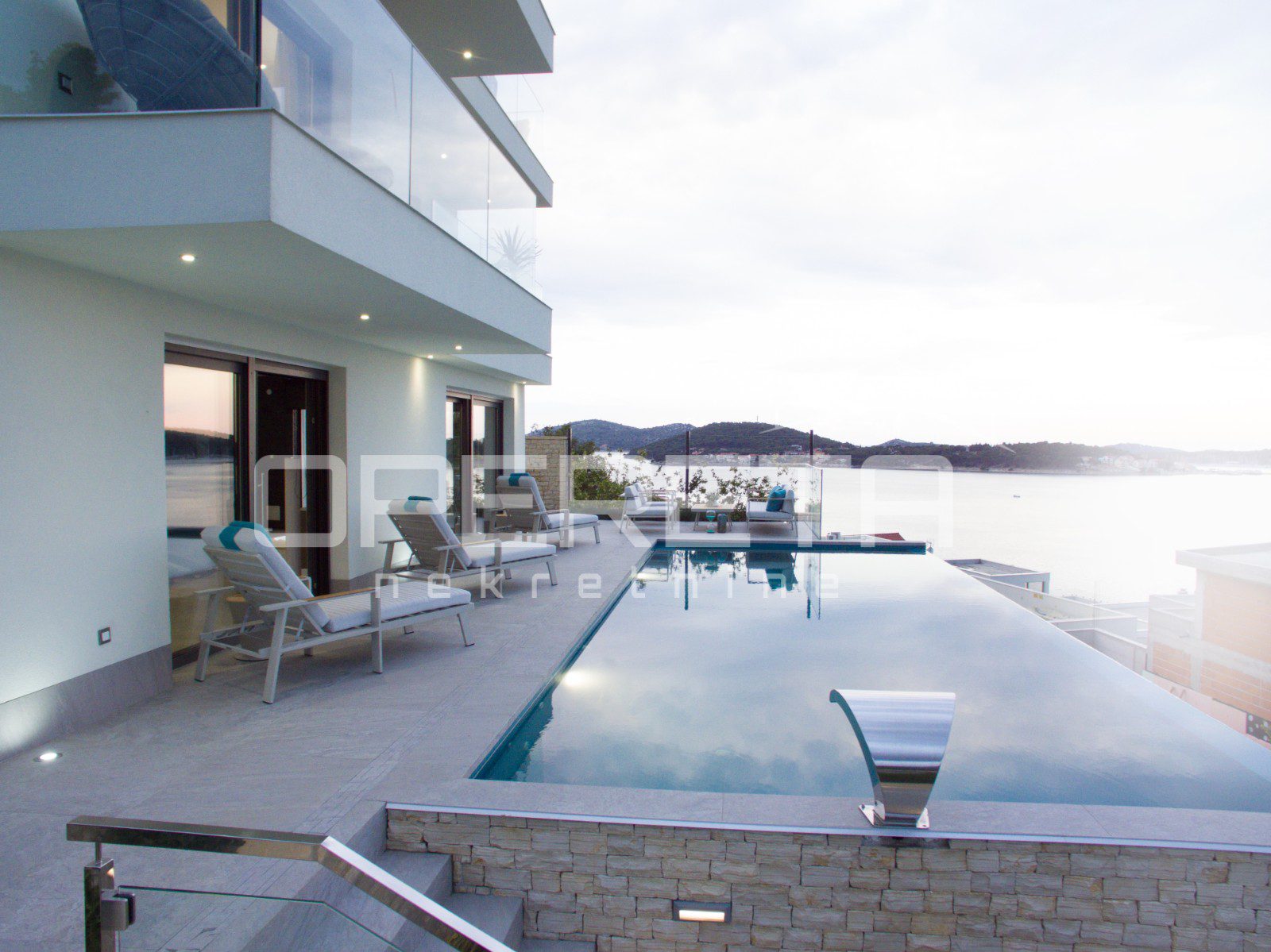 U prizemlju se nalazi prostor za opuštanje – privatni wellness s teretanom, saunom i kupaonicom, s izlazom na prostranu terasu uz bazen. Kat iznad rezerviran je za tri komforne spavaće sobe, svaka s vlastitom kupaonicom i terasom, dok se na najgornjoj etaži smjestio prostrani dnevni prostor s kuhinjom i blagovaonicom, te dodatna spavaća soba s vlastitom kupaonicom i zasebnim toaletom.
