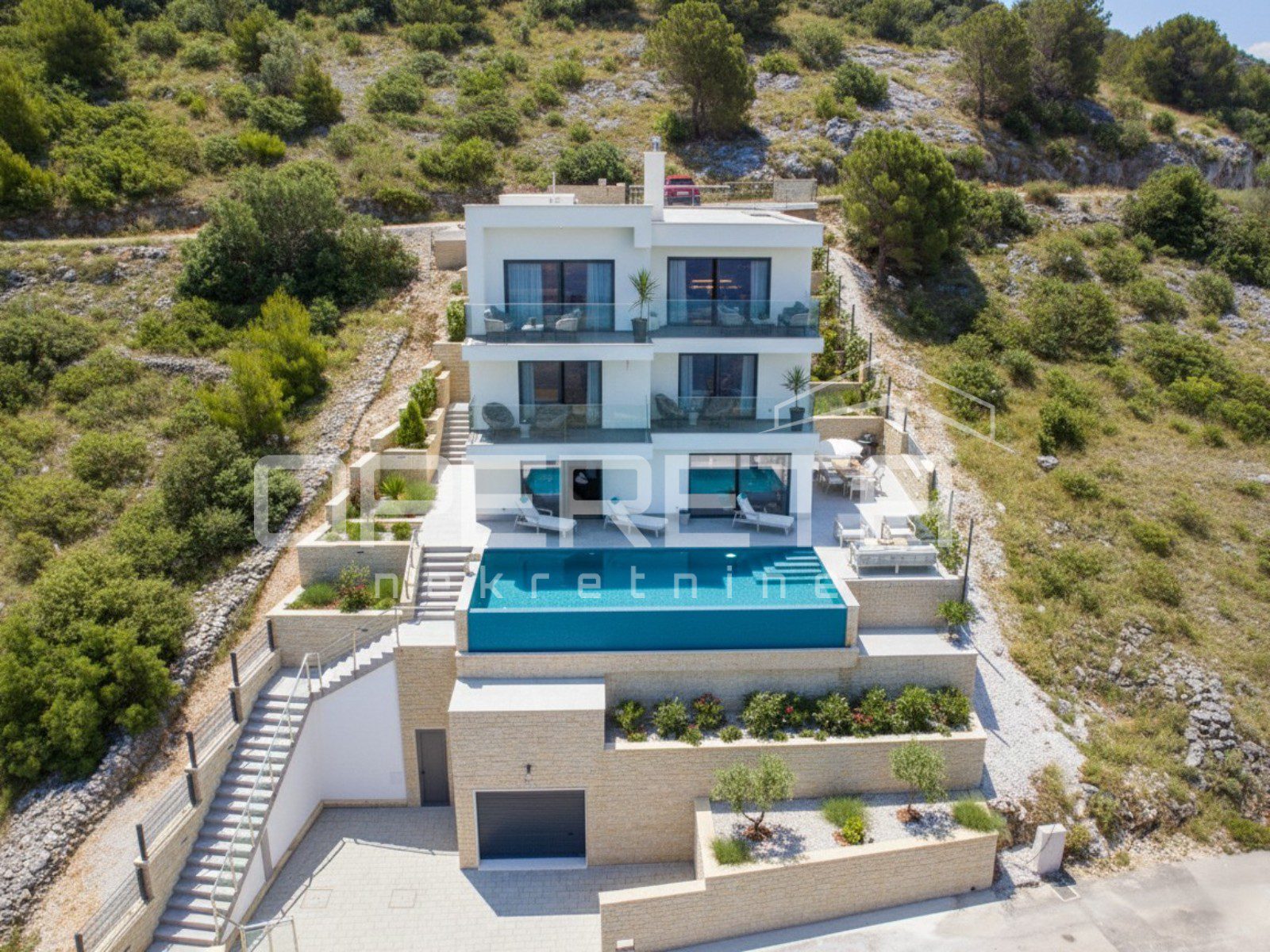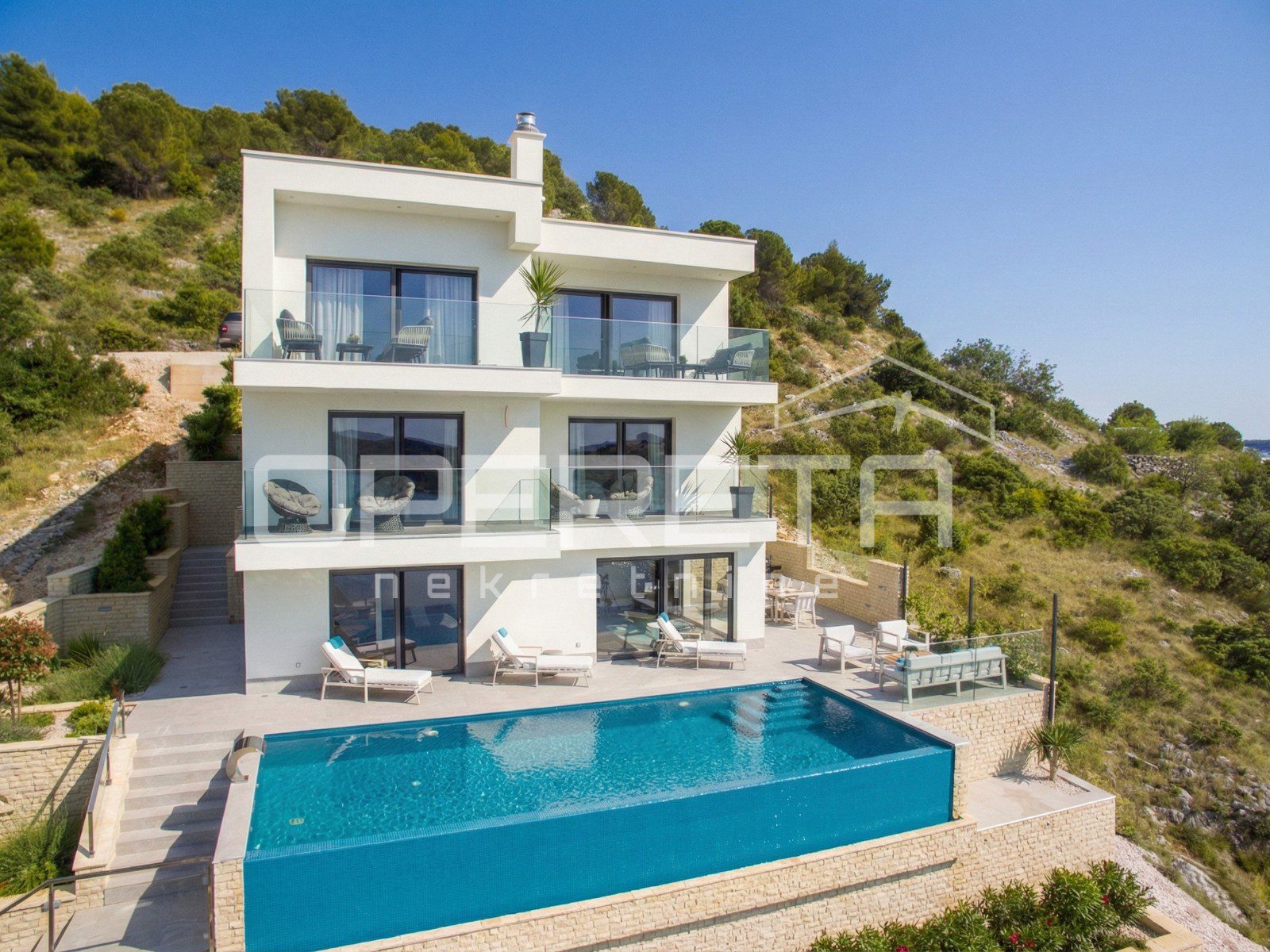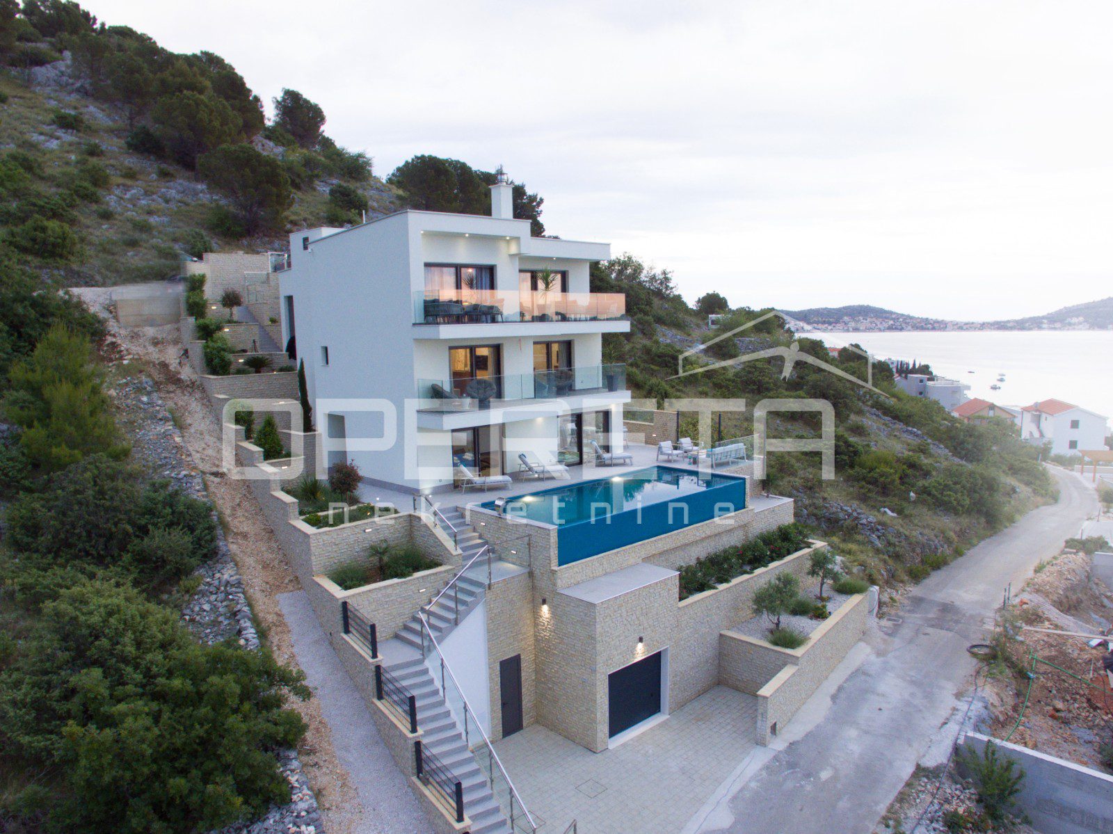 Na samo 100 metara od mora, u mirnom i uređenom naselju Zatoglav pokraj Rogoznice, nalazi se moderna vila koja na tri etaže nudi savršenu ravnotežu udobnosti, privatnosti i suvremenog dizajna. Smještena na blago povišenoj poziciji, vila pruža pogled prema moru, a pažljivo osmišljeni raspored prostorija omogućava ugodno stanovanje tijekom cijele godine.