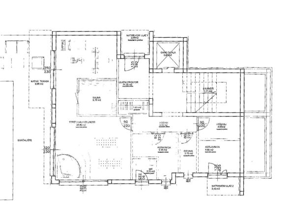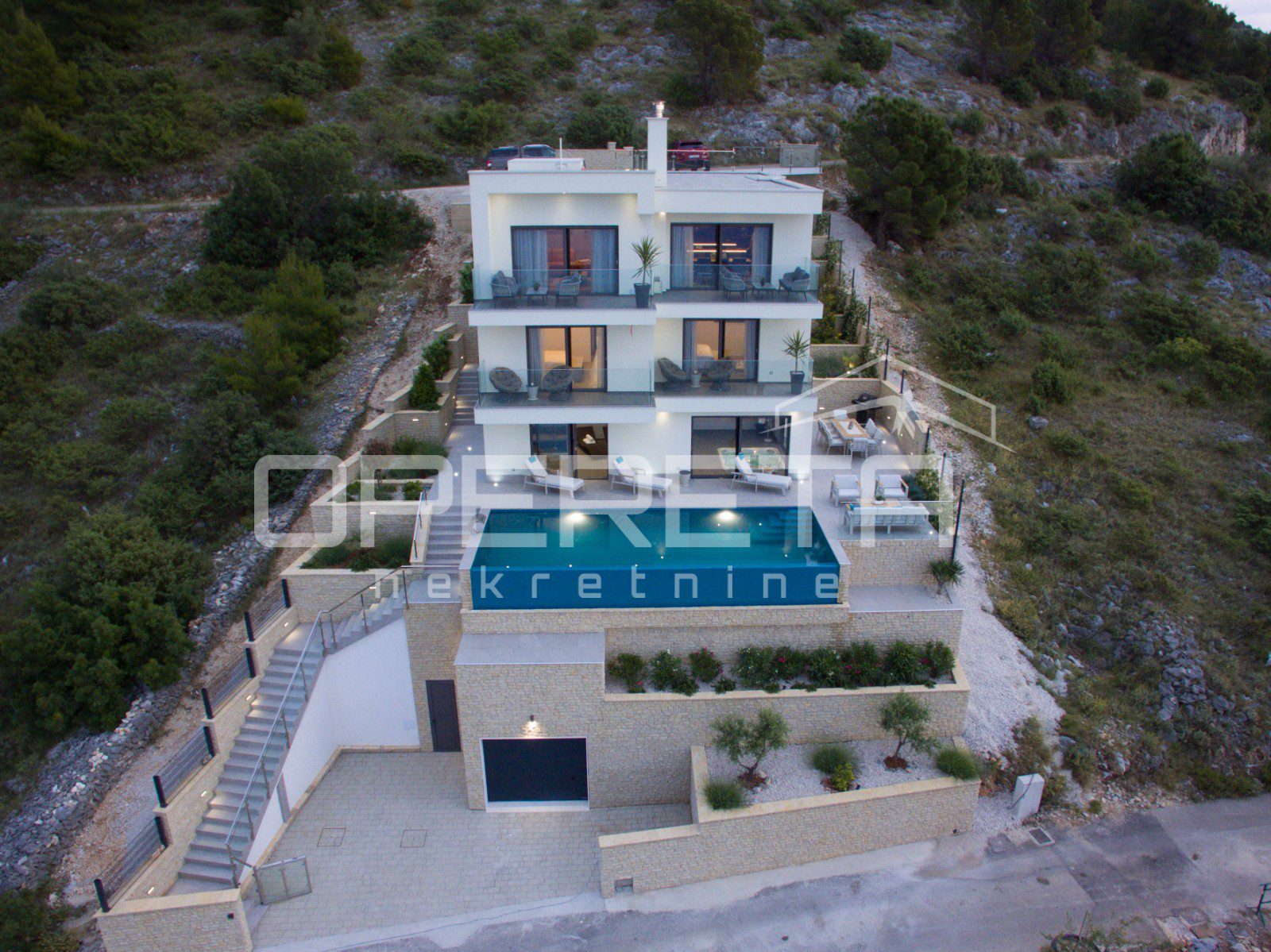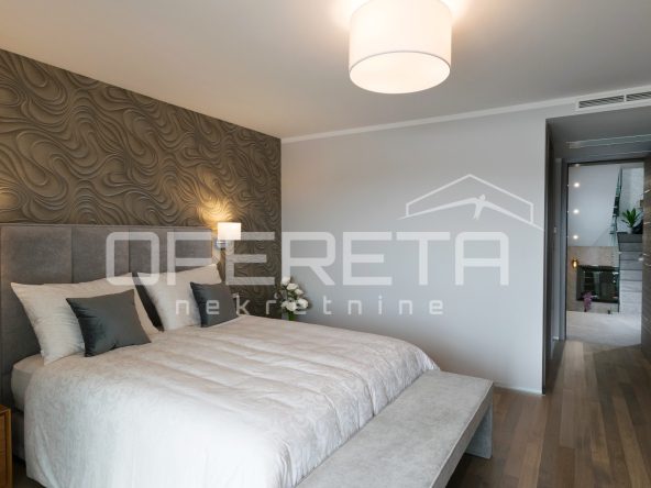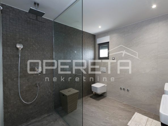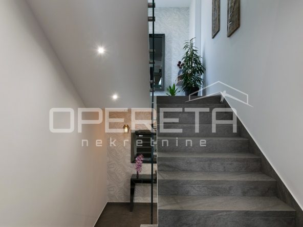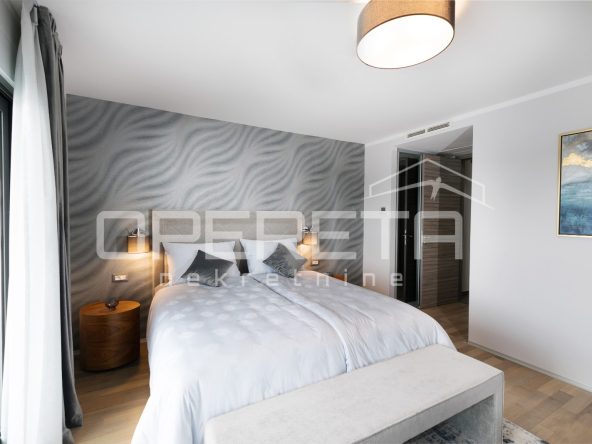 U prizemlju se nalazi prostor za opuštanje – privatni wellness s teretanom, saunom i kupaonicom, s izlazom na prostranu terasu uz bazen. Kat iznad rezerviran je za tri komforne spavaće sobe, svaka s vlastitom kupaonicom i terasom, dok se na najgornjoj etaži smjestio prostrani dnevni prostor s kuhinjom i blagovaonicom, te dodatna spavaća soba s vlastitom kupaonicom i zasebnim toaletom.