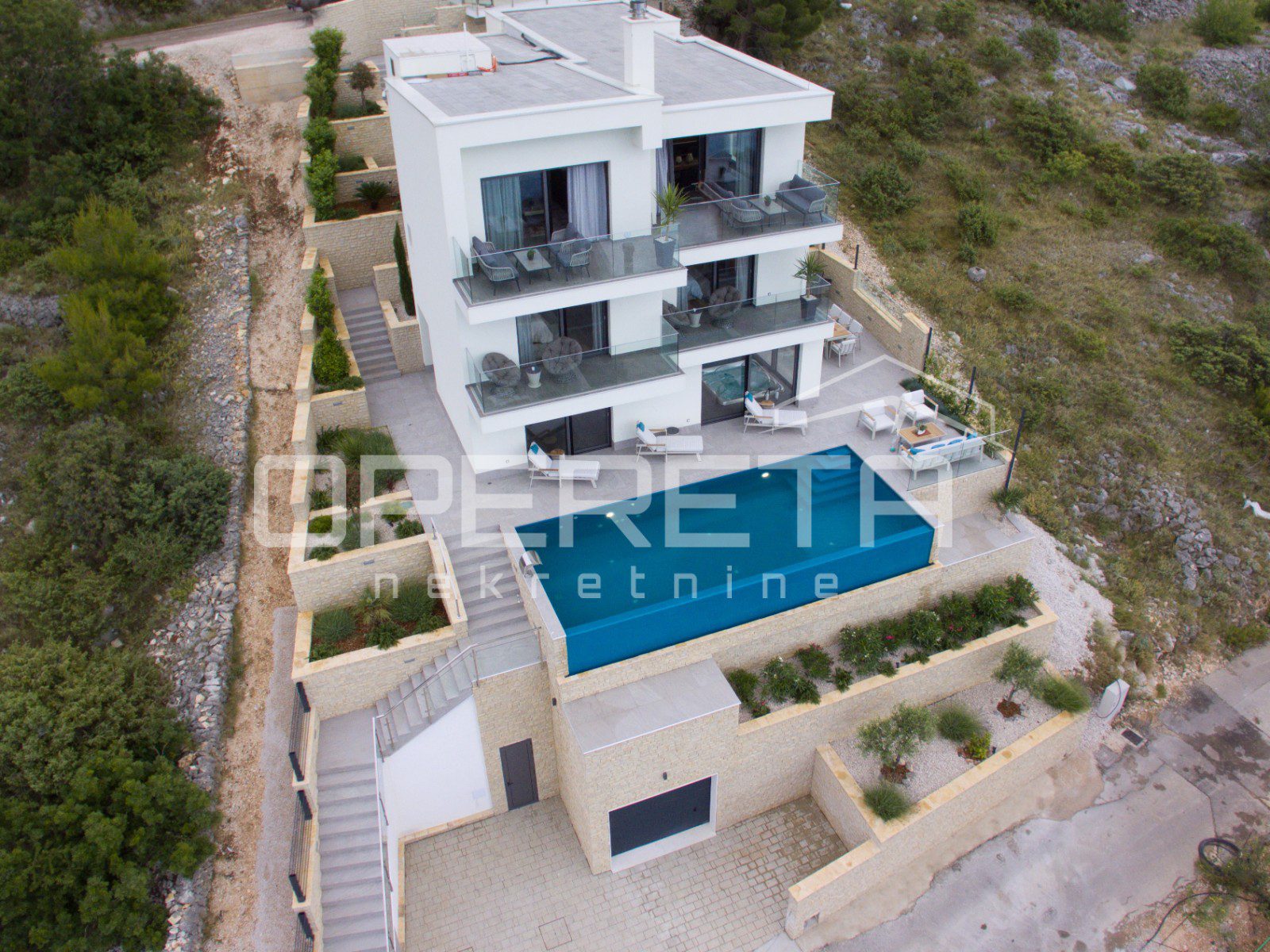 Na samo 100 metara od mora, u mirnom i uređenom naselju Zatoglav pokraj Rogoznice, nalazi se moderna vila koja na tri etaže nudi savršenu ravnotežu udobnosti, privatnosti i suvremenog dizajna. Smještena na blago povišenoj poziciji, vila pruža pogled prema moru, a pažljivo osmišljeni raspored prostorija omogućava ugodno stanovanje tijekom cijele godine.