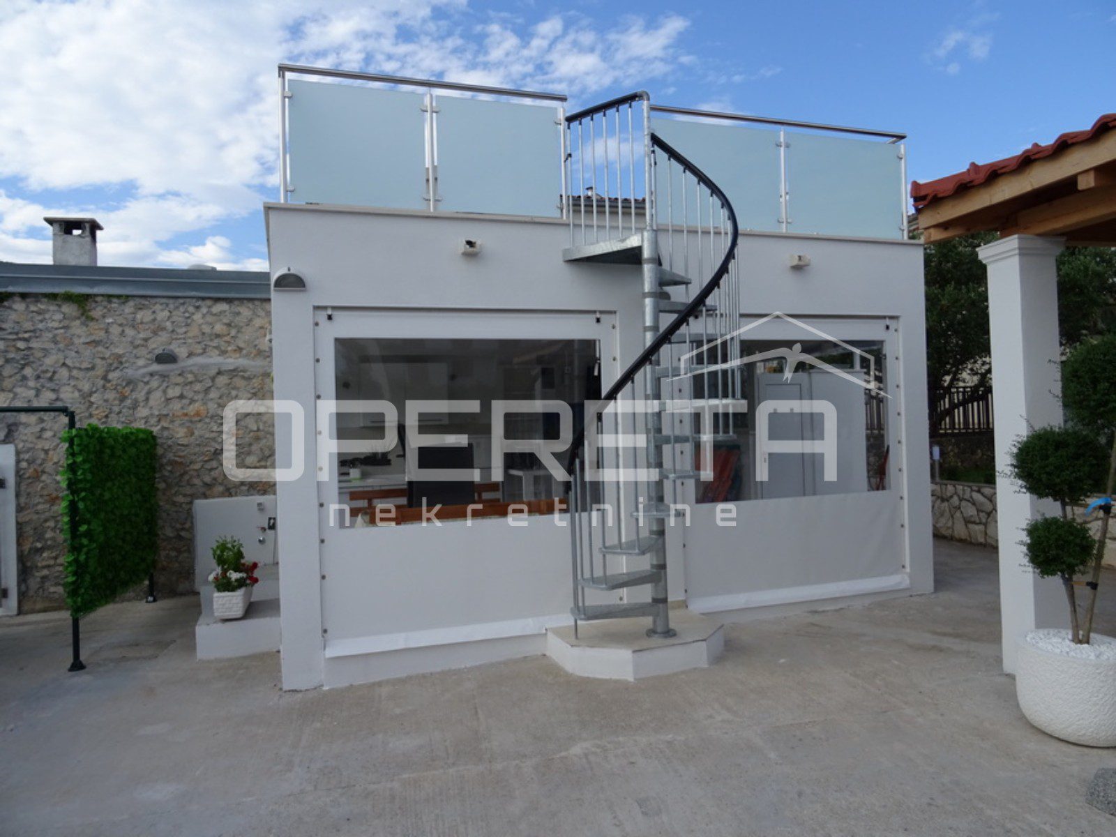 Okućnica kuće sadrži ljetnu kuhinju, bazen sa sunčalištem, jacuzzi, vanjski tuš, roštilj te prostor za odmaranje. Parking je osiguran za šest vozila, od čega dva mjesta imaju natkriveni prostor.