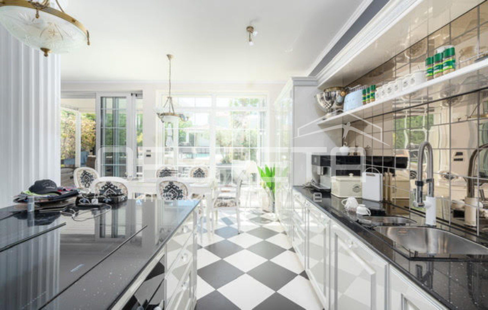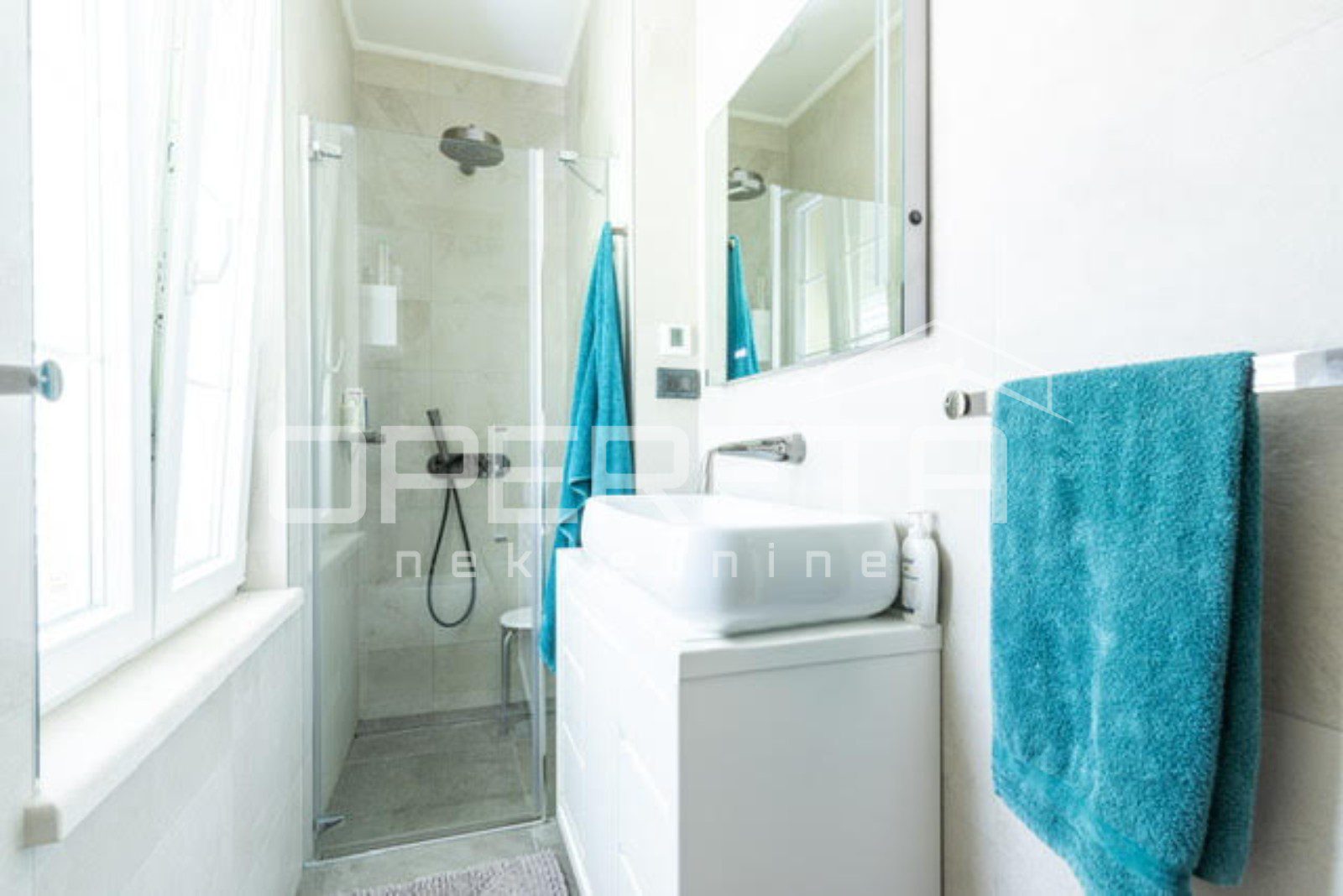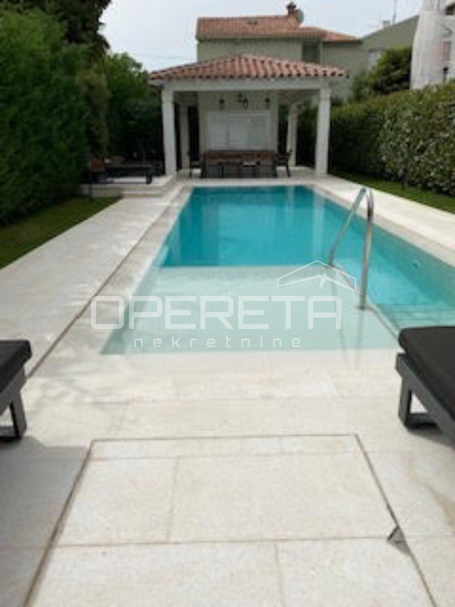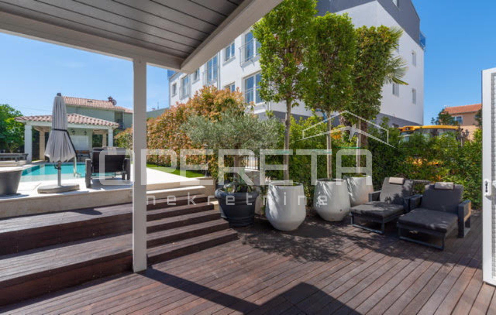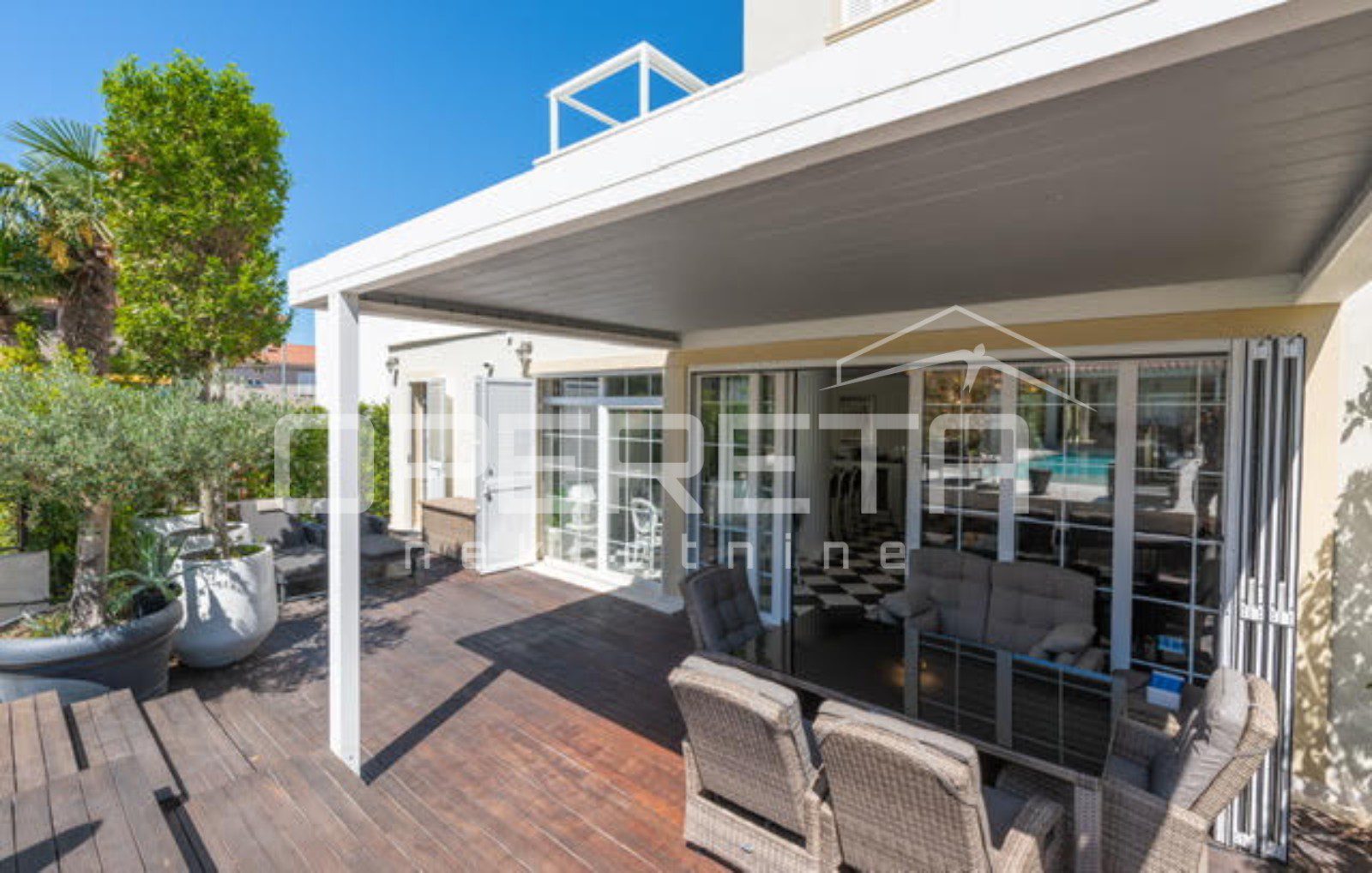 Natkrivena terasa uz bazen i sunčalište nadovezuje se na dnevni boravak i pruža maksimalan užitak boravka na otvorenom. Cijela kuća je klimatizirana i ima podno grijanje na sustav toplinskih pumpi.