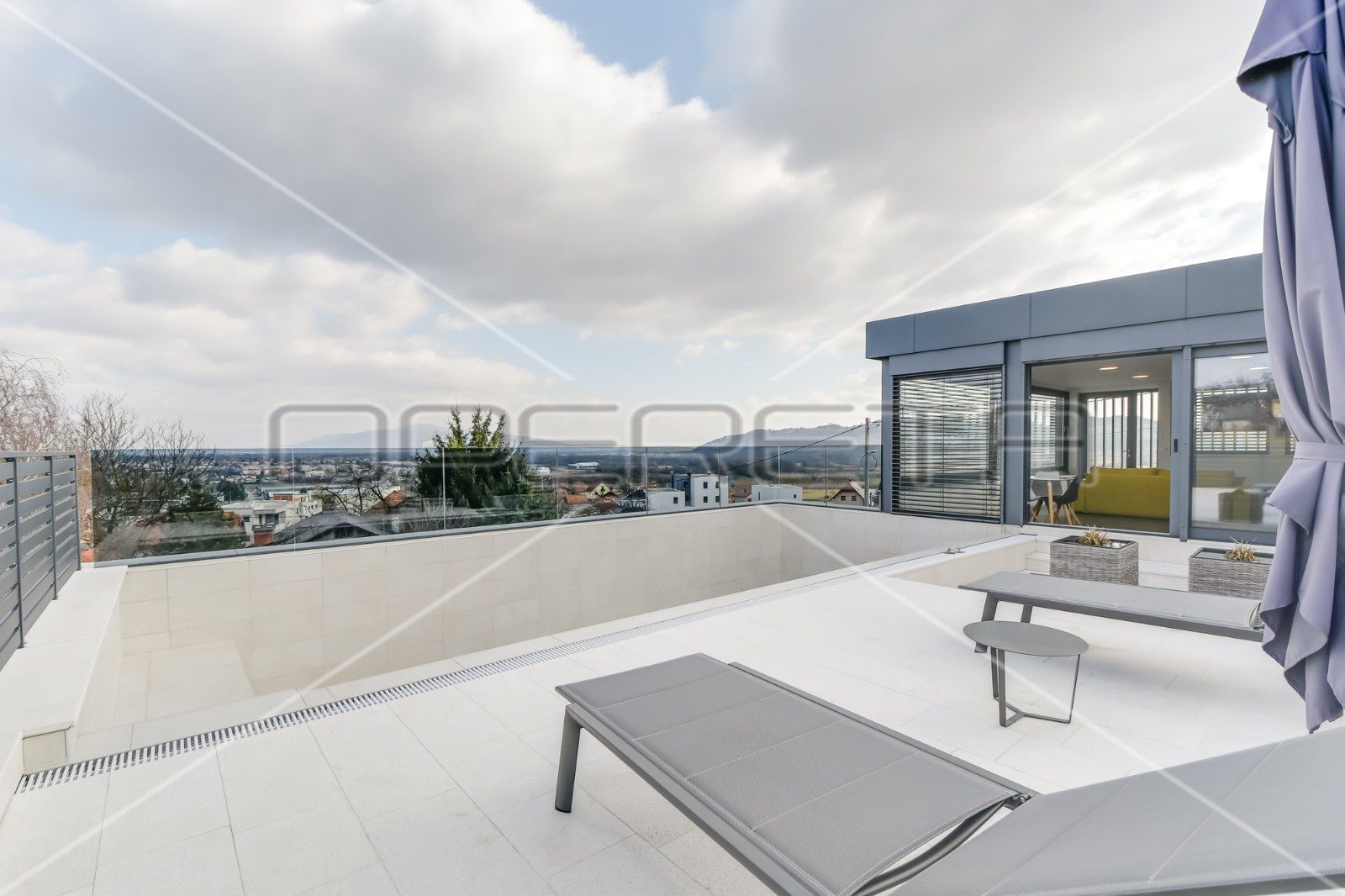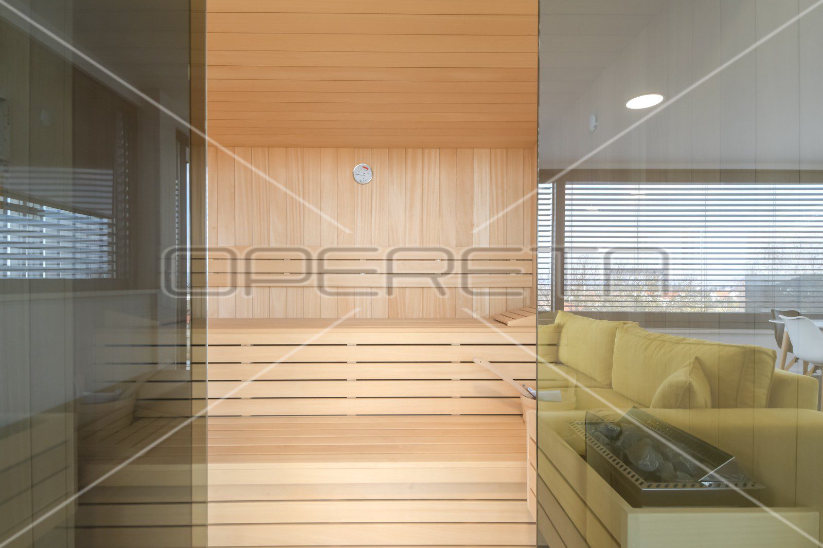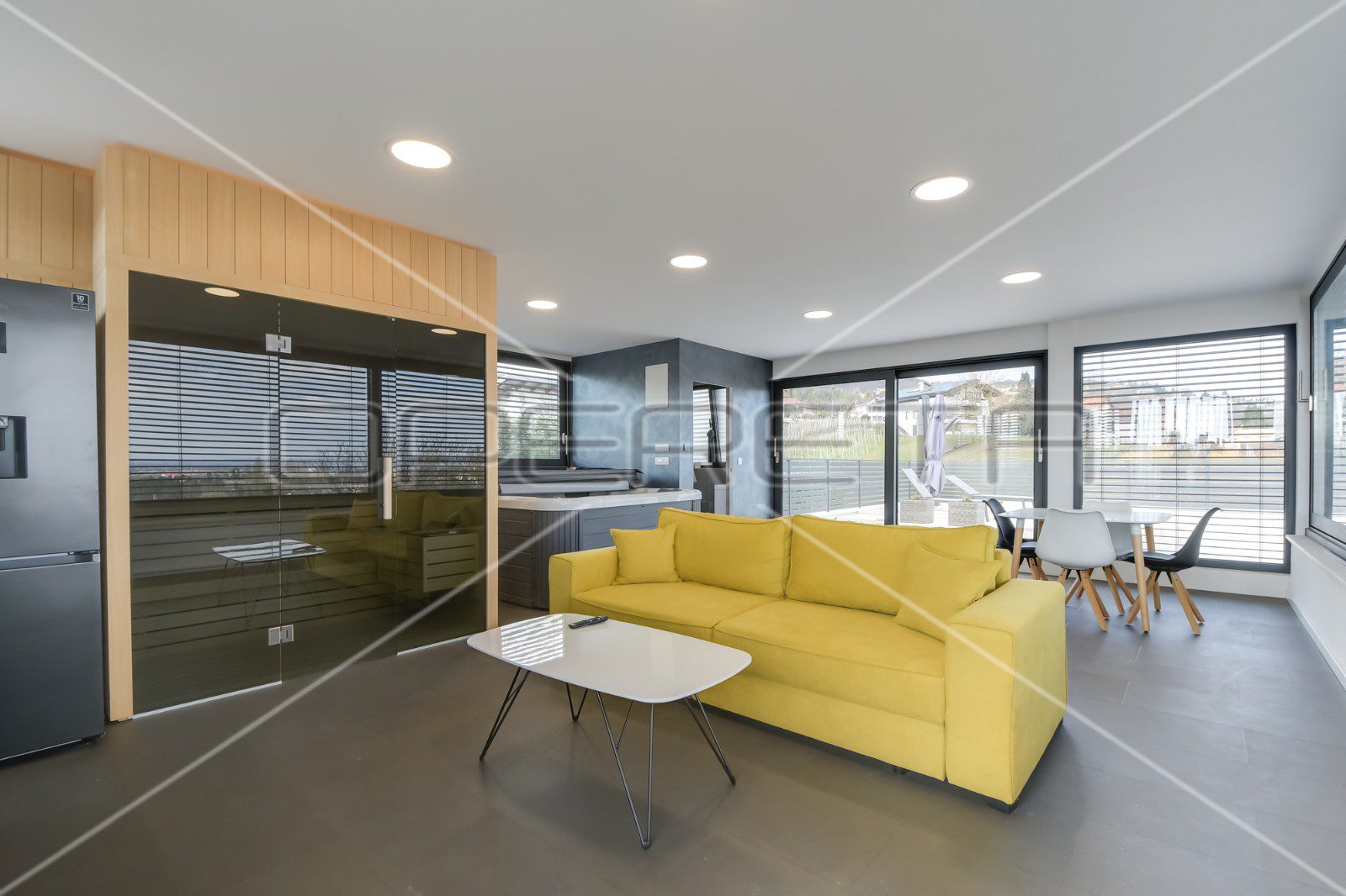 Dnevni boravak ima izlaz na terasu veličine od oko 50m2. Iz prizemlja se vanjskim stepenicama ide na kat gdje se nalazi spa zona sa saunom, jacuzzi, prostor za zabavu te kupaonica s tuš kadom. Iz spa zone se izlazi na otvoreni dio terase koja ima svoj lounge za sjedenje, sunčalište sa solarnim tušem i bazenom veličine 9x4m koji ima i svoju posebnu toplinsku pumpu za grijanje.