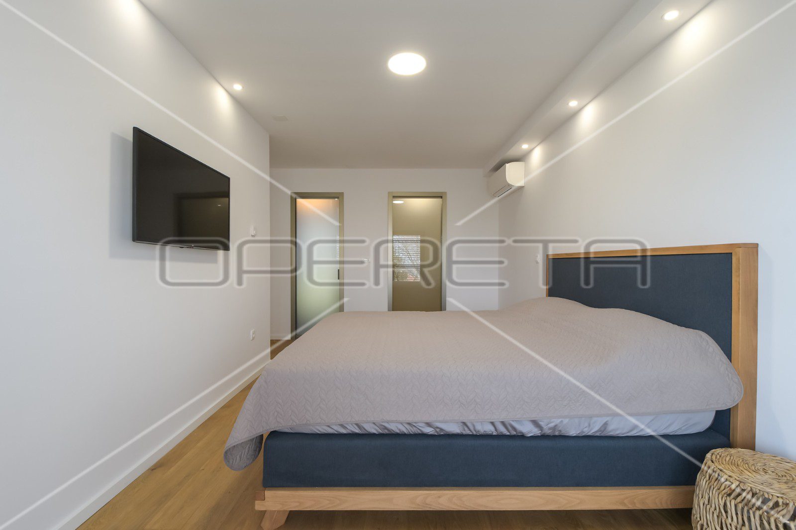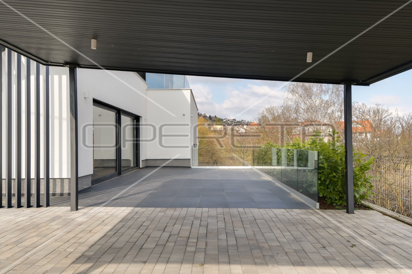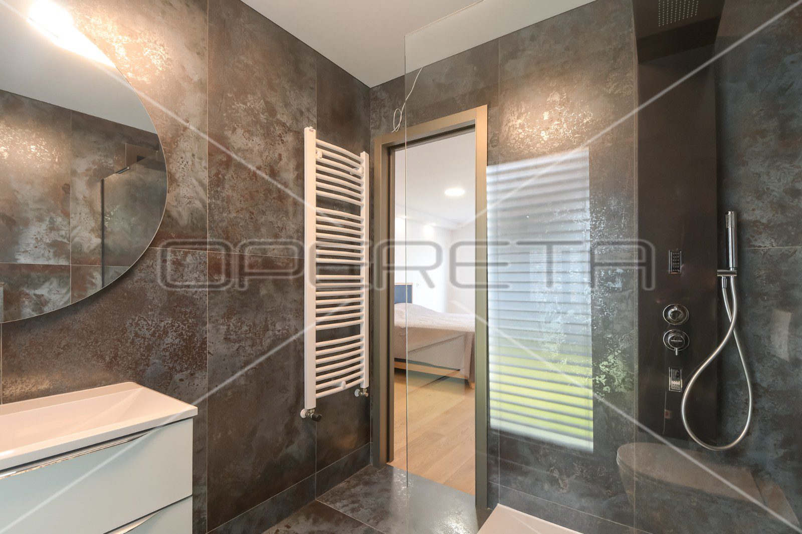 Dnevni boravak ima izlaz na terasu veličine od oko 50m2. Iz prizemlja se vanjskim stepenicama ide na kat gdje se nalazi spa zona sa saunom, jacuzzi, prostor za zabavu te kupaonica s tuš kadom. Iz spa zone se izlazi na otvoreni dio terase koja ima svoj lounge za sjedenje, sunčalište sa solarnim tušem i bazenom veličine 9x4m koji ima i svoju posebnu toplinsku pumpu za grijanje.