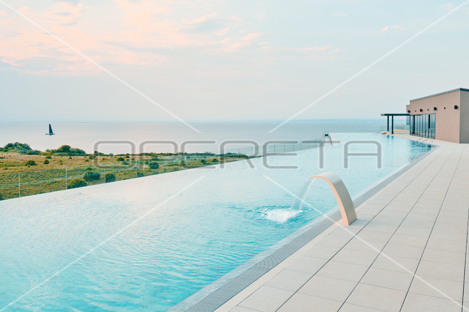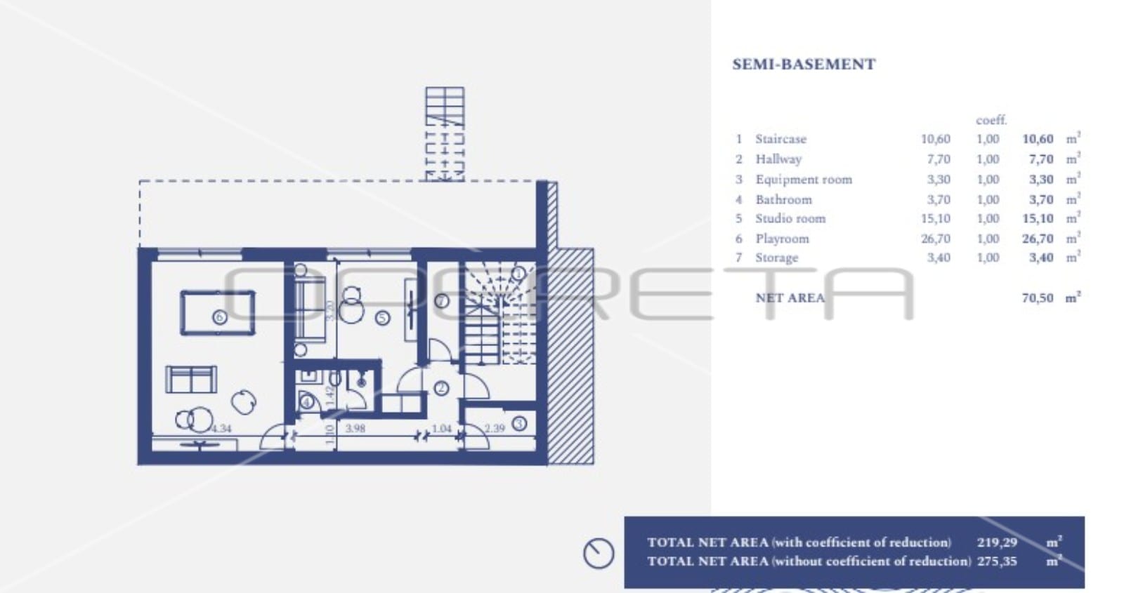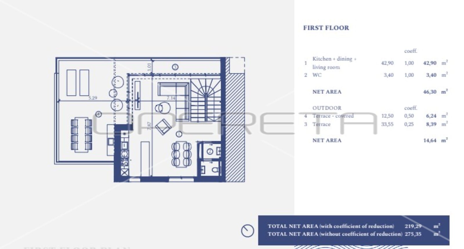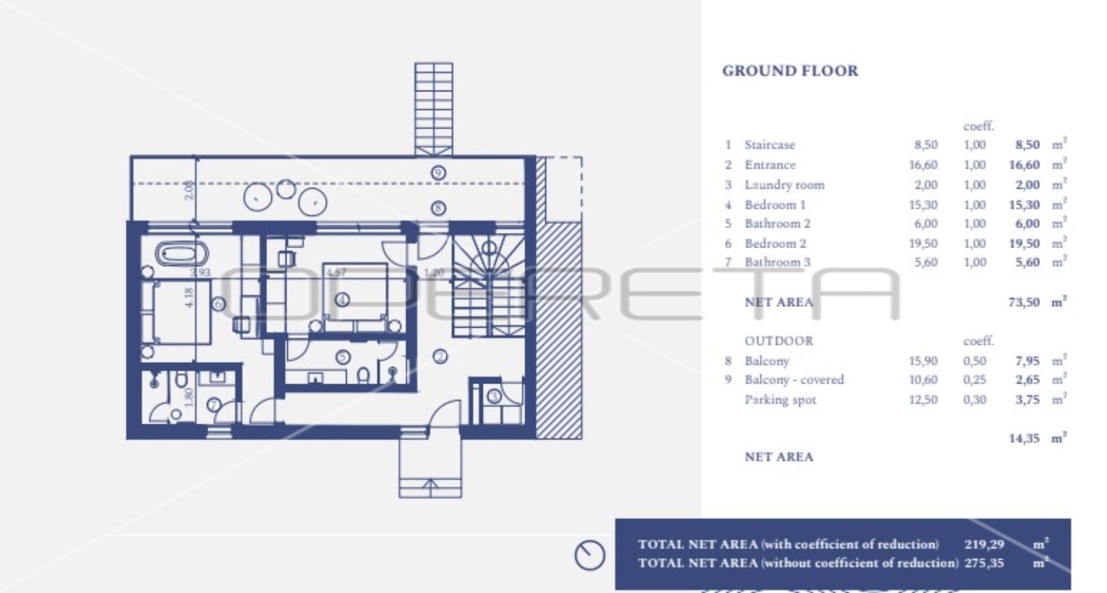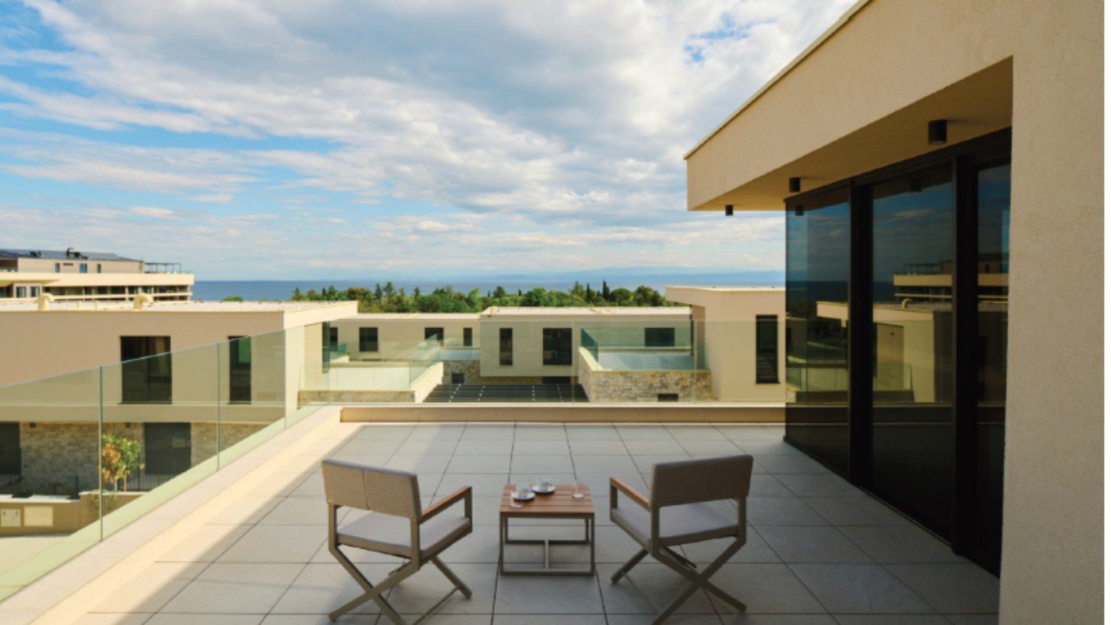 Luksuzna vila s pogledom na more u blizini plaže u Istri. Nalazi se unutar modernog turističkog Resorta s bazenom na krovu dugim 100m2, sadržajima poput golfa, spa i restorana. Unutar Resorta je dostupno je još nekoliko vila tipa 1 na 3 etaže sa južnim ulazom npr15. Sastoje se od RAZIZEMLJA (stubište, hodnik, kotlovnica, kupaonica, studio soba, igraonica, spremište), PRIZEMLJA (stubište, ulaz, vešeraj, dvije spavaće sobe, dvije kupaonice – vanjski dio: balkon, natkriveni balkon, parkirno mjesto), 1. KATA ( open space dnevni boravak sa kuhinjom i blagovaonicom – vanjski dio: terasa i natkrivena terasa).