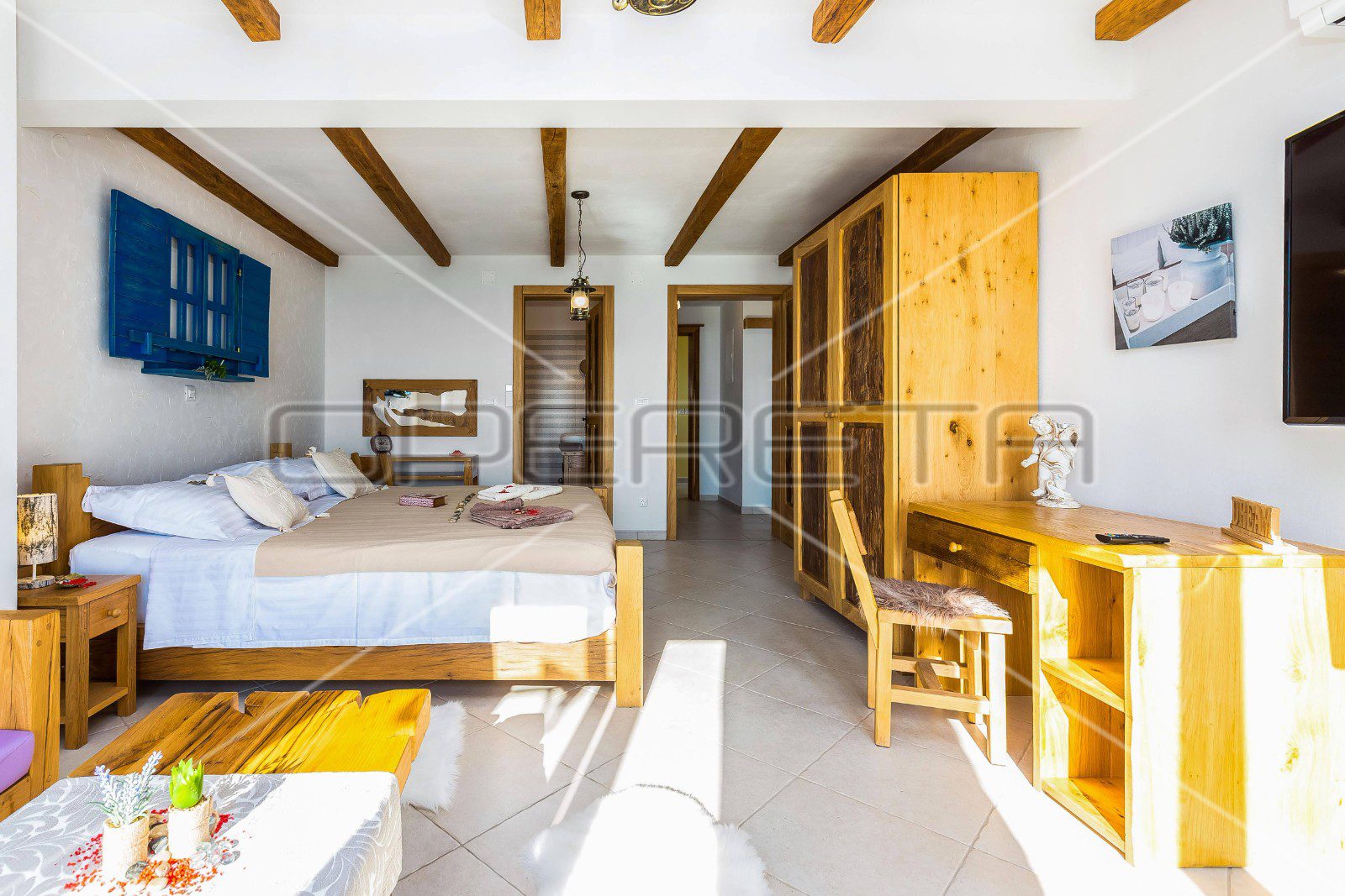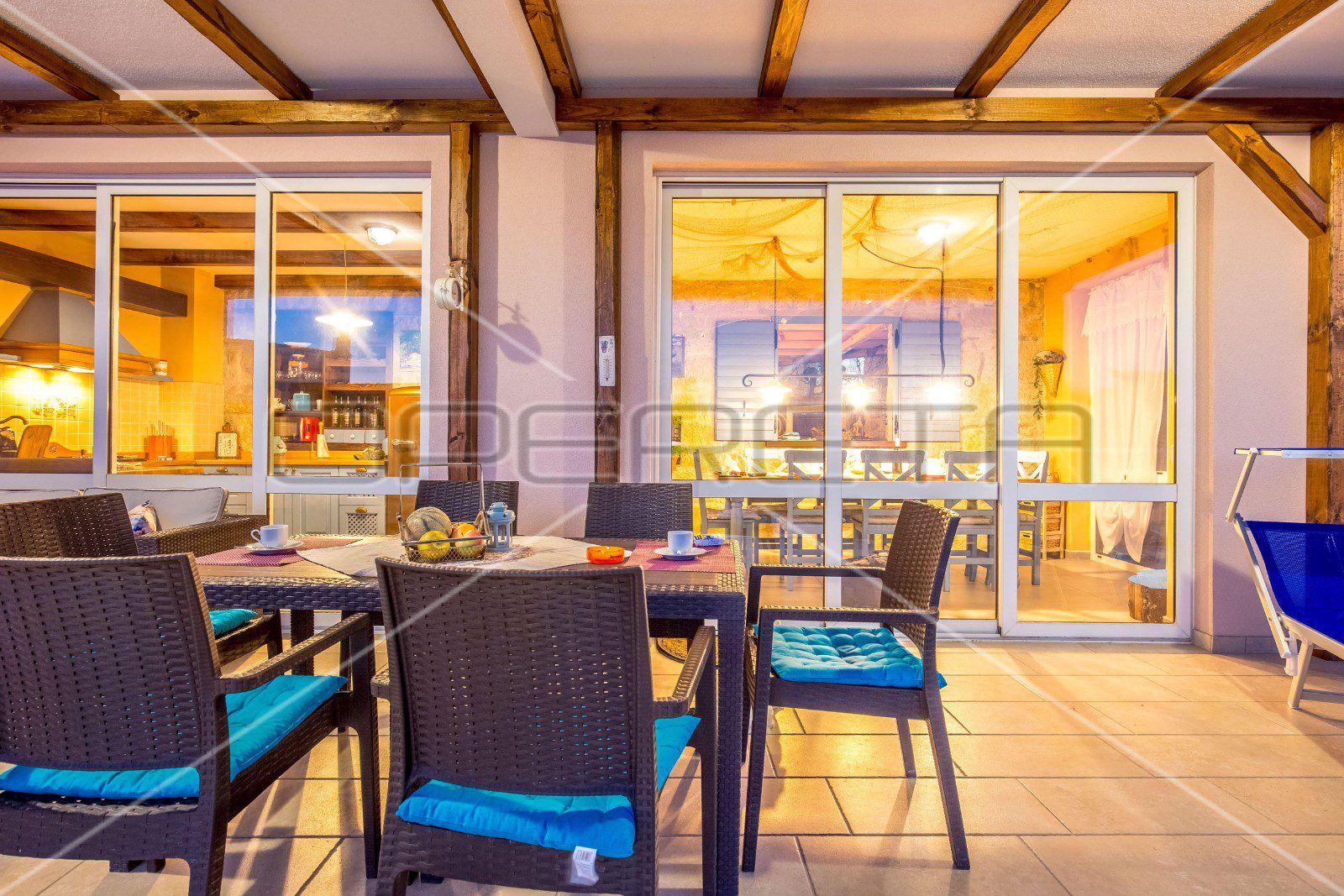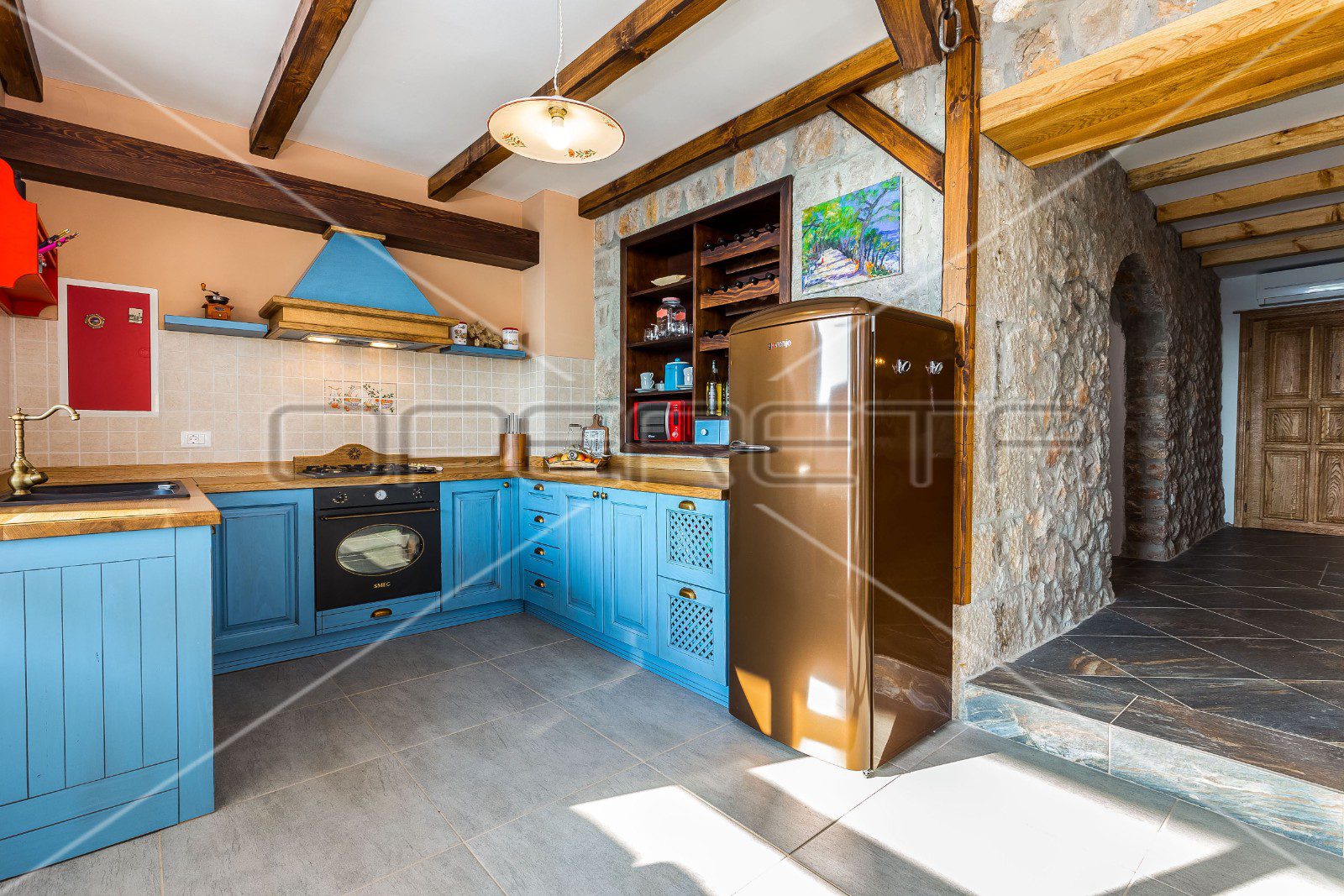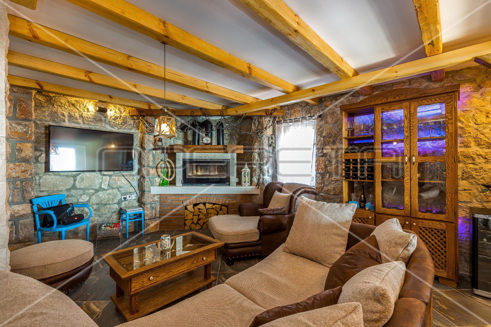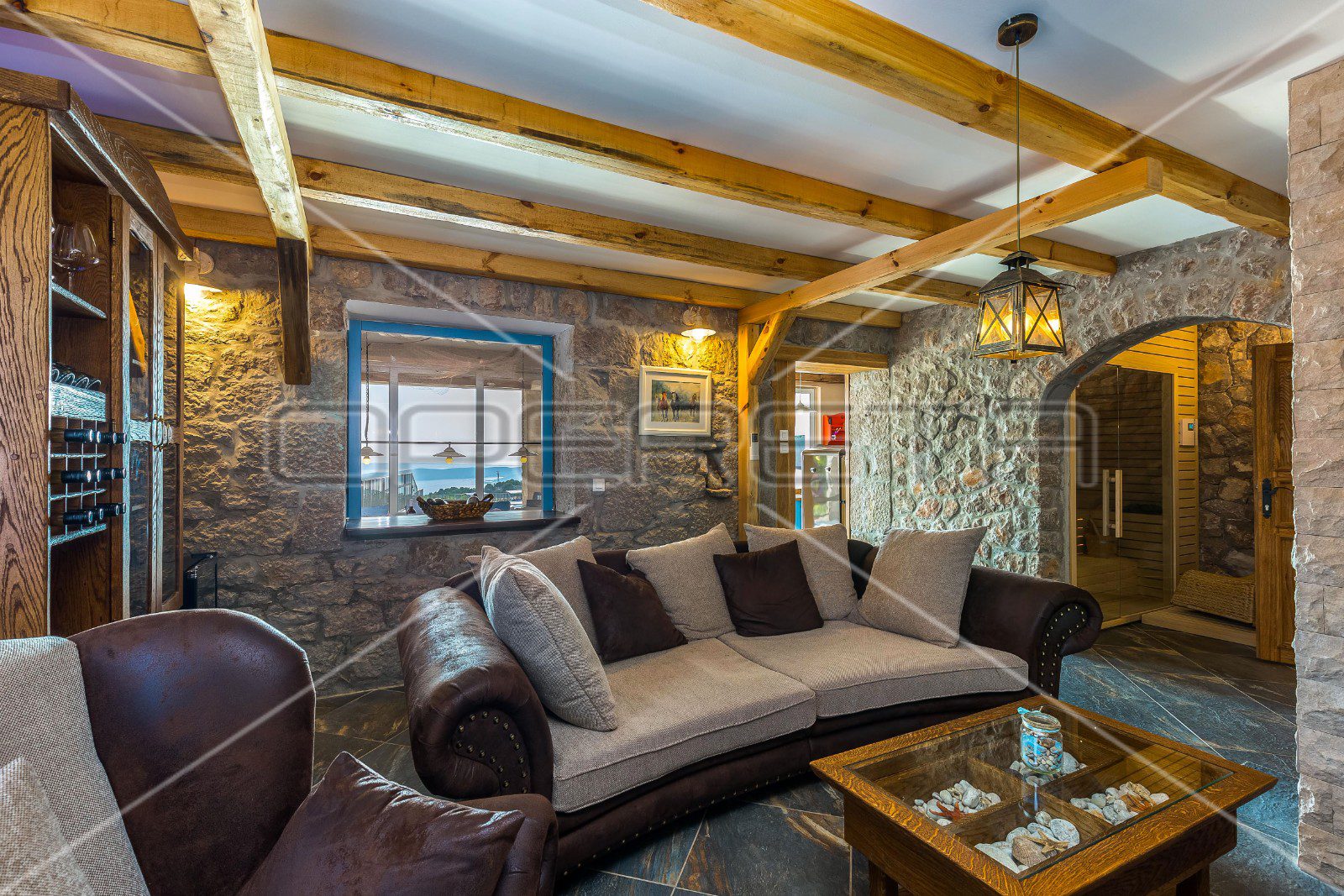 Prizemlje se sastoji od udobne kuhinje s blagovaonicom iz koje se izlazi na prostranu natkrivenu terasu s pogledom prema bazenu i moru. Iz blagovaonice se ulazi u veliki dnevni boravak uređen s kamenom i drvenim gredama s velikim kaminom.