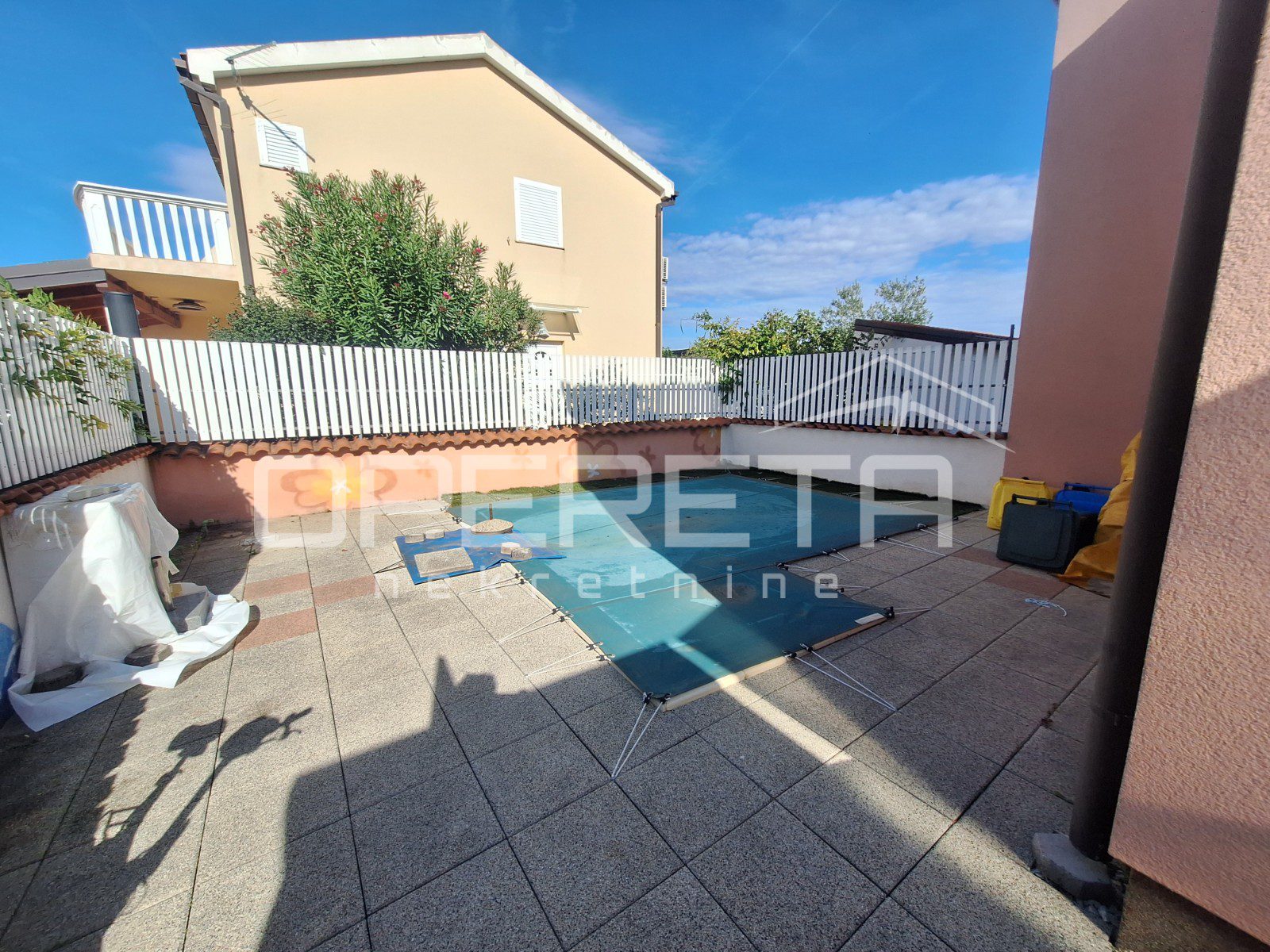 Dvorište je uređeno i funkcionalno – u stražnjem dijelu nalazi se bazen sa sunčalištem i spremištem, dok je ispred kuće vrt s jacuzzijem i dva parkirna mjesta.