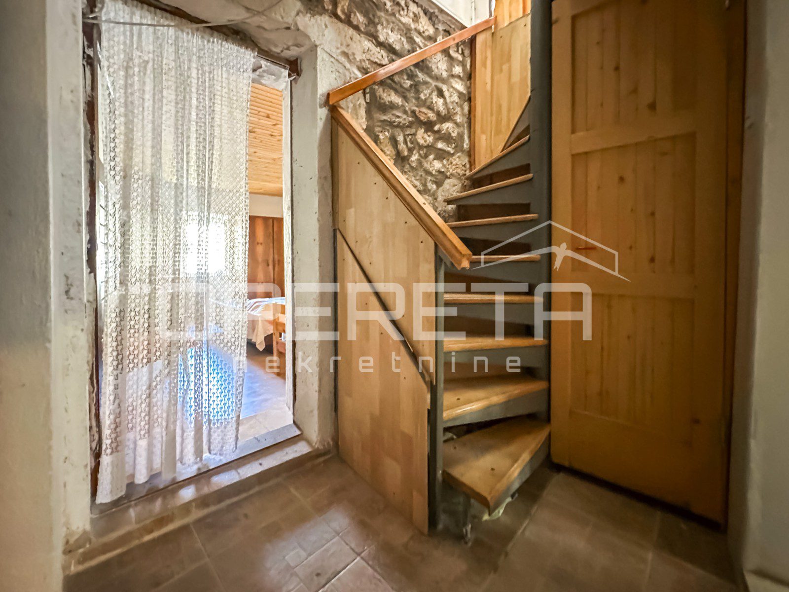 Kuća se prostire na tri etaže: prizemlje, prvi i drugi kat. U prizemlju se nalazi prostrani dnevni boravak, kuhinja s blagovaonicom te kupaonica . Unutarnje stepenice vode na prvi kat gdje su smještene dvije spavaće sobe i dodatno kupatilo.