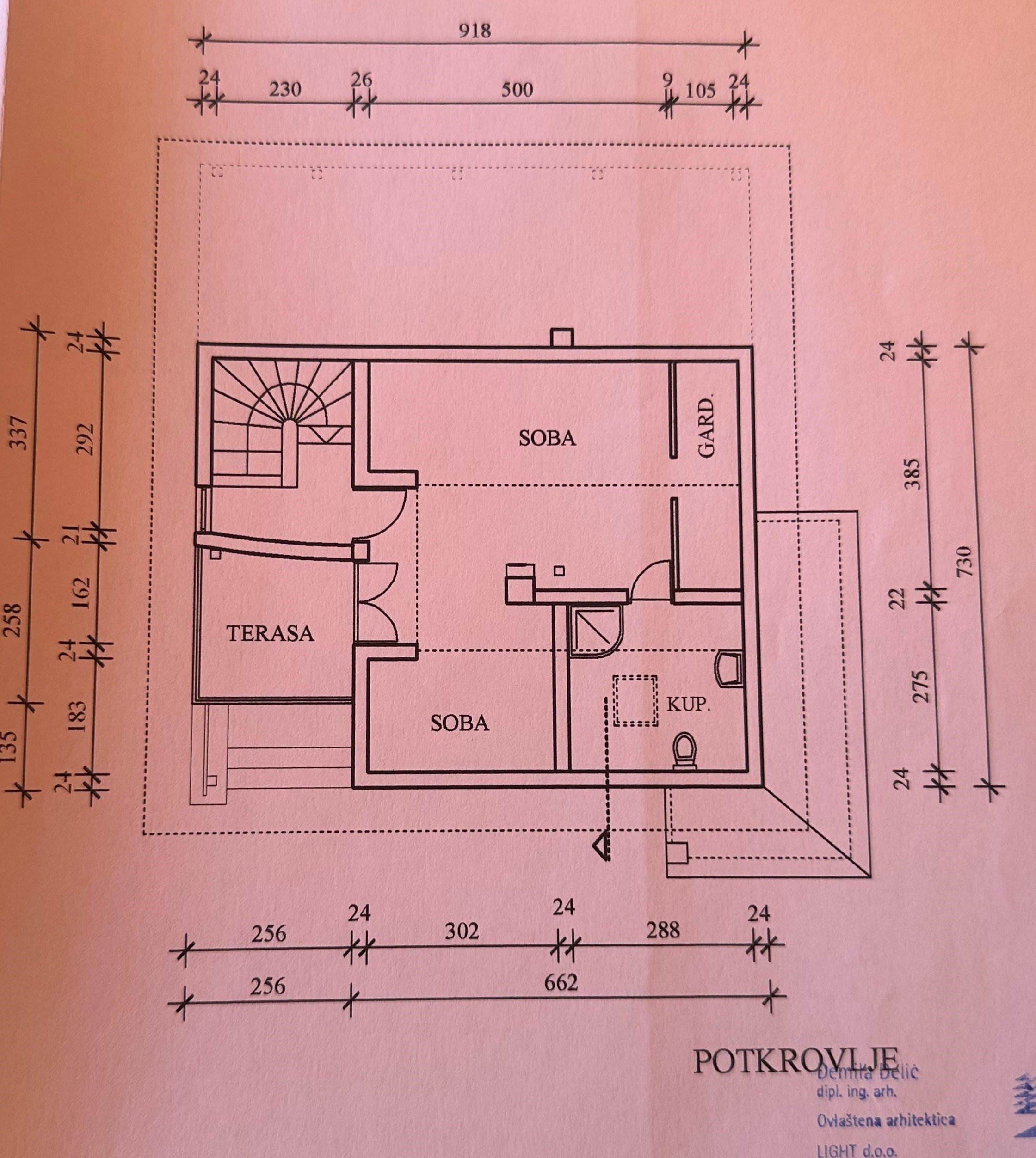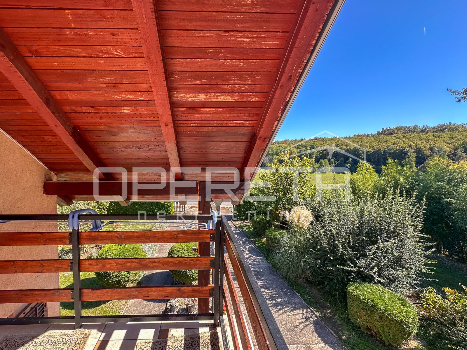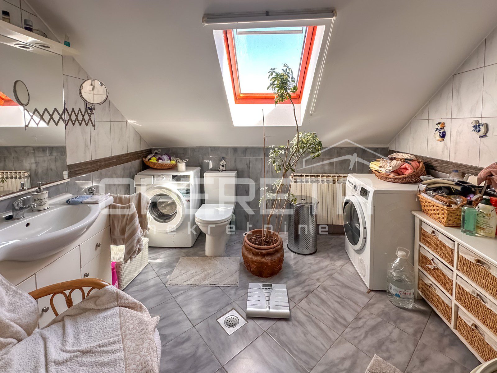Na katu se nalazi prostrana spavaća soba, dodatni kutak uređen kao radni prostor te garderoba smještena u ugradbeni ormar. Velika kupaonica s krovnim prozorima pruža osjećaj prostranosti i svjetlosti, a s kata se izlazi i na balkon.
