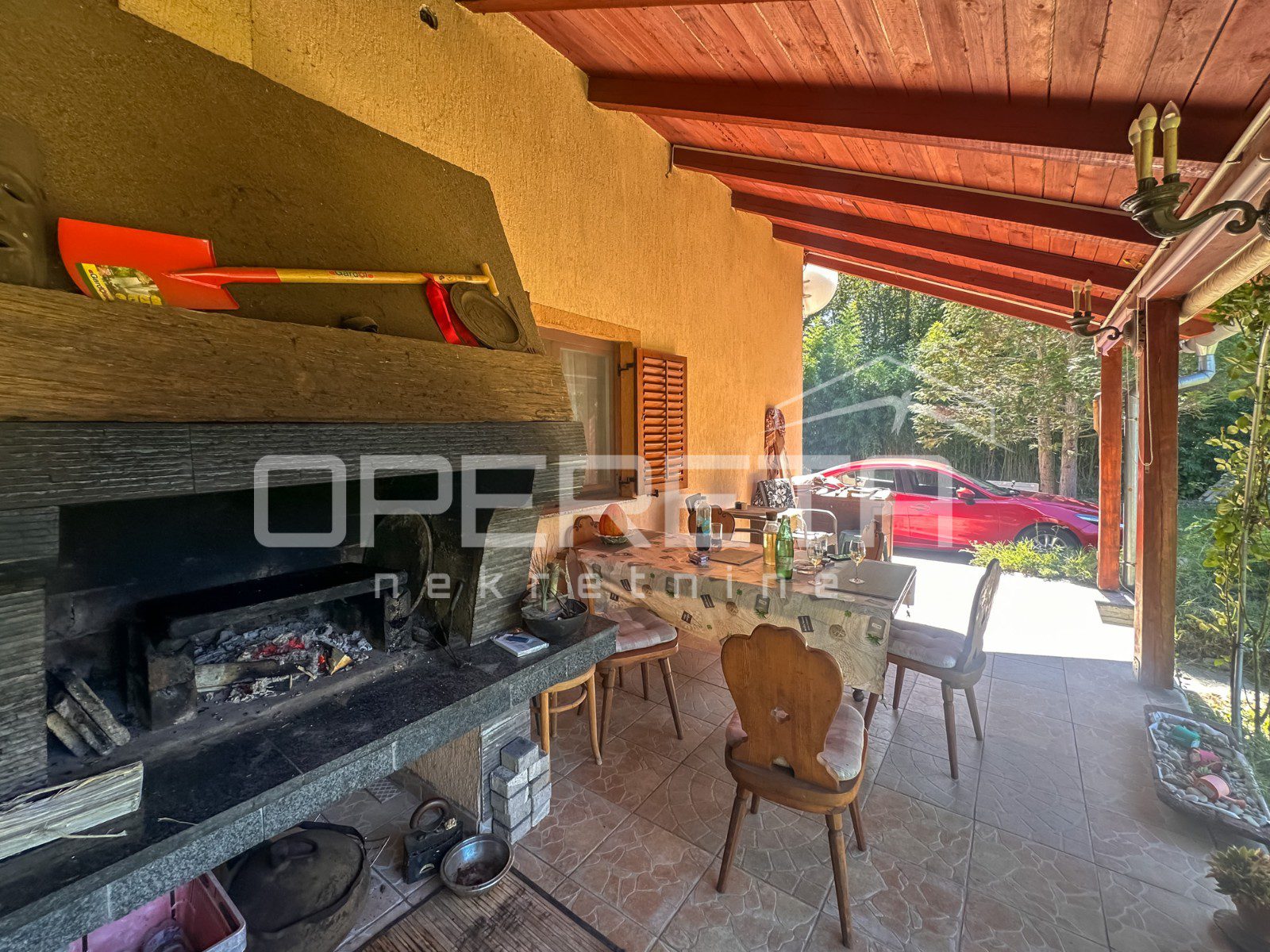 Okućnica je uređena jednako pažljivo kao i interijer. Uz kuću se nalazi terasa s ljetnom kuhinjom i zidanim roštiljem, pogodna za druženja tijekom toplih dana. Iza kuće smješten je podest predviđen za jacuzzi, sada korišten kao sunčalište, te kamenjar s potočićem.