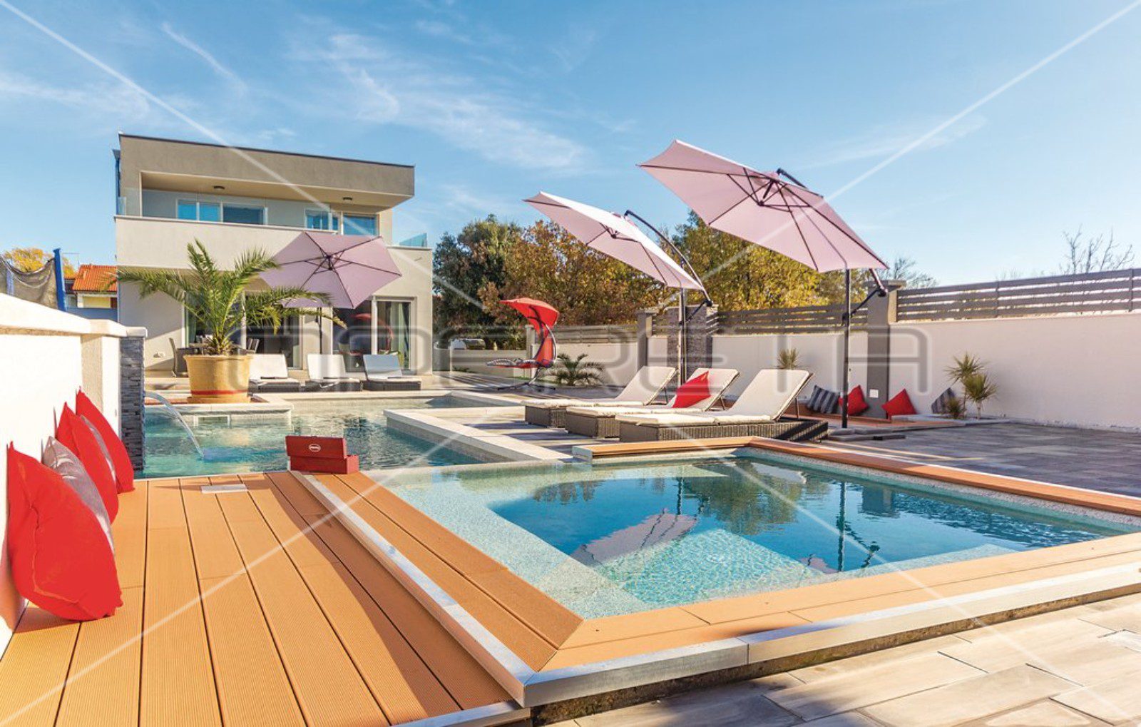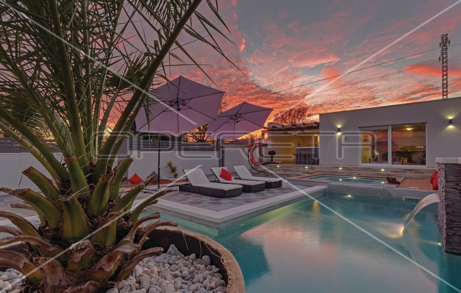 Također, na okućnici se nalazi se bazen od 40 m2 s jacuzzi-em, sunčalište, vanjski tuš, dječji park, stol za stolni tenis, trampolin.