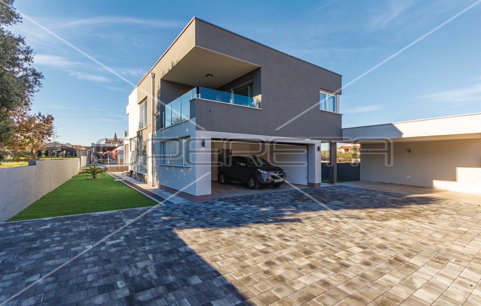 Vila se nalazi u jednoj od najzanimljivijih i turistički najatraktivnijih općina u Istri, na samo 4 km od plaže. U prizemlju kuće nalaze se ulazni hodnik, prostrani dnevni boravak koji je spojen s kuhinjom i blagovaonicom, zona za opuštanje, kupaonica i ostava. Vila ima i garažu od 35 m2 iz koje se može ući u prizemlje objekta.