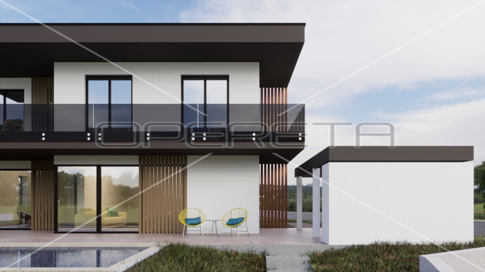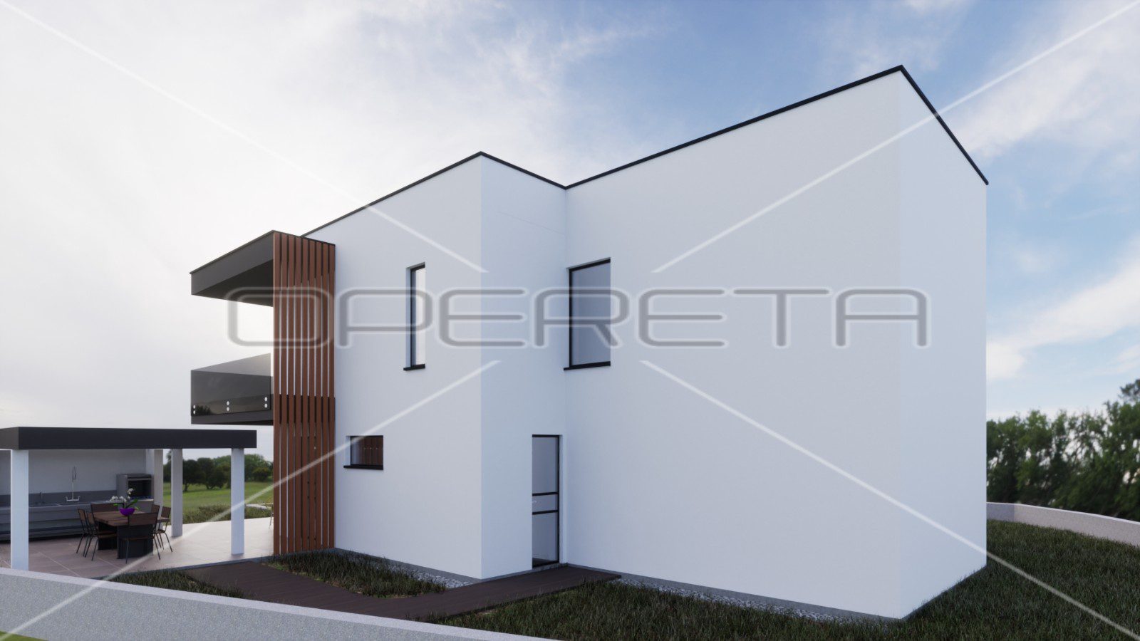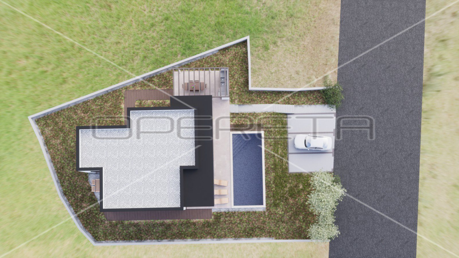 Za zemljište se razvio idejni projekt za modernu kuću s pomoćnim objektom koji služi kao vanjska kuhinja, s bazenom i parkiralištem za 3 automobila.