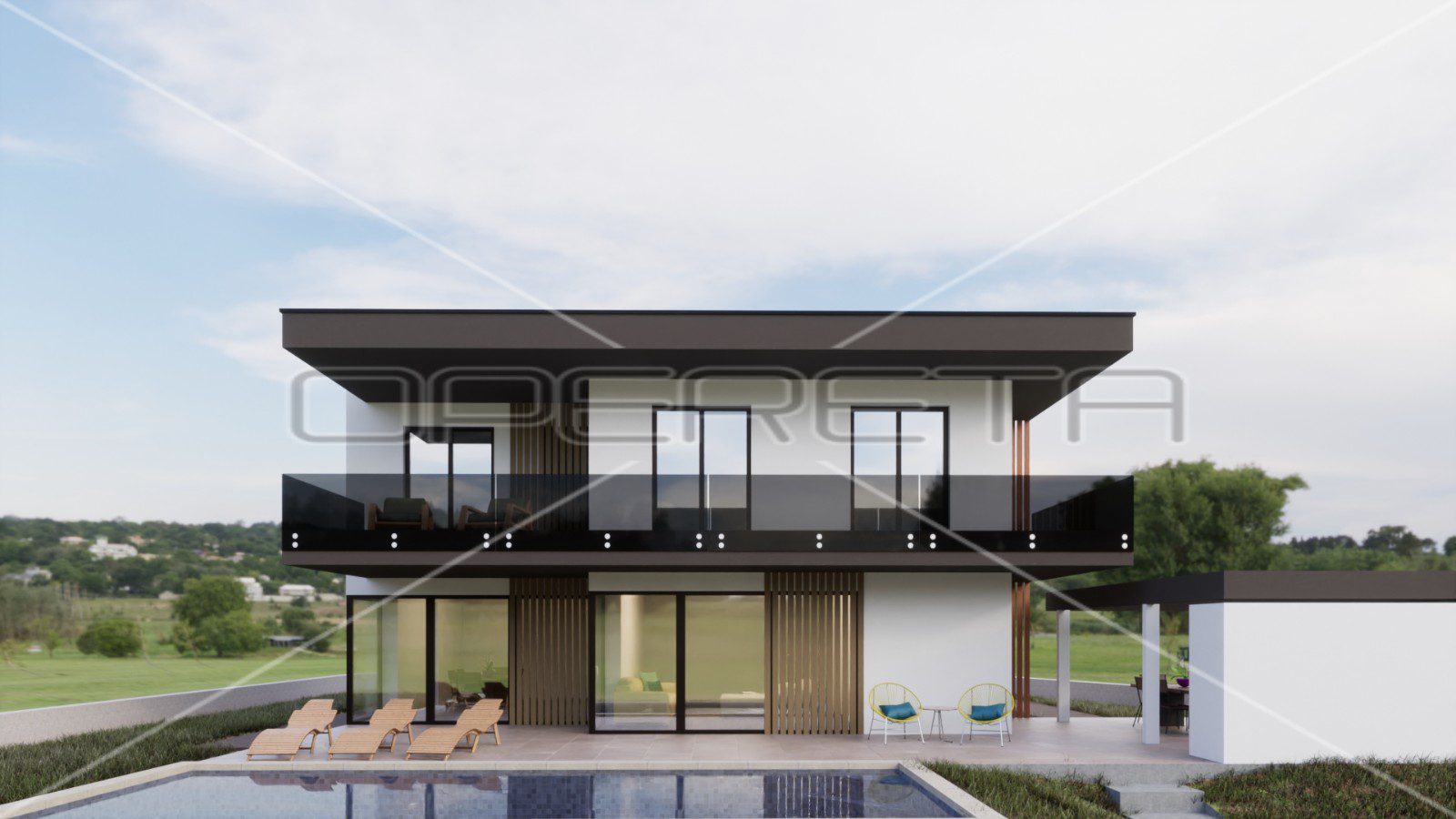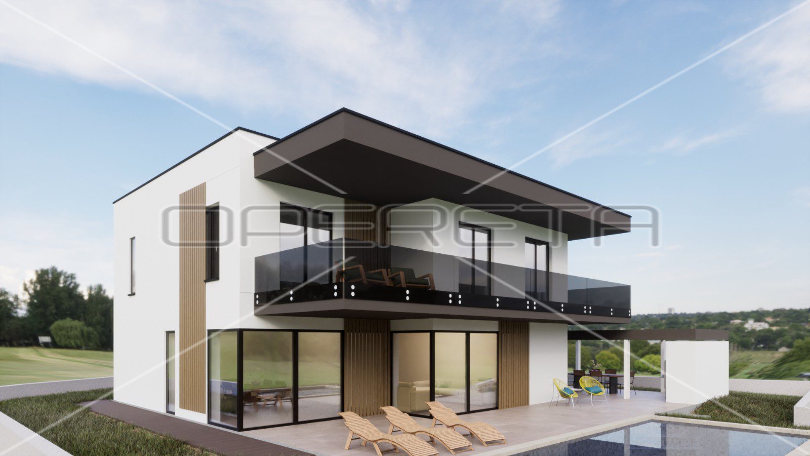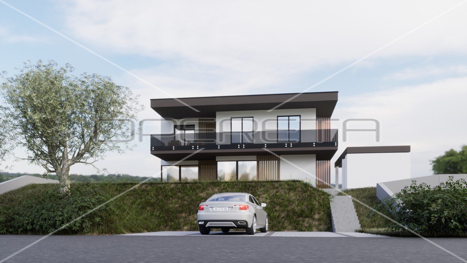 Za zemljište se razvio idejni projekt za modernu kuću s pomoćnim objektom koji služi kao vanjska kuhinja, s bazenom i parkiralištem za 3 automobila.